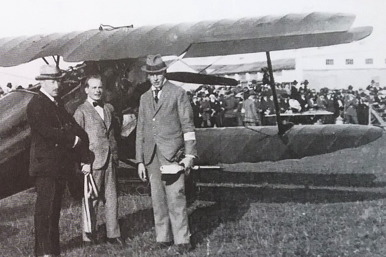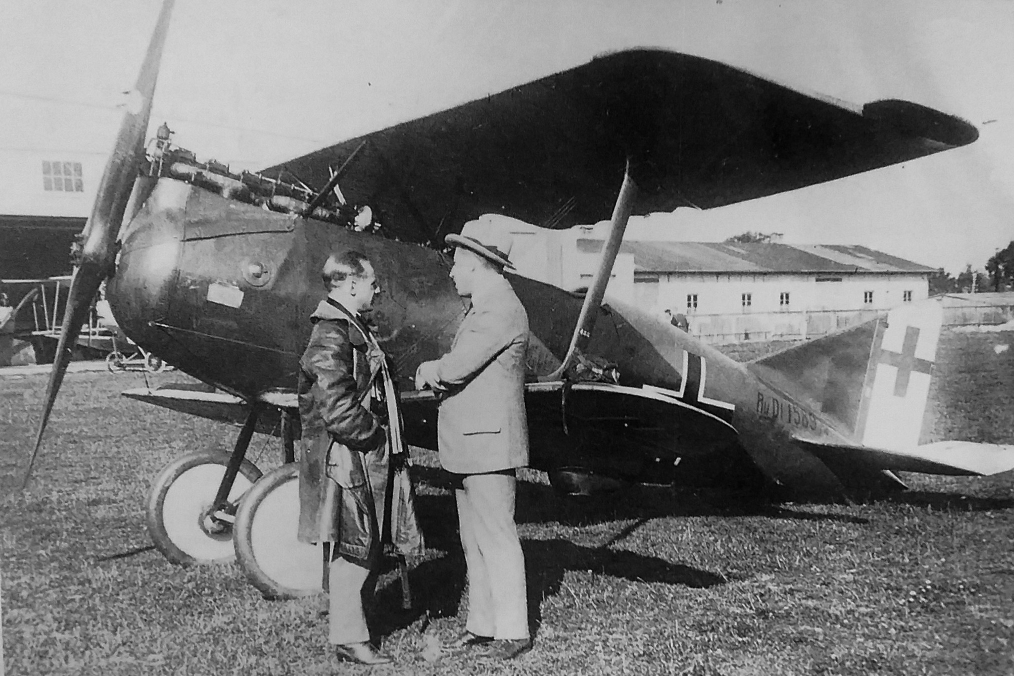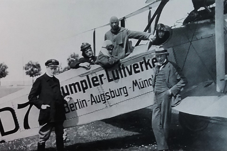 "Vortreffliche Leistung": Werksdirektor Otto Meyer vor der in Augsburg gefertigten Rumpler C IV/D 100 - 1917 (Deutsches Museum: "Persönlichkeiten Männer Rum-Rze")