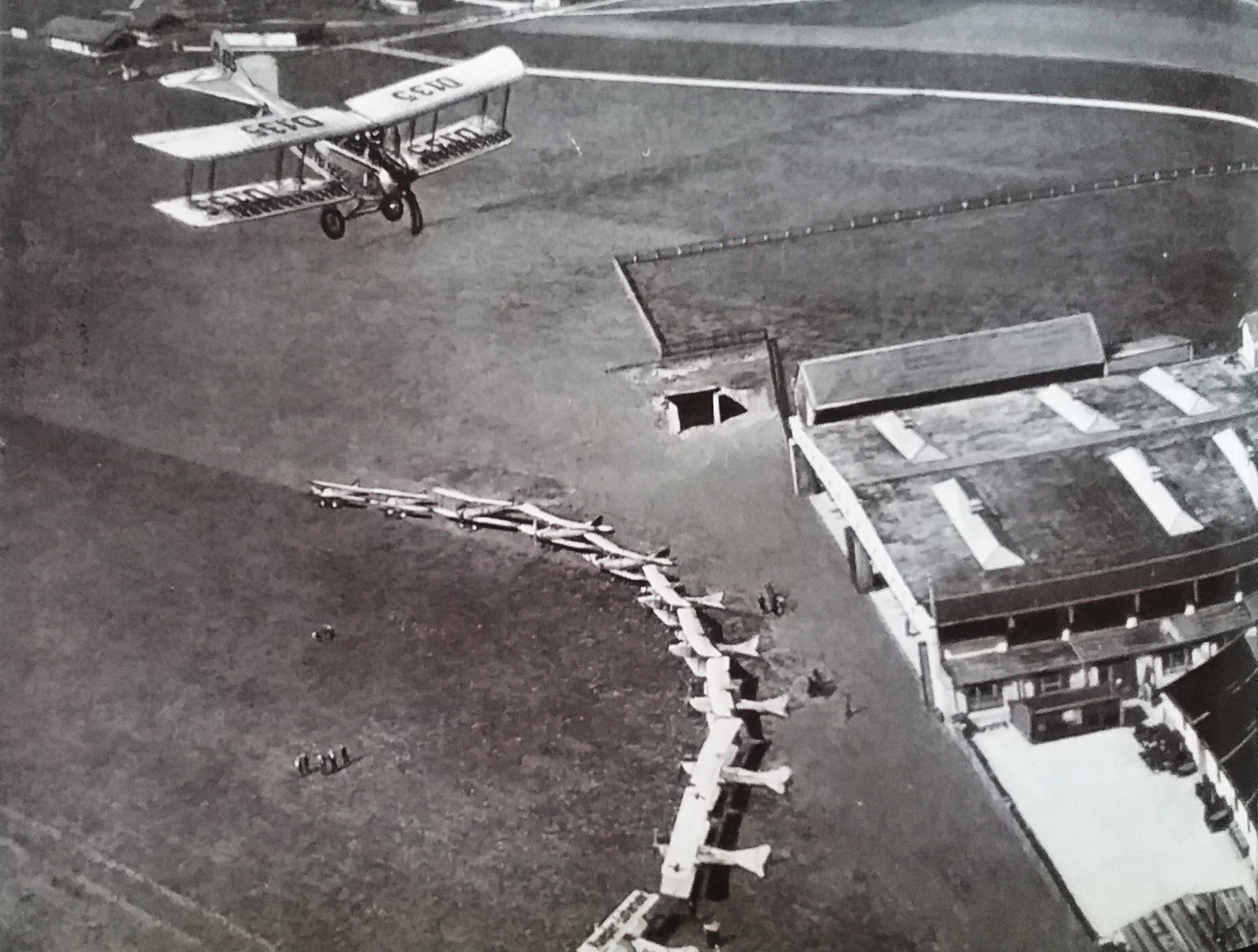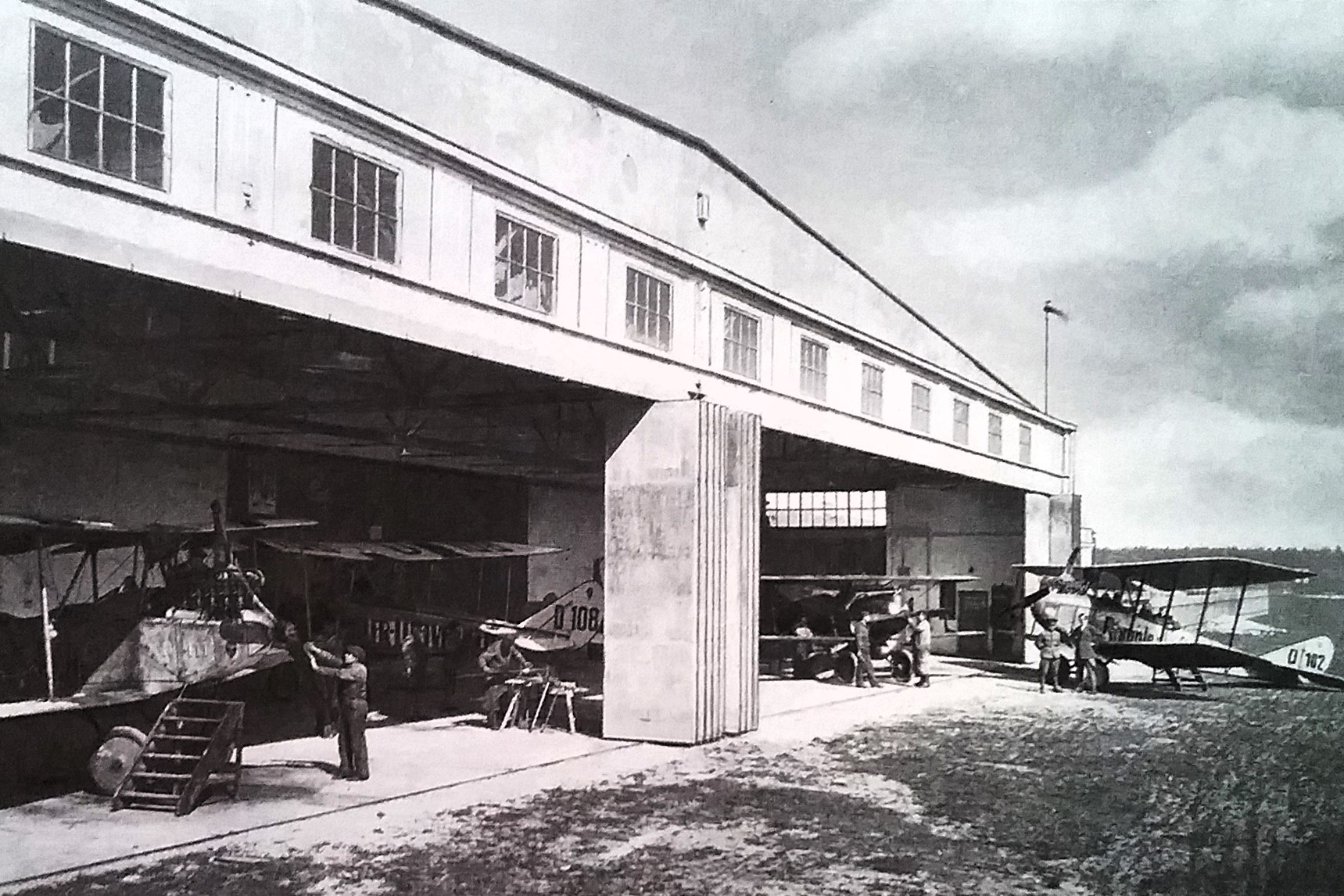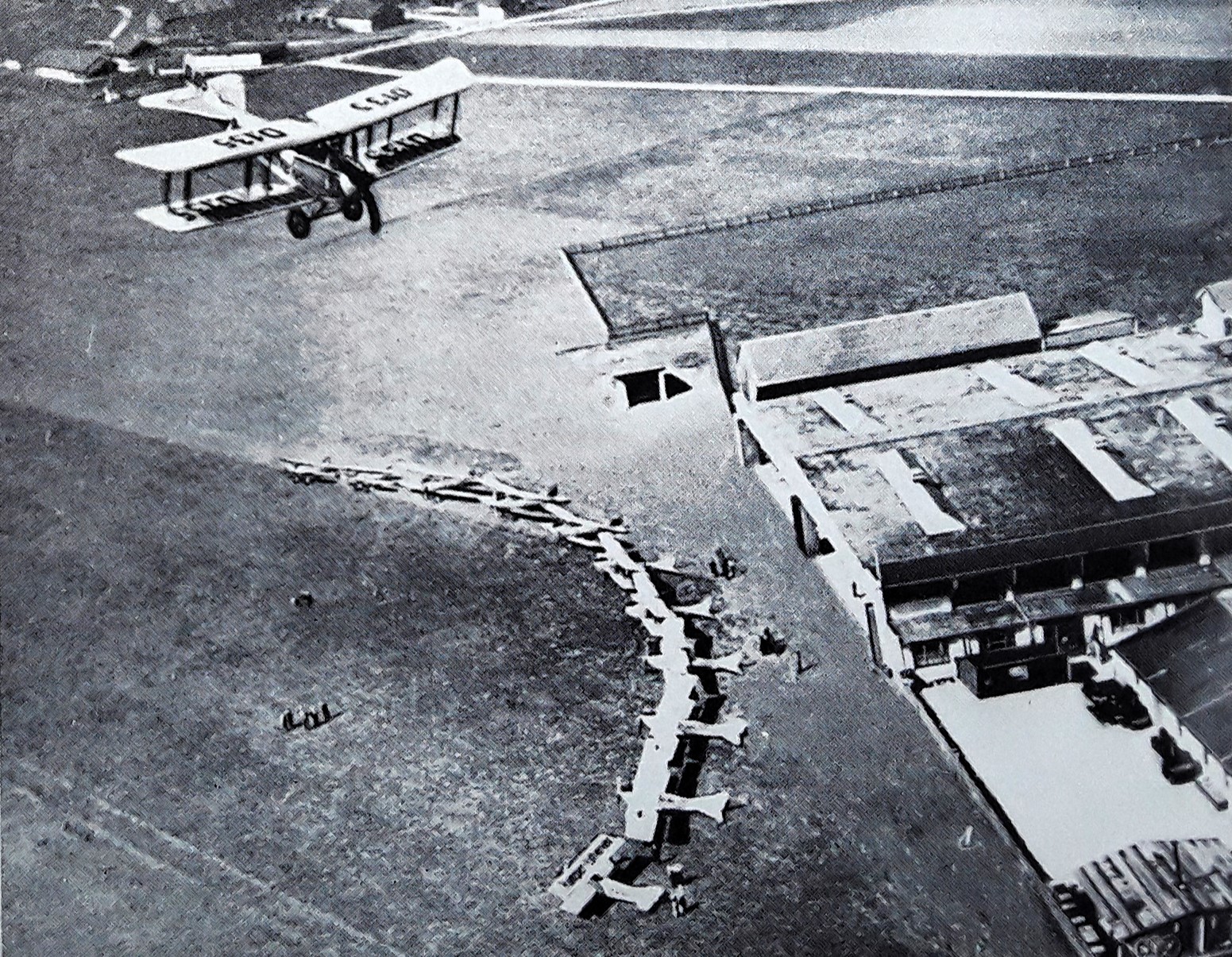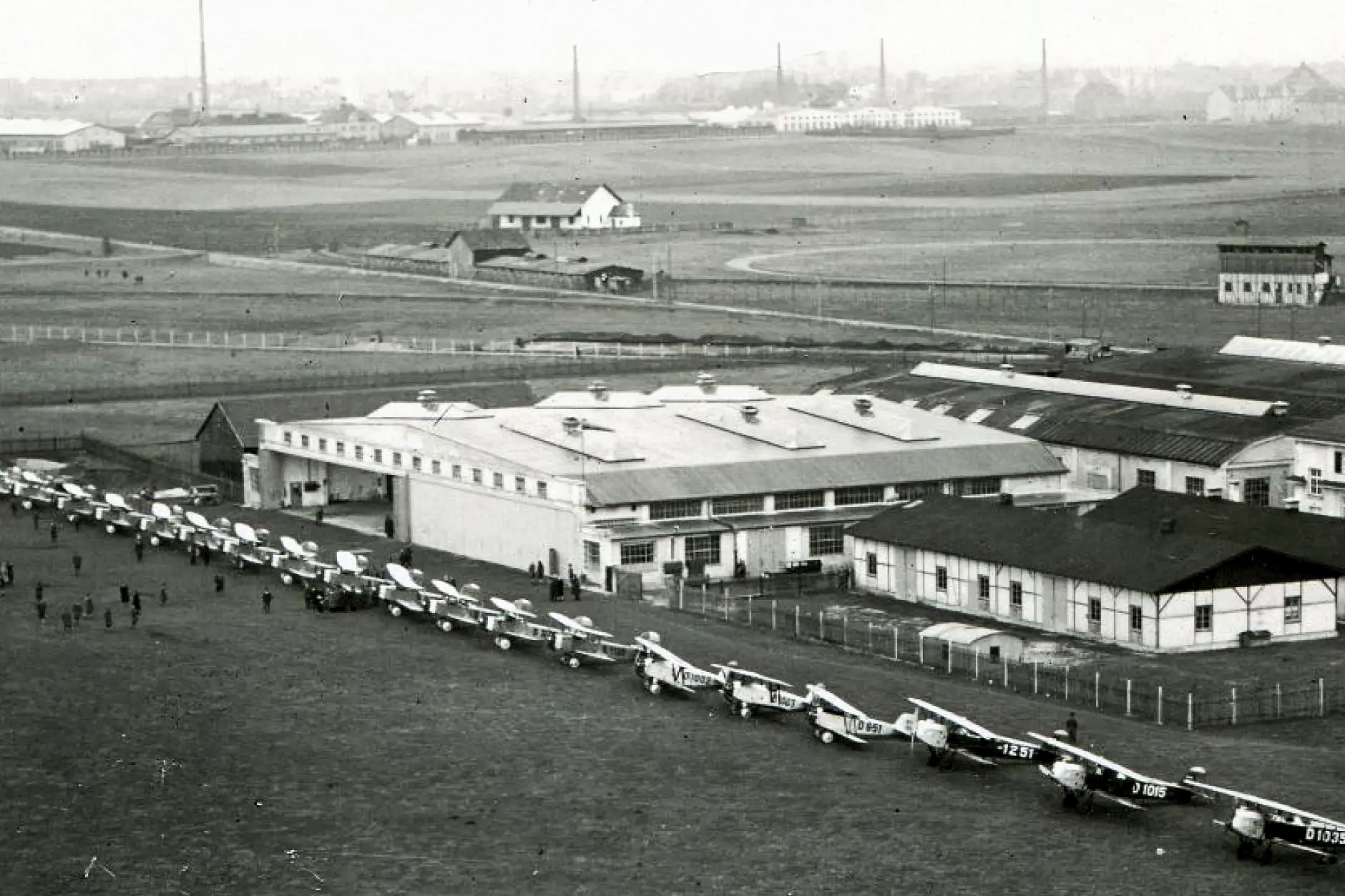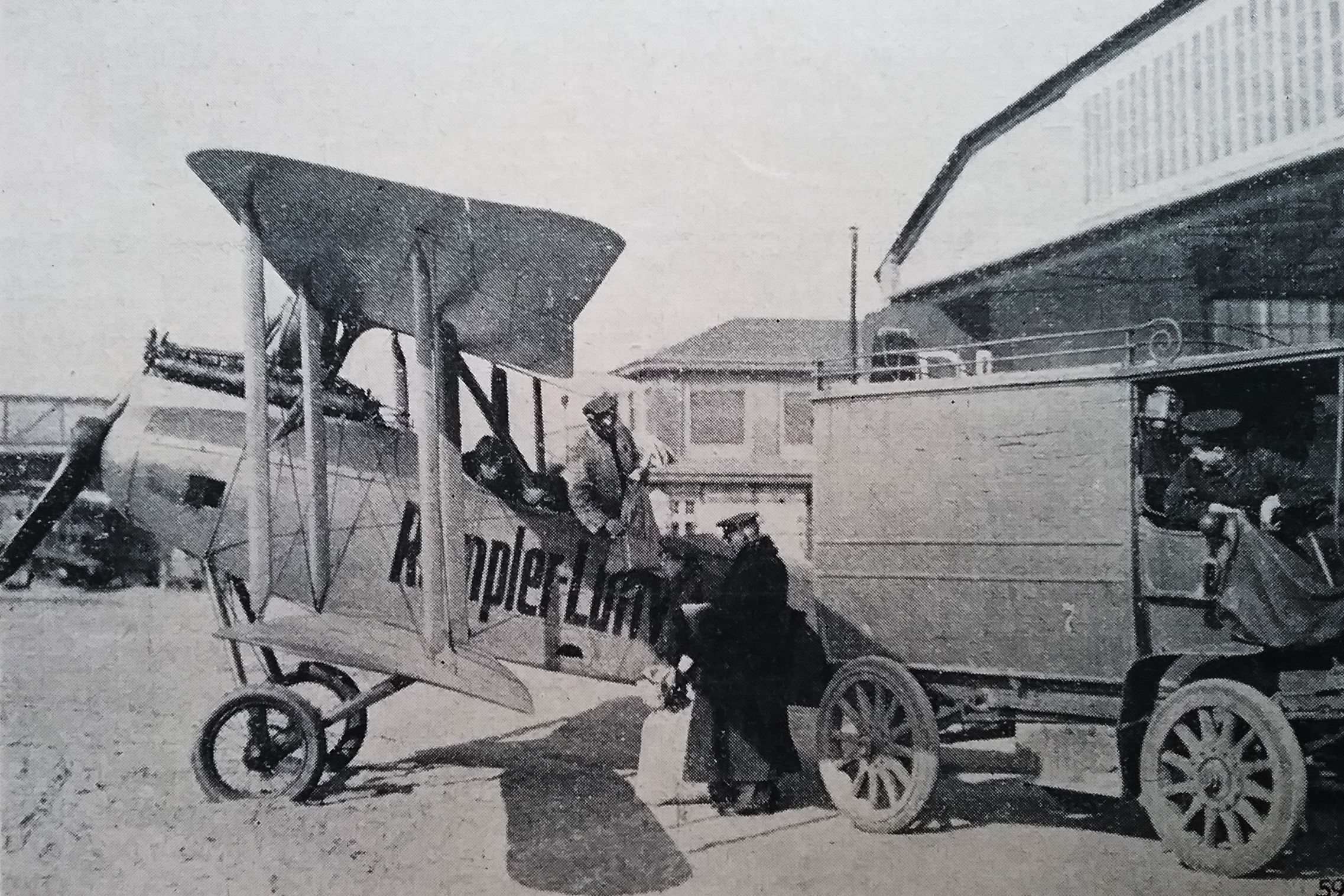 Populäre Entwicklung mit militärischem Nutzen: Edmund Rumplers Luftfahrzeugbau in Berlin Johannisthal - 1914 (Postkartenvertrieb Willi Sanke, Berlin + Wikimedia Commons - Datei: FlugplatzJohannisthal RumplerWerke SankePostkarte243.png + Nowarra: "60 Jahre Deutsche Verkehrsflughäfen", S.9 -1969)