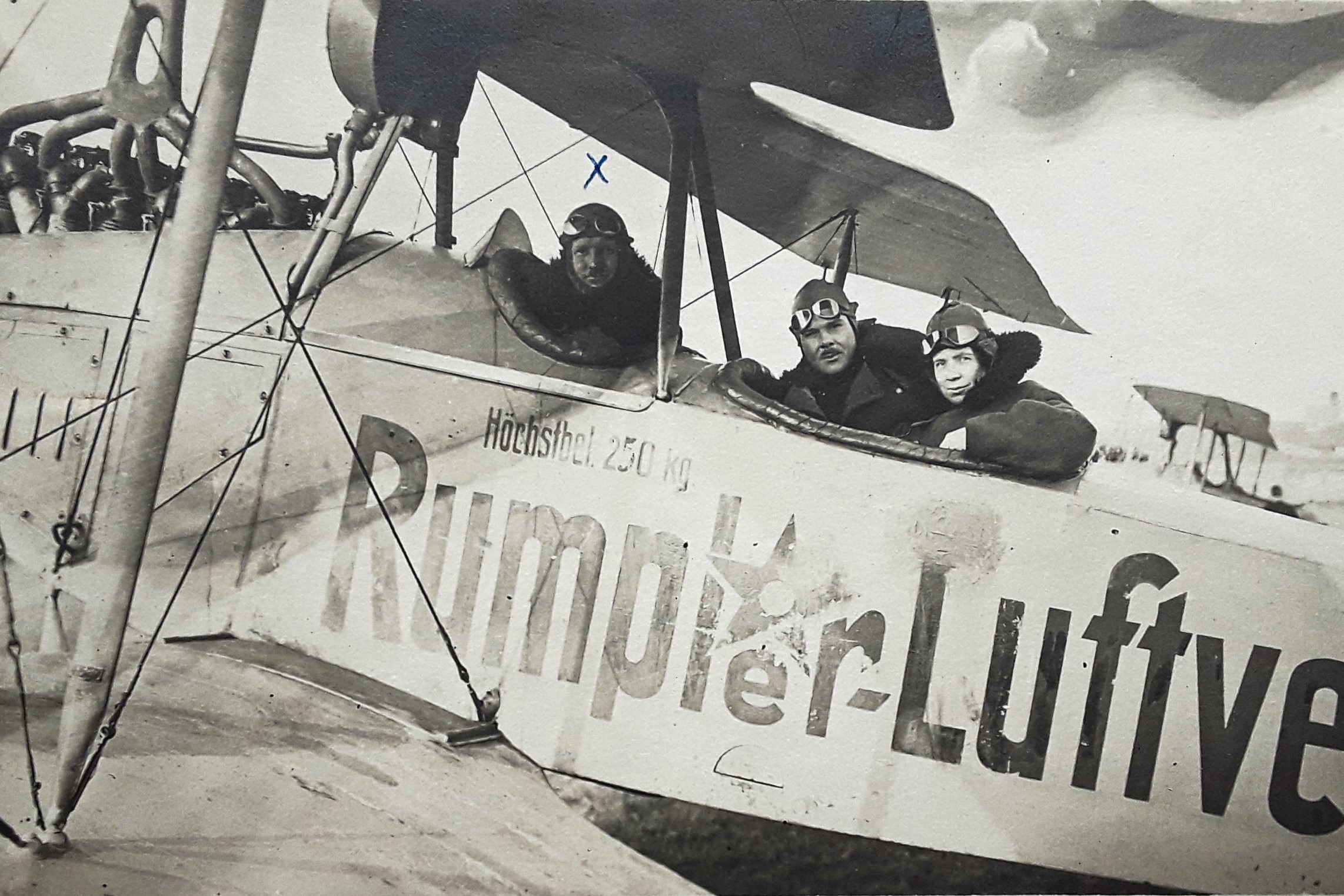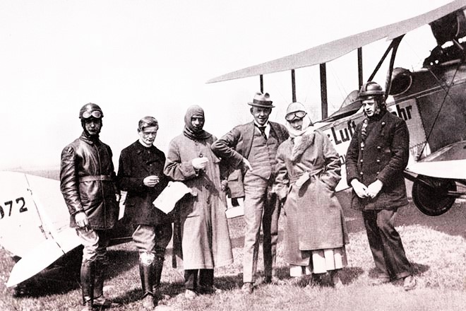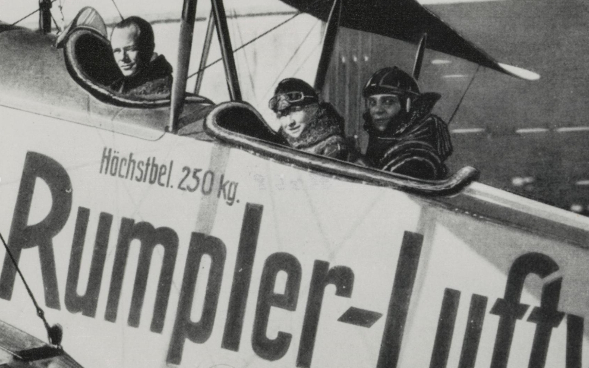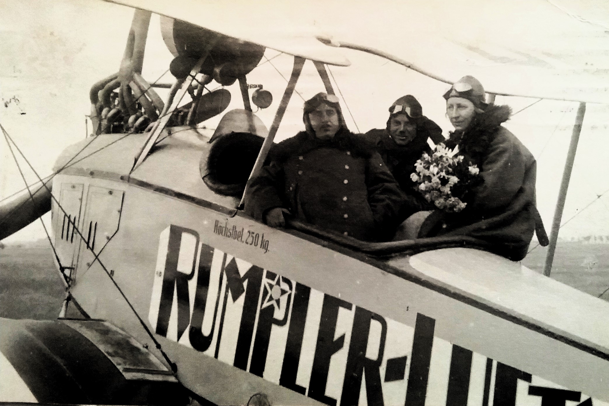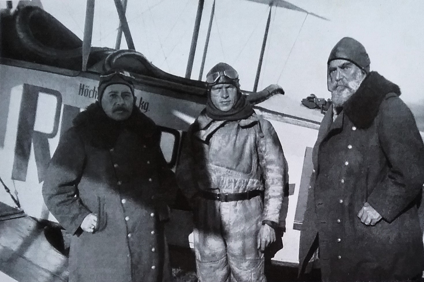 Dichter Gerhart Hauptmann (m/l) zwischen dem Piloten und dem Flugzeugkonstrukteur Edmund Rumpler bei seinem ersten Flug mit Sohn Benvenuto (r) - angeblich 1913, jedoch wohl eher 1916/17 (Deutsches Museum: Akt 00148-01 - Persönlichkeiten/Männer, Rum-Rze + Rumpler: "10 Jahre deutsche Flugtechnik", S.6 - 1918/19 + Frankfurter Illustrierte / Stöcker + Ullstein-Bilderdienst, Berlin + Hering: "Gerhart Hauptmann", S.32 - 1956 + gettyimages.de: Bild 537157263)