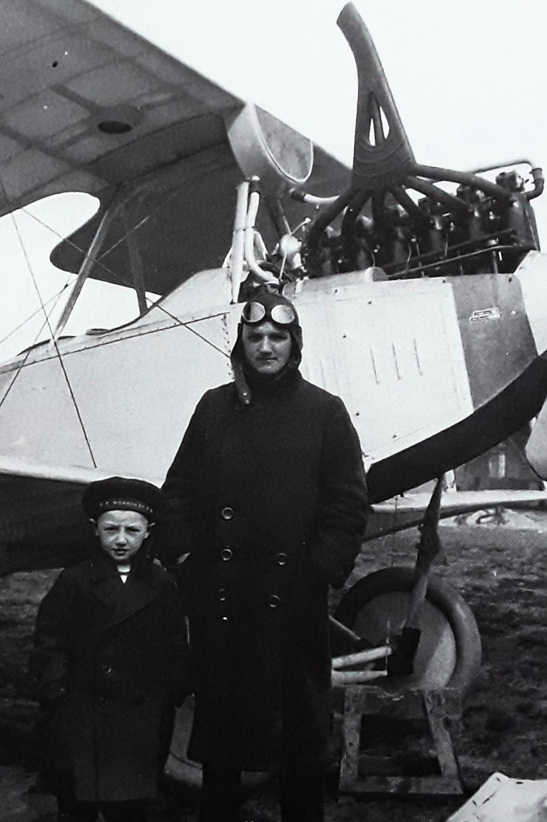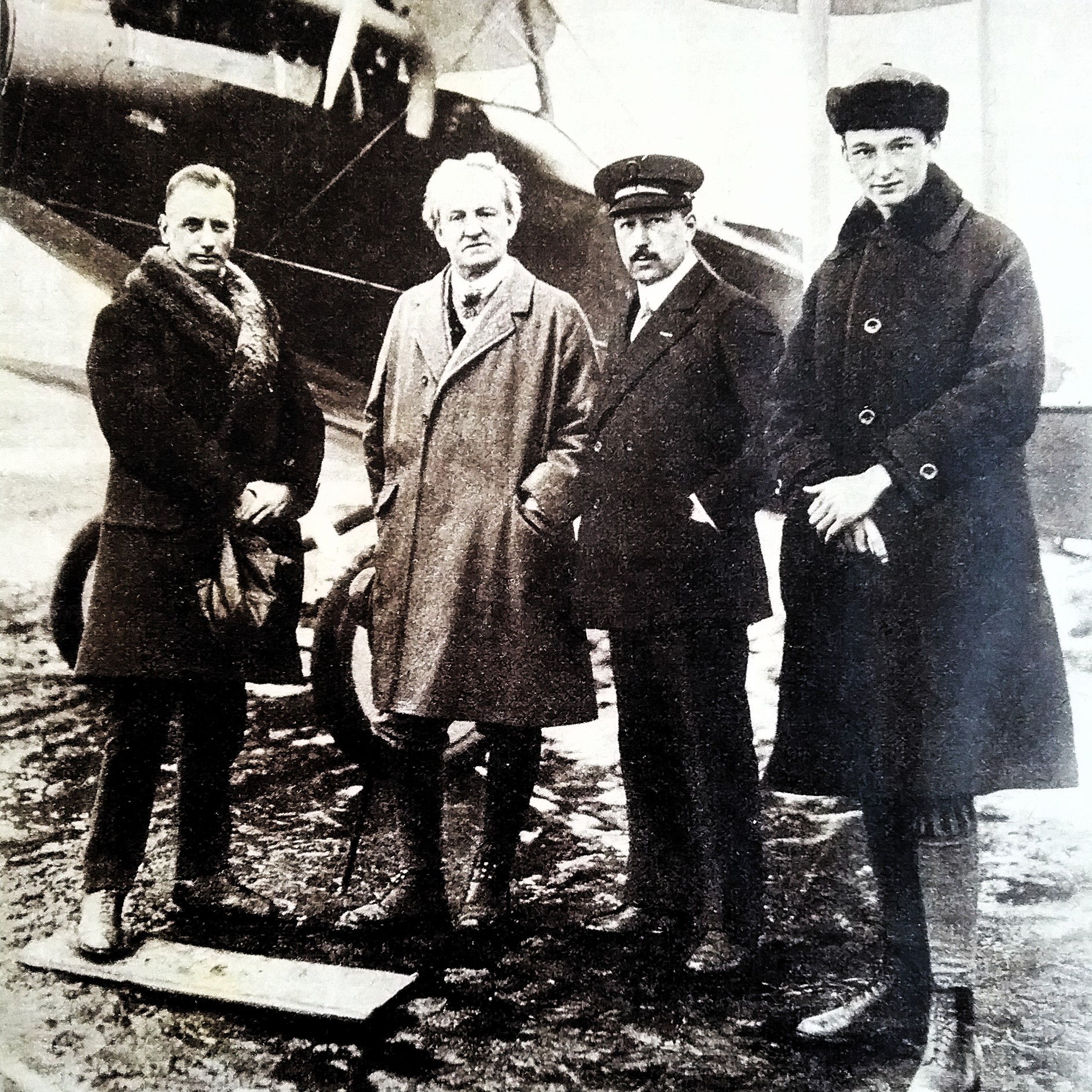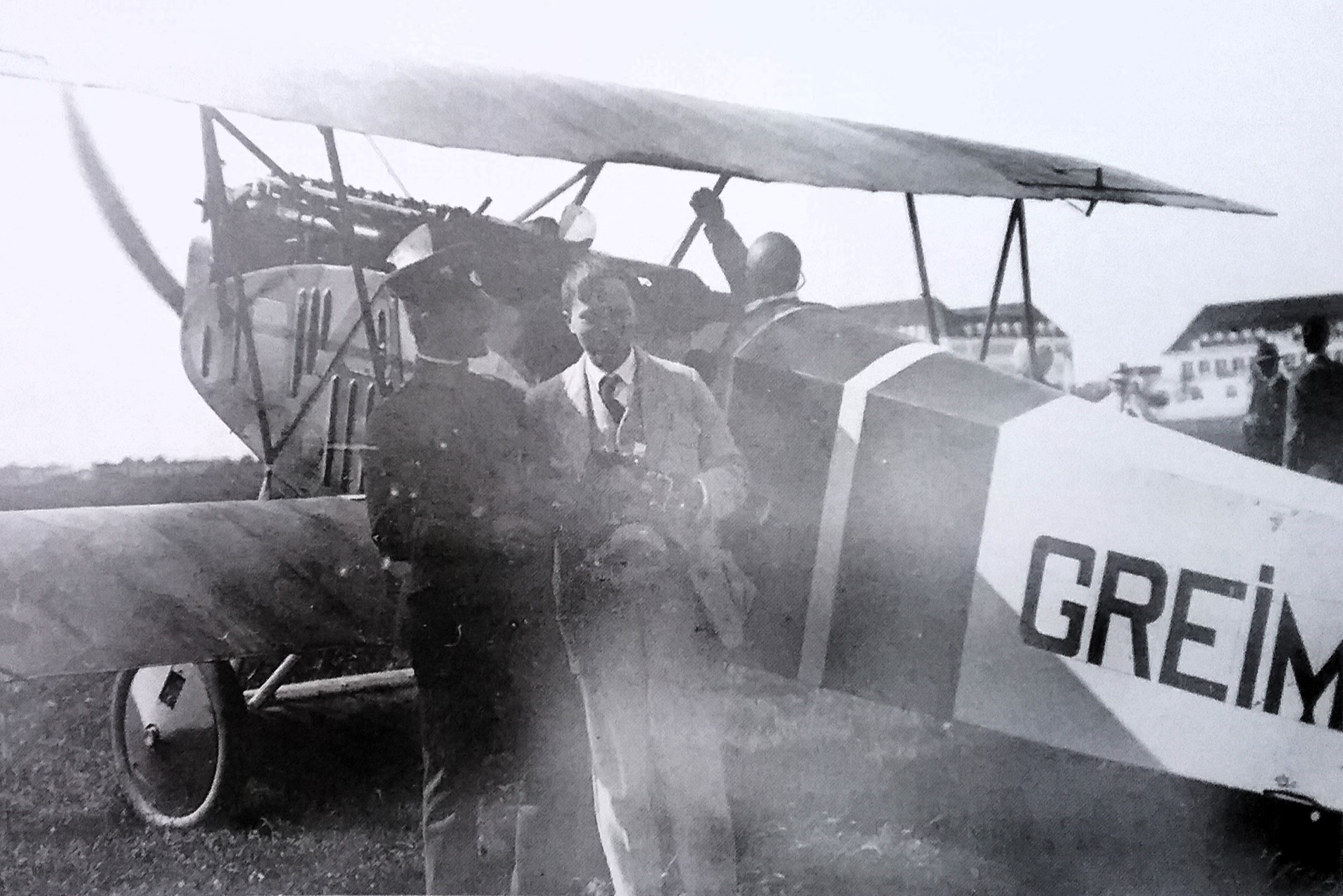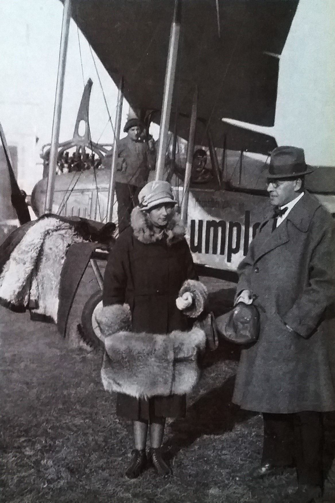 Dichter Gerhart Hauptmann (m/l) zwischen dem Piloten und dem Flugzeugkonstrukteur Edmund Rumpler bei seinem ersten Flug mit Sohn Benvenuto (r) - angeblich 1913, jedoch wohl eher 1916/17 (Deutsches Museum: Akt 00148-01 - Persönlichkeiten/Männer, Rum-Rze + Rumpler: "10 Jahre deutsche Flugtechnik", S.6 - 1918/19 + Frankfurter Illustrierte / Stöcker + Ullstein-Bilderdienst, Berlin + Hering: "Gerhart Hauptmann", S.32 - 1956 + gettyimages.de: Bild 537157263)