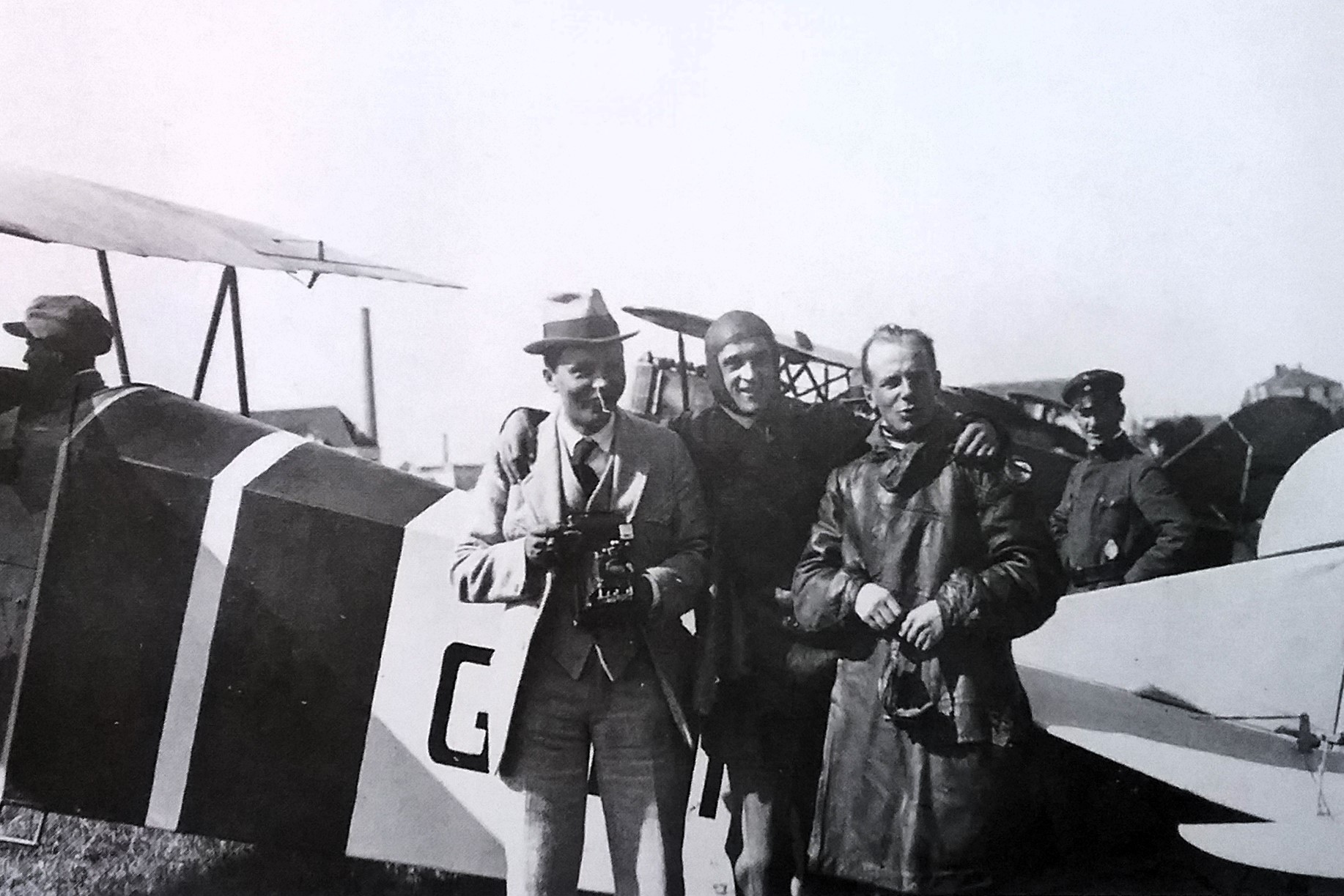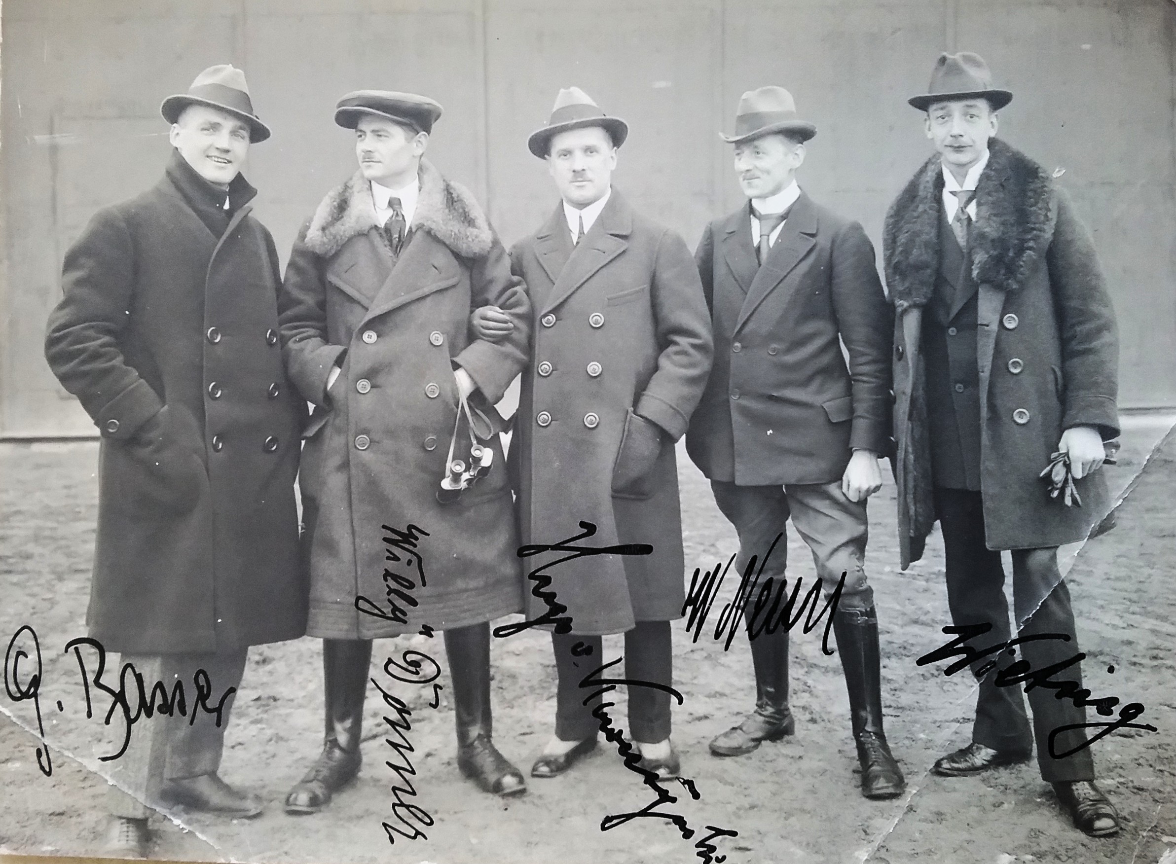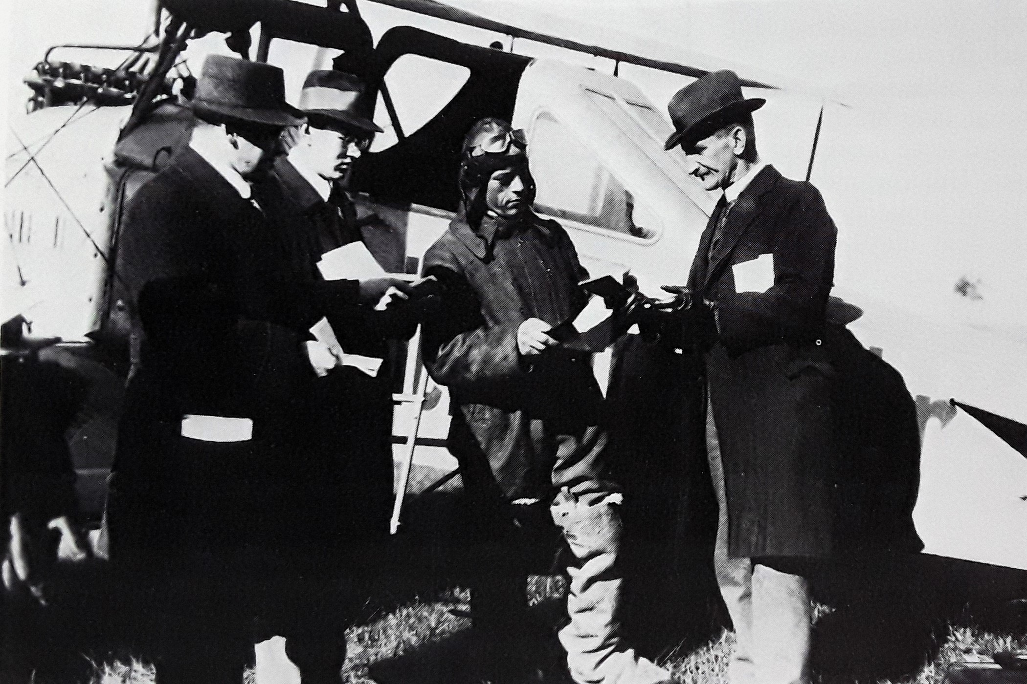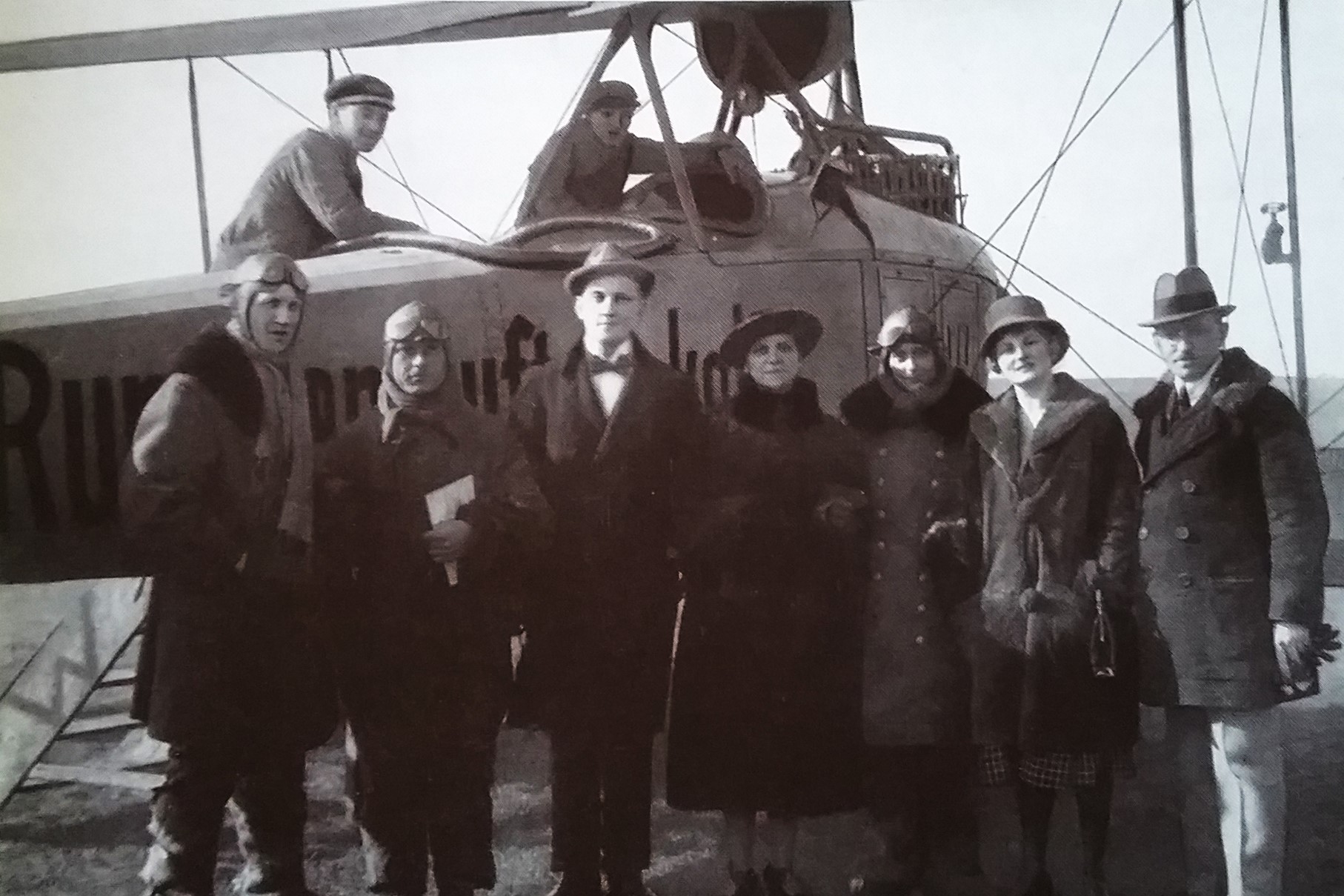Dichter Gerhart Hauptmann (m/l) zwischen dem Piloten und dem Flugzeugkonstrukteur Edmund Rumpler bei seinem ersten Flug mit Sohn Benvenuto (r) - angeblich 1913, jedoch wohl eher 1916/17 (Deutsches Museum: Akt 00148-01 - Persönlichkeiten/Männer, Rum-Rze + Rumpler: "10 Jahre deutsche Flugtechnik", S.6 - 1918/19 + Frankfurter Illustrierte / Stöcker + Ullstein-Bilderdienst, Berlin + Hering: "Gerhart Hauptmann", S.32 - 1956 + gettyimages.de: Bild 537157263)