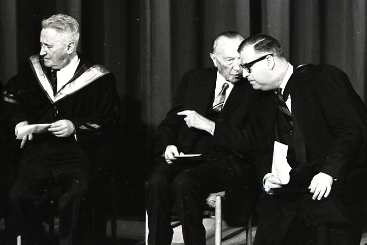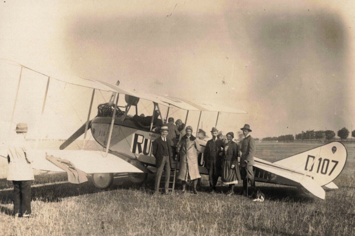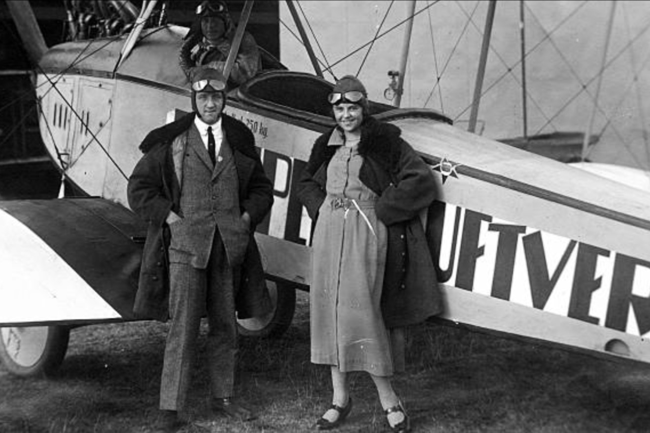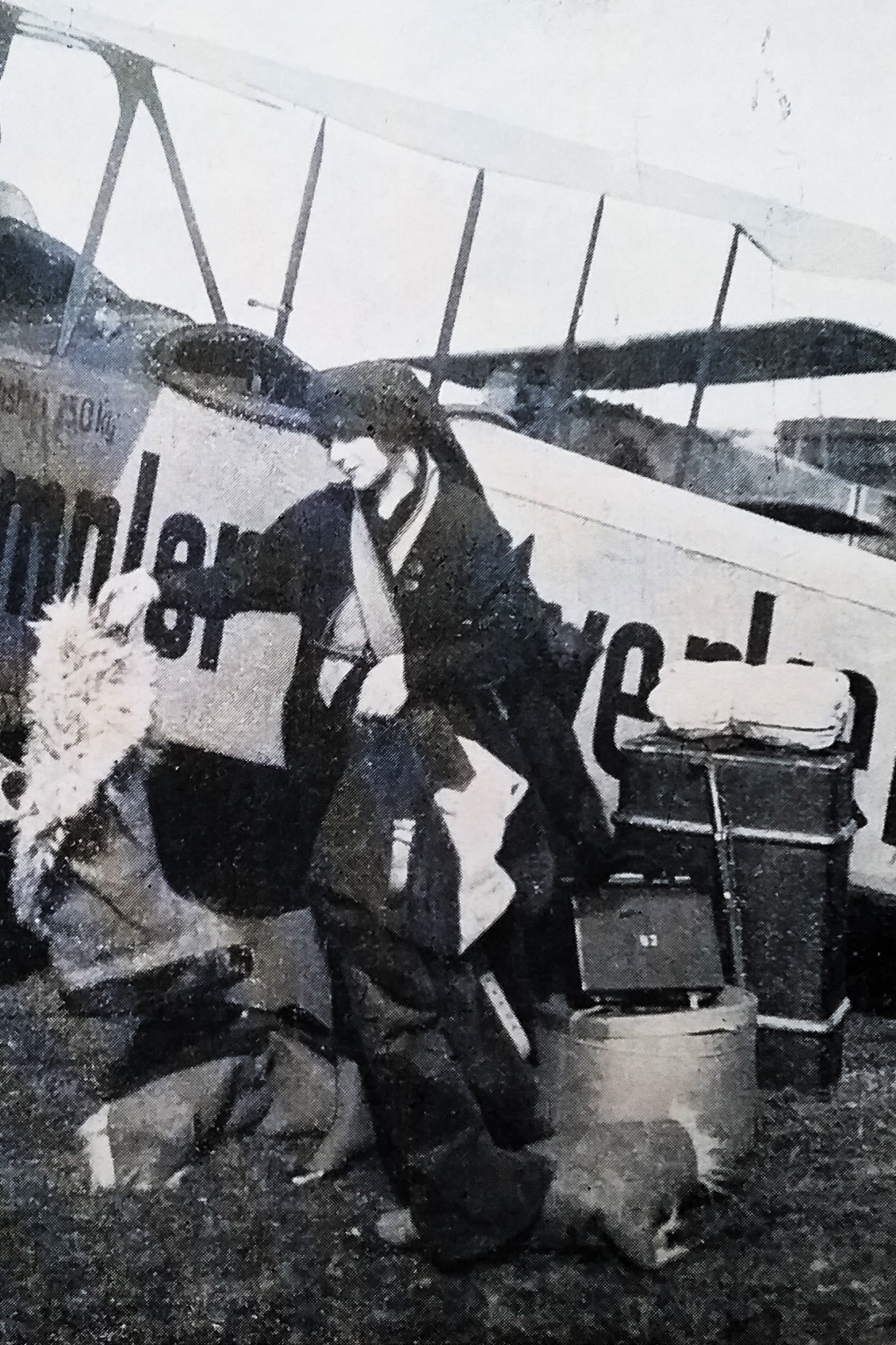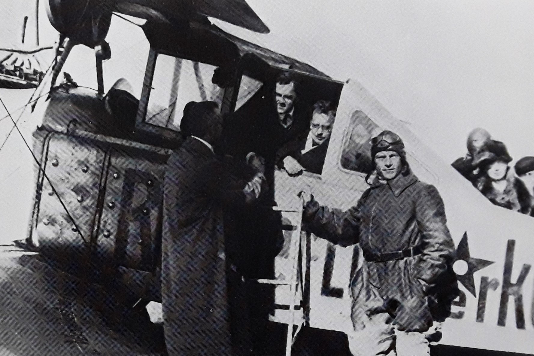 Dichter Gerhart Hauptmann (m/l) zwischen dem Piloten und dem Flugzeugkonstrukteur Edmund Rumpler bei seinem ersten Flug mit Sohn Benvenuto (r) - angeblich 1913, jedoch wohl eher 1916/17 (Deutsches Museum: Akt 00148-01 - Persönlichkeiten/Männer, Rum-Rze + Rumpler: "10 Jahre deutsche Flugtechnik", S.6 - 1918/19 + Frankfurter Illustrierte / Stöcker + Ullstein-Bilderdienst, Berlin + Hering: "Gerhart Hauptmann", S.32 - 1956 + gettyimages.de: Bild 537157263)