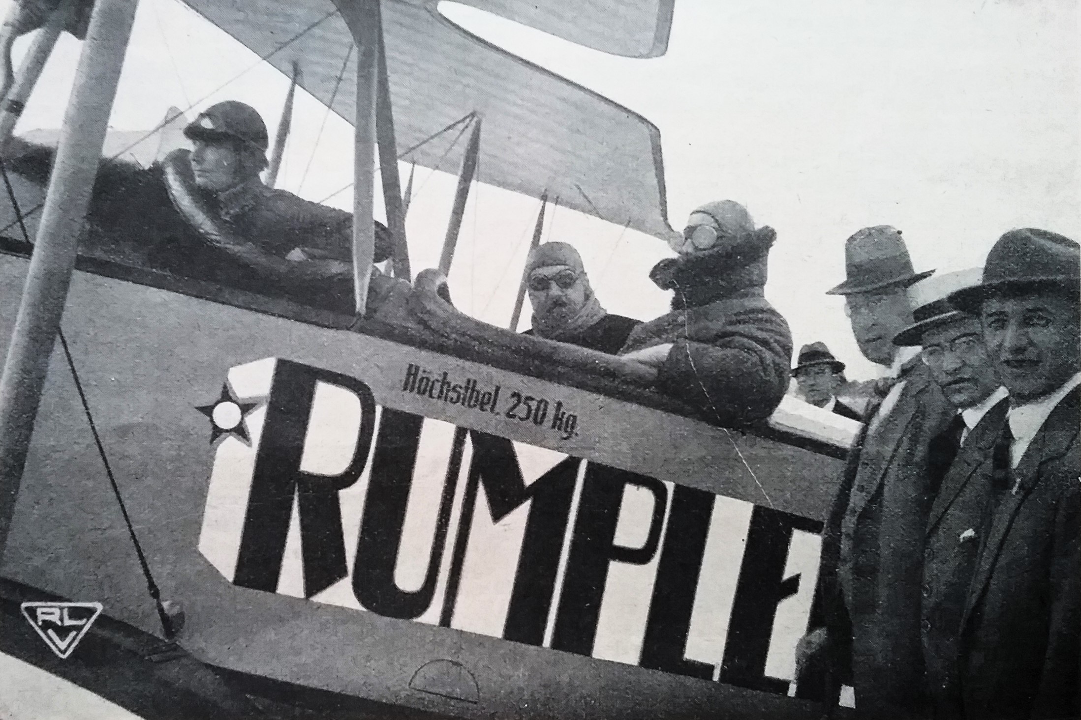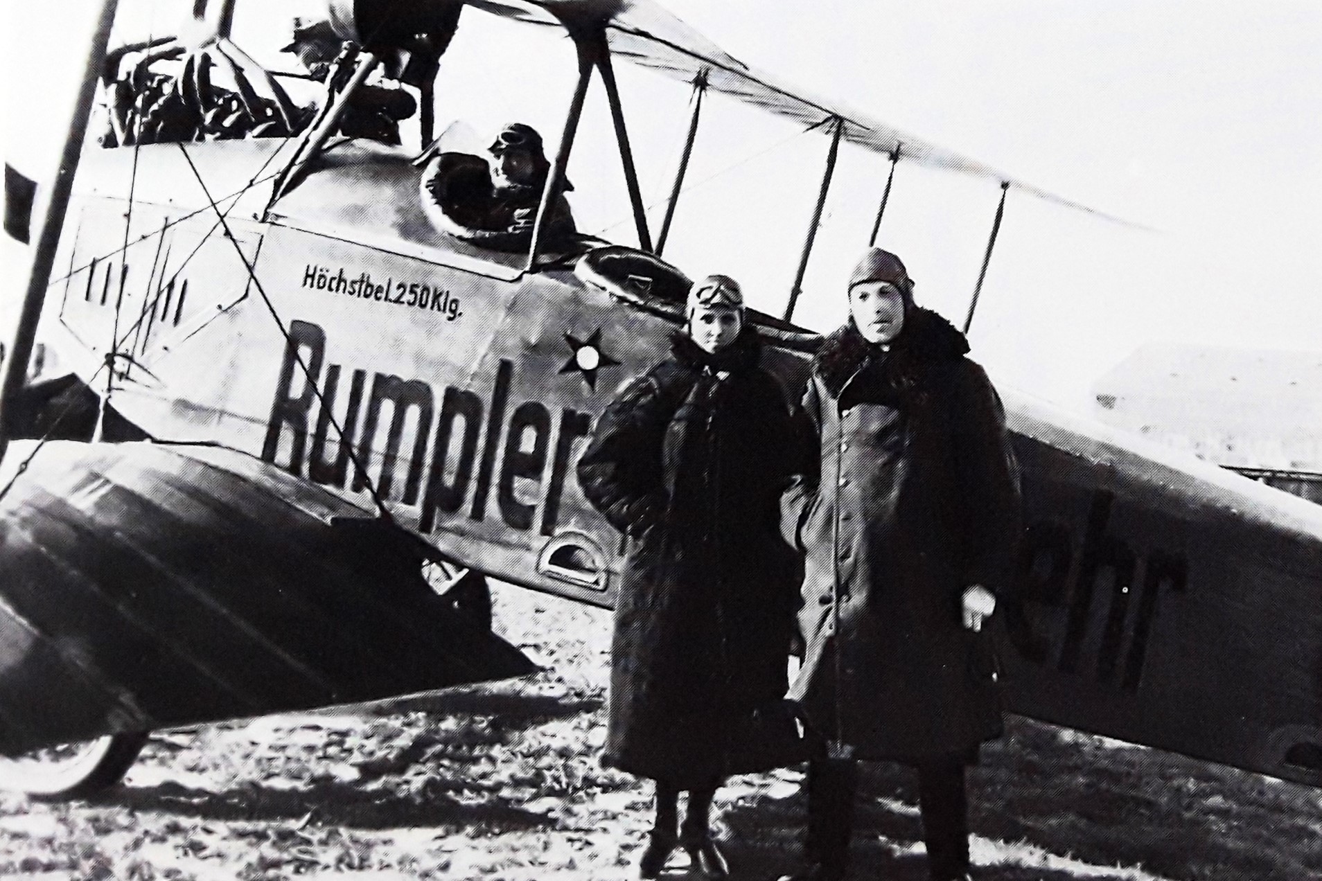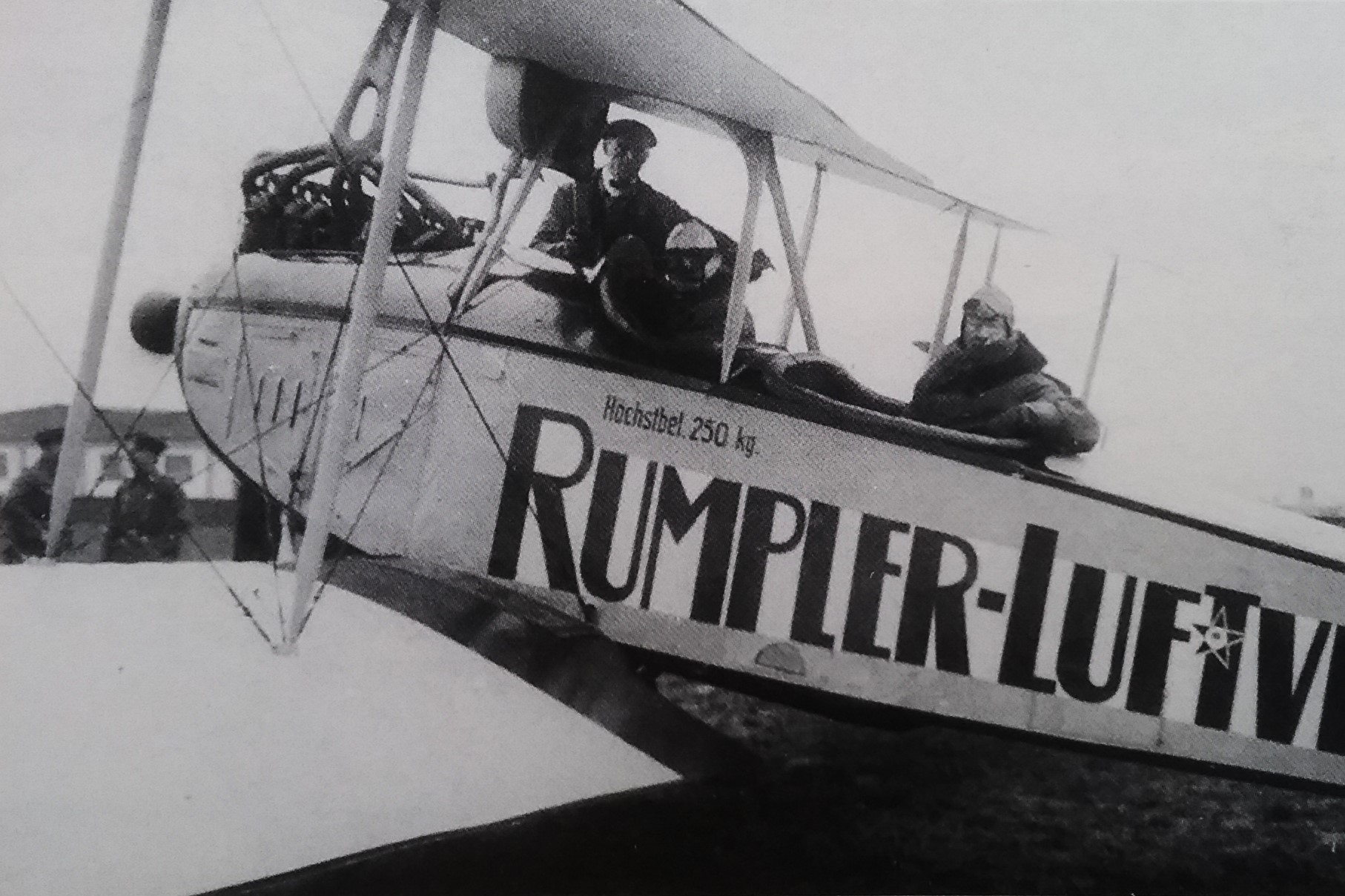 "Außergewöhnliche Steigfähigkeit": Ru C IV/D 100 auf dem Augsburger Flugfeld - 1917 (Links Pilot Adolf Doldi, rechts der kaumännische Direktor Hermann Aumer neben dem technischen Rumpler-Direktor Otto Meyer, in Kranzhoff: "Die deutsche Luftfahrt - Edmund Rumpler", S.334 - 2004)