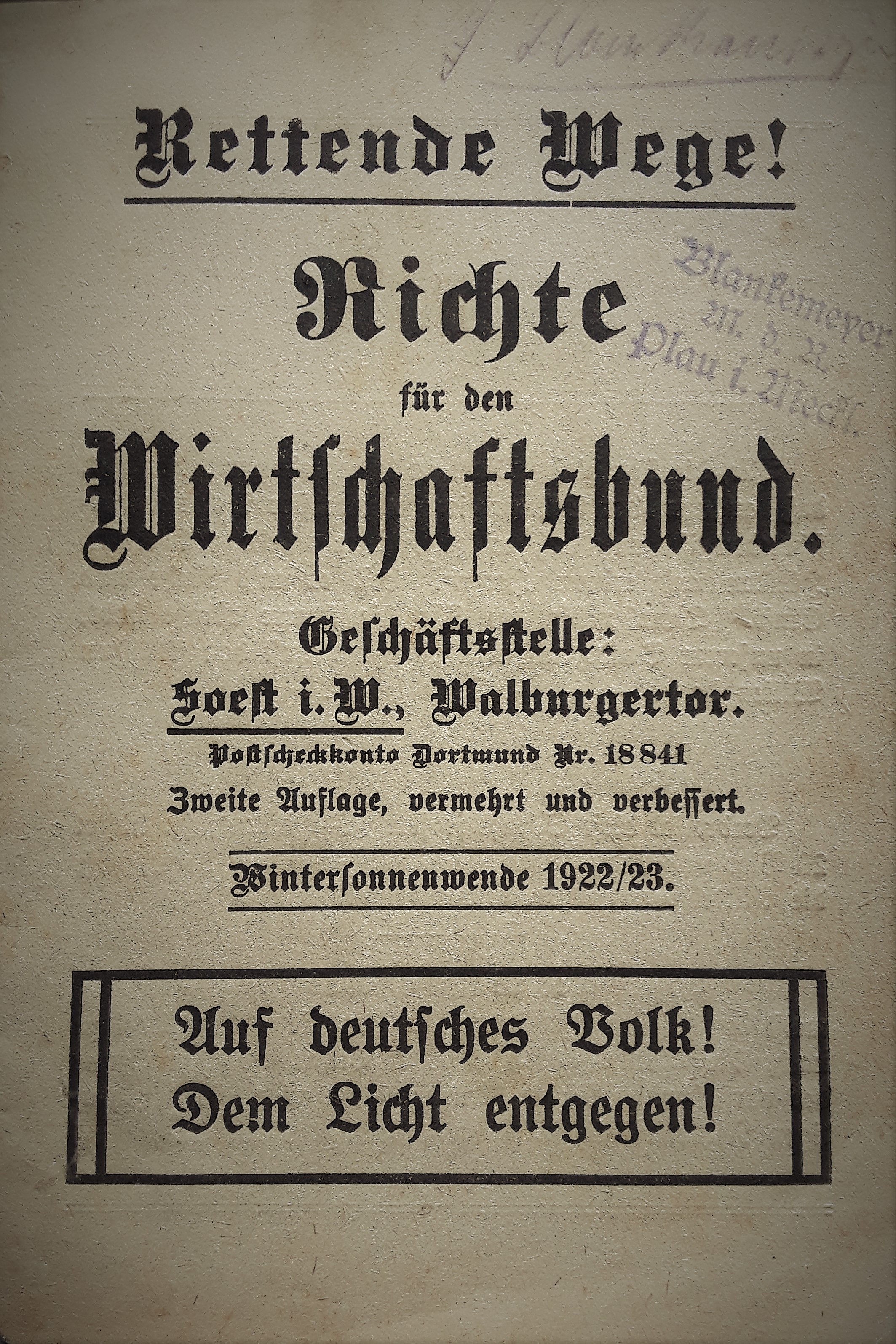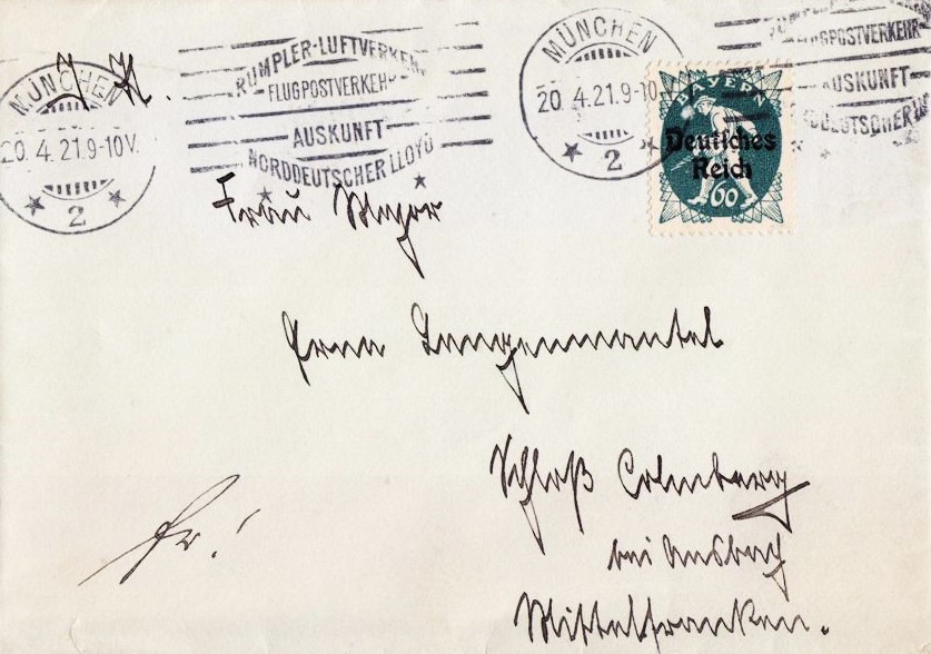 Auch Partei-Finanzier Dr. Grandel bekommt von der Münchener NSDAP-Geschäftsstelle im Juli 1920 eine Einladung für das Salzburger Treffen zugesandt. In dem parteiinternen Postausgangsvermerk heißt es zu seiner Person: