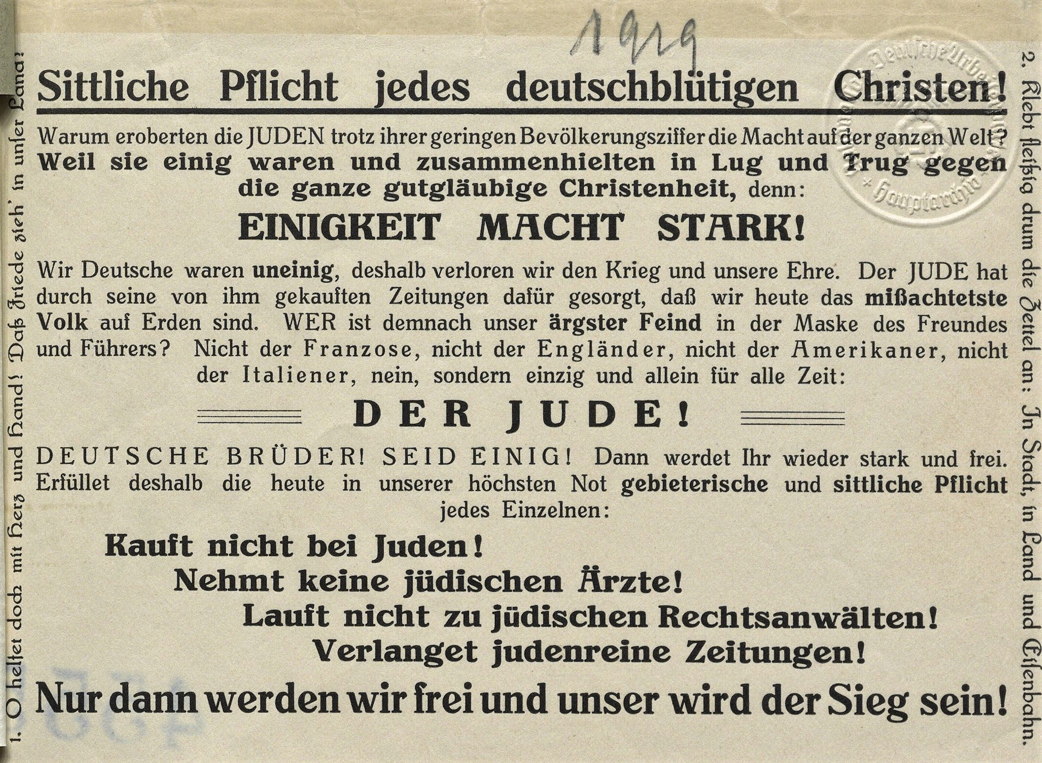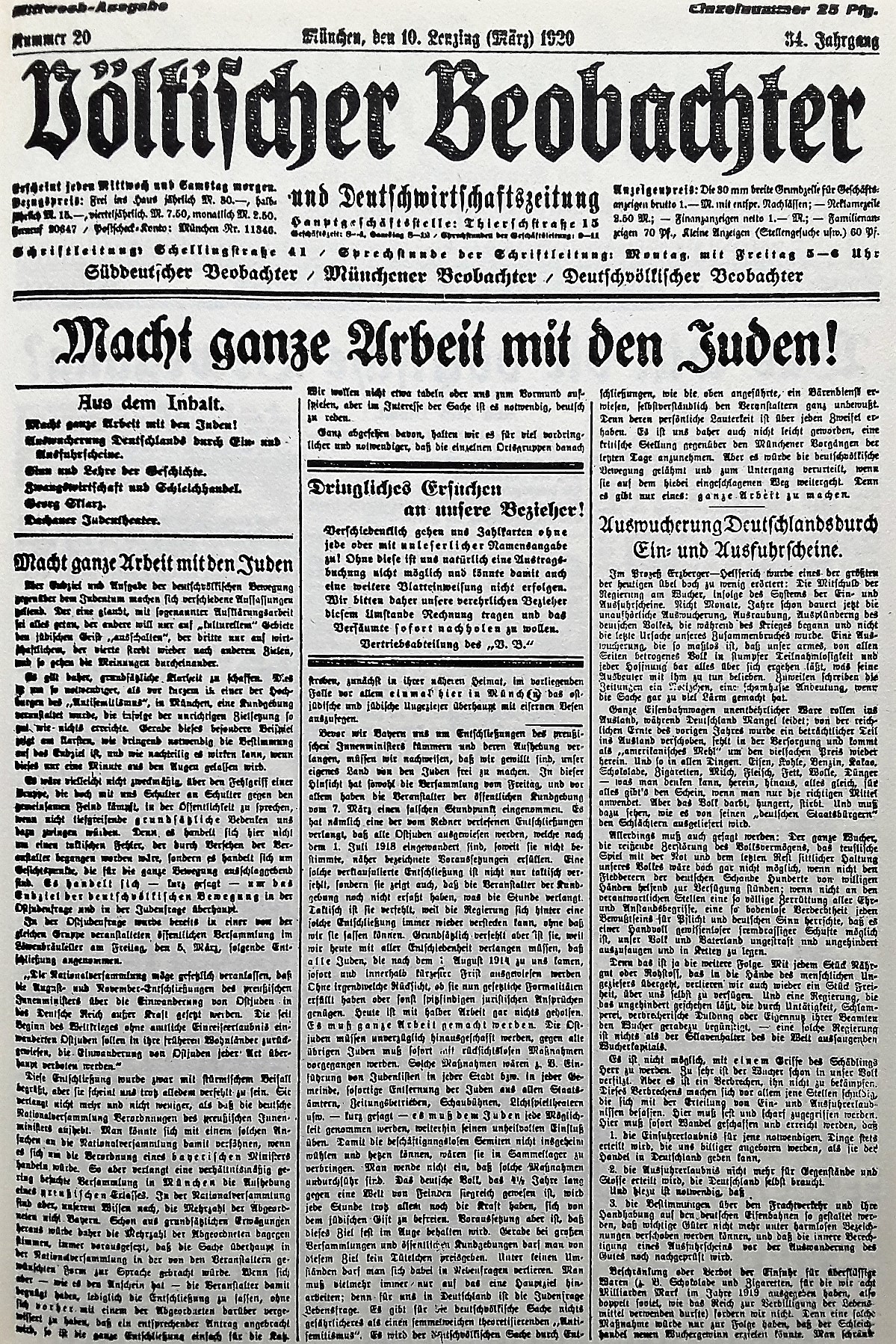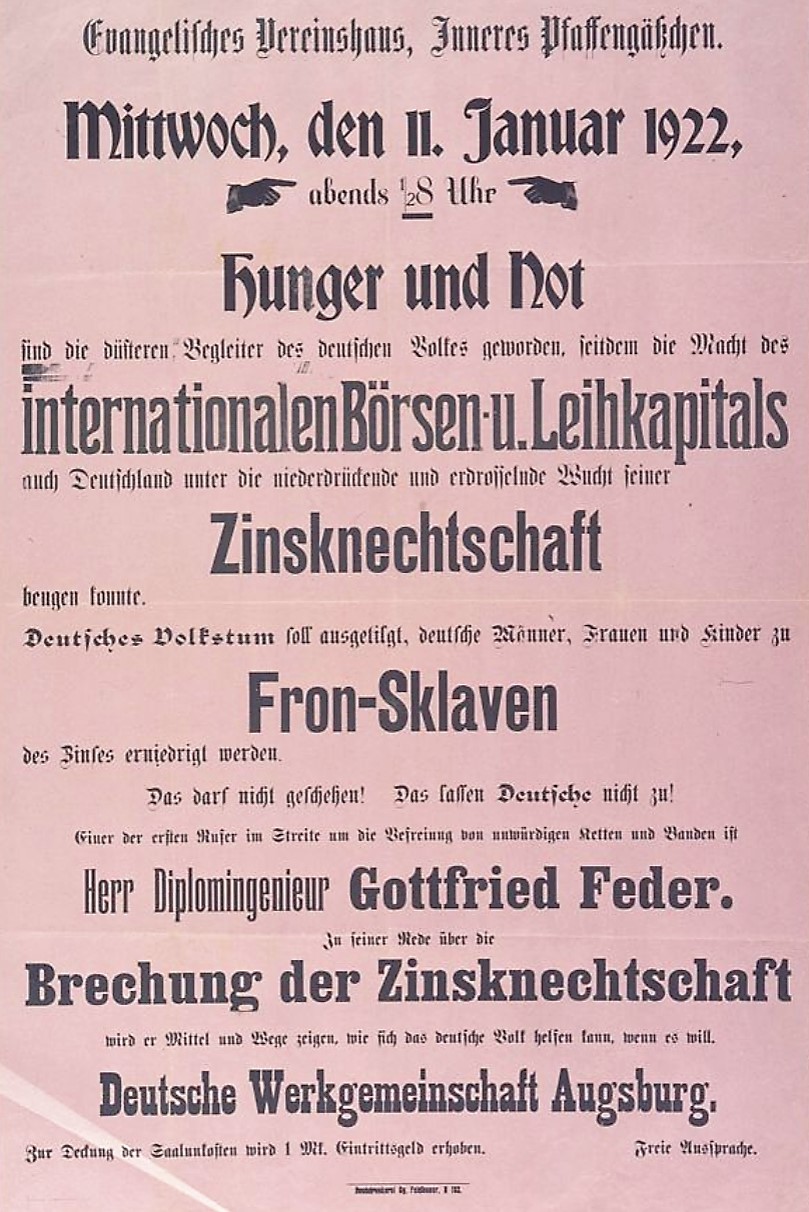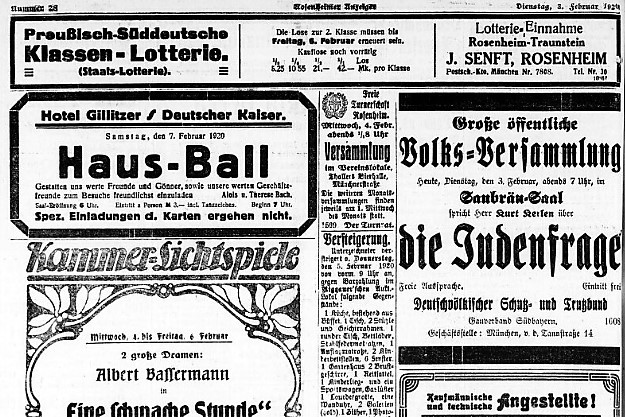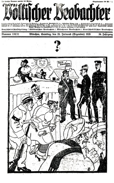 Waren es in der vom Germanen-Orden gelenkten Veranstaltung der Thule-Gesellschaft noch rund 30 Teilnehmer gewesen, so sind es am 13. August 1920 bereits um die 2000 Zuhörer, die den in Bayern mittlerweile bekannten Versammlungsredner im vollbesetzten Festsaal des Münchener Hofbräuhauses hören wollen. Der Propagandaredner greift zu dem Thema, was die stärksten Reaktionen im Publikum hervorruft: Dem massentauglichen Antisemitismus. Die Überschrift von Adolf Hitlers zweistündiger Veranstaltung lautet dann auch: