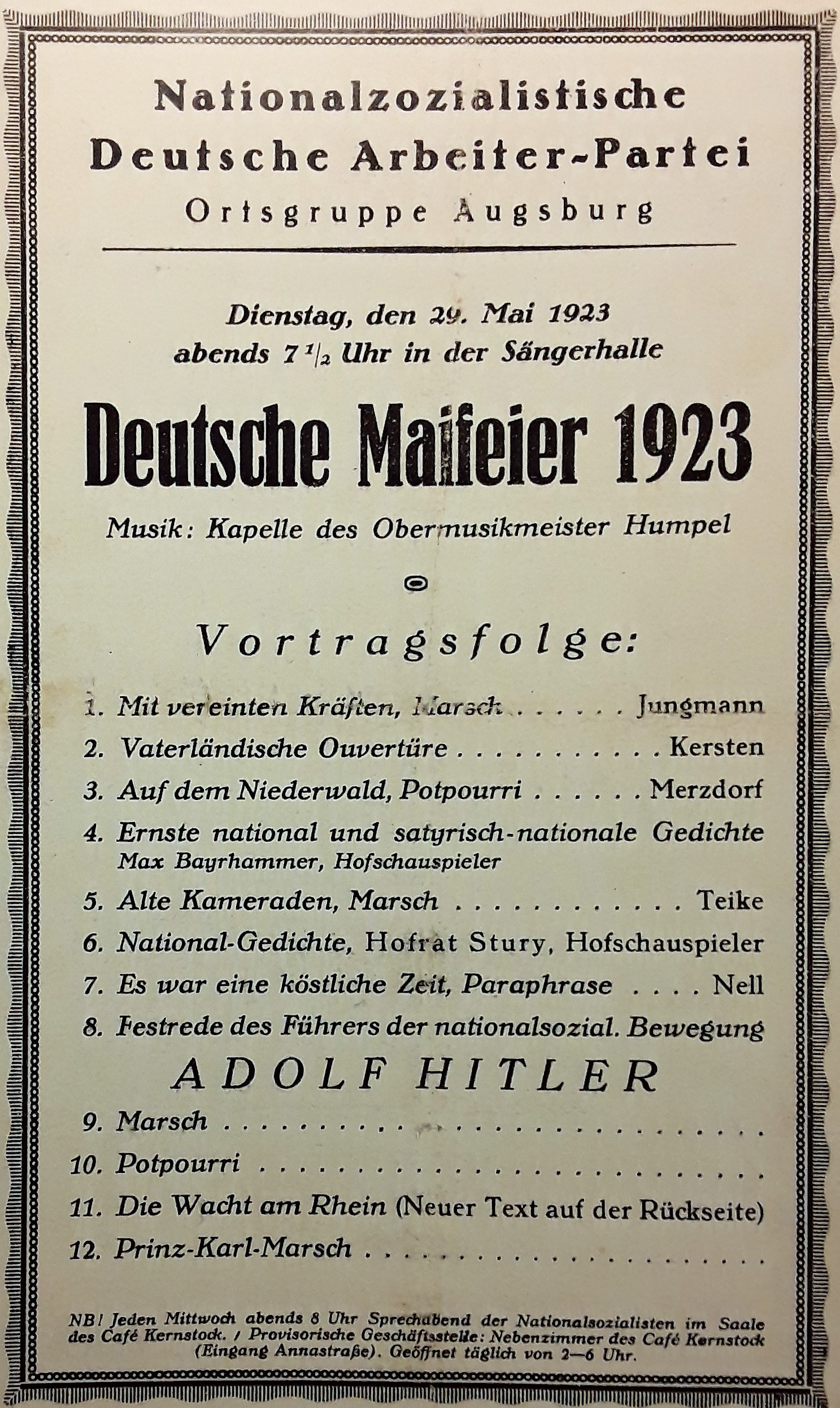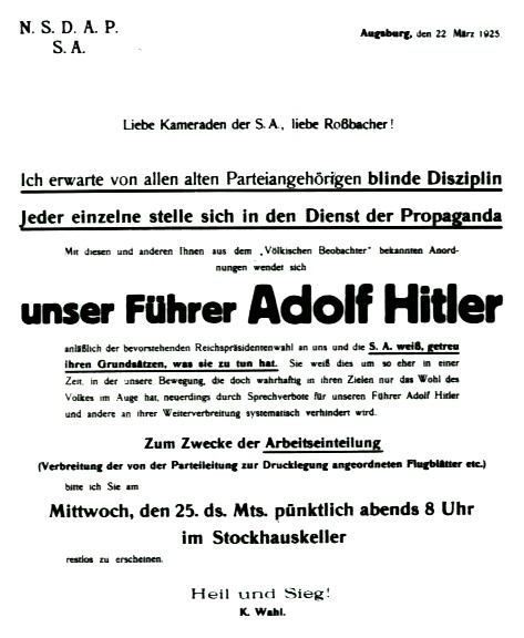 Die vom Parteibüro erwähnte Mitgliedskarte wird für Dr. Grandel hier erstmalig erforderlich, da er den Teilnehmern in Salzburg gänzlich unbekannt ist. Anders verhält es sich in Bayern. Parteiführer Adolf Hitler notiert in einem Artikel zum 10-jährigen Bestehen der Partei: