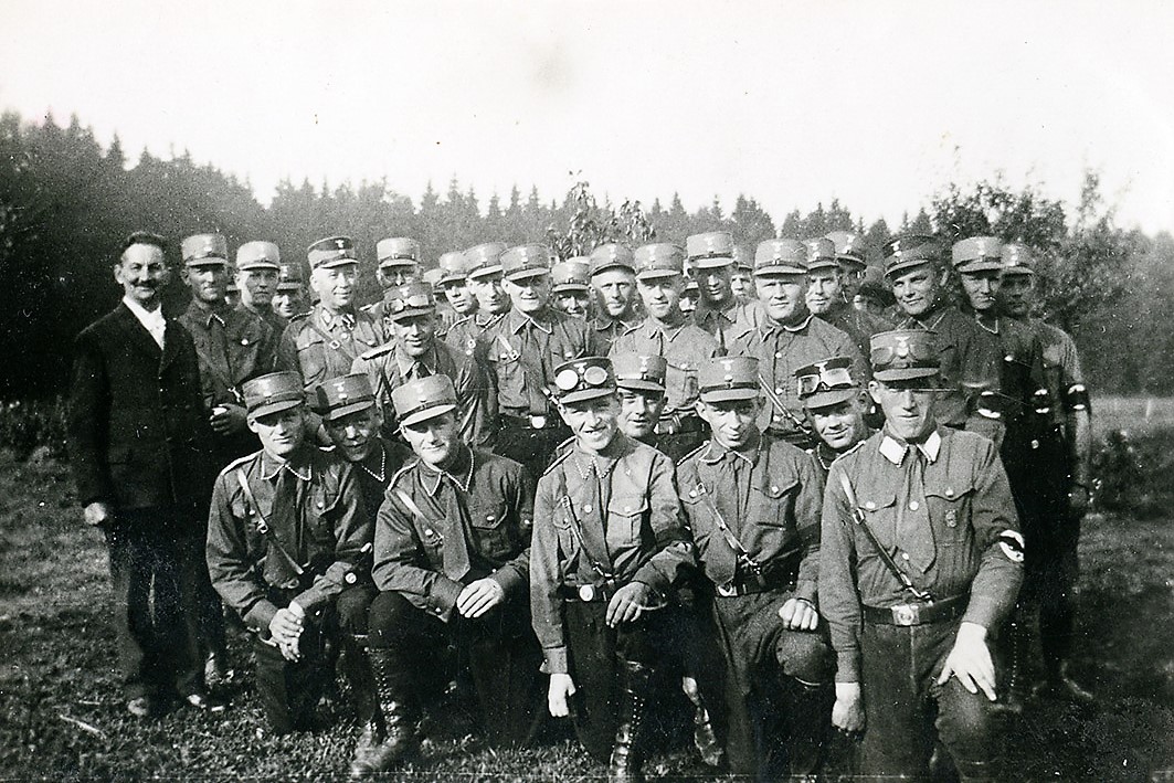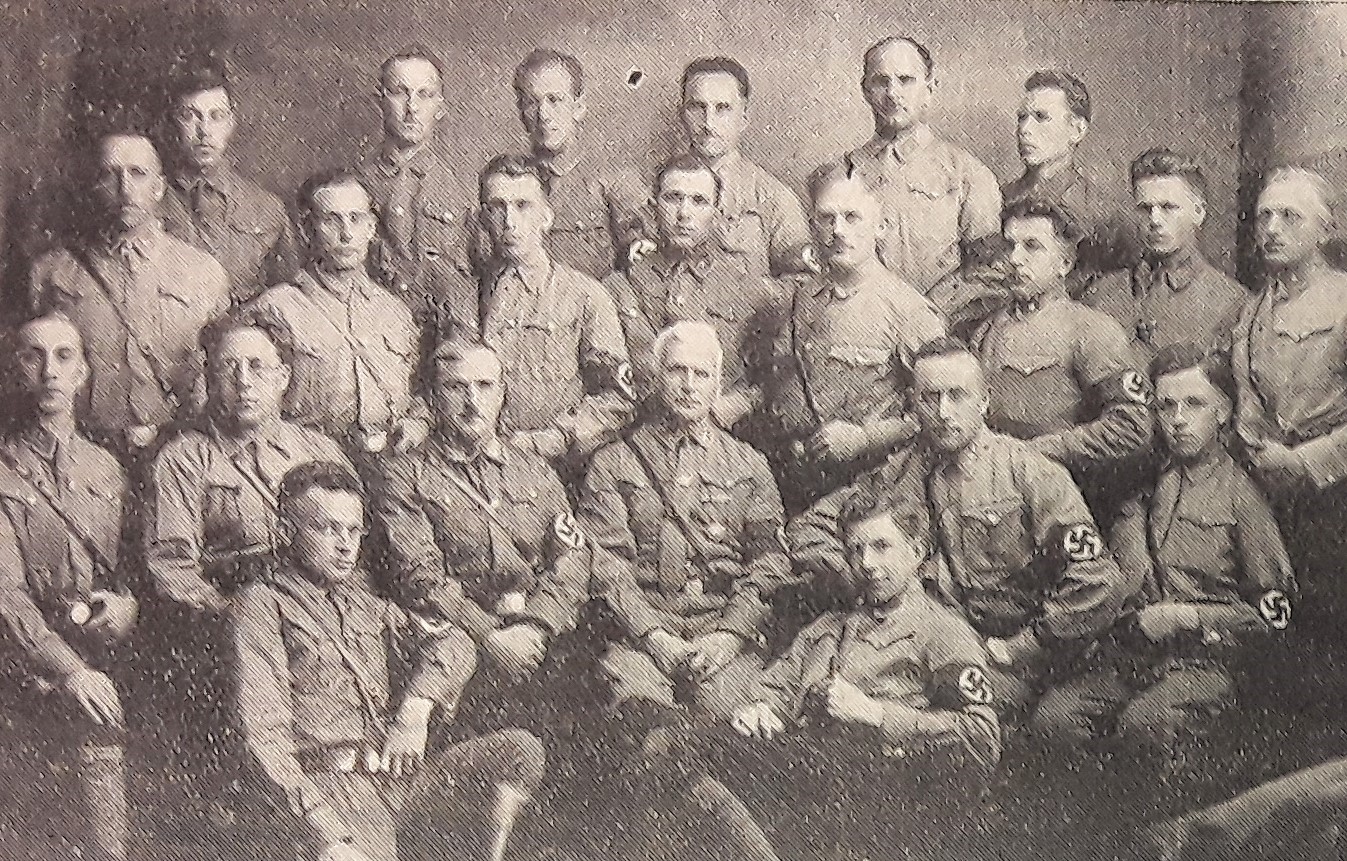 Vermutlich Gottfried Grandel: Vordere Reihe stehend, 2. von rechts. Ganz links, mit Pfeife und Hut, steht der Parteiführer Sektion Schwaben, Oskar Körner. Er beteiligt sich sowohl am 17. Dezember 1920 bei der Geldbeschaffung und Finanzierung des Völkischen Beobachters, der zweiten Augsburger Ortsgruppengründung vom Oktober 1922, als auch am gescheiterten Hitler-Putsch in München, in dessen Verlauf er an den Schüssen der Landespolizei verstirbt. Ganz rechts im Bild steht Oluf Christensen, der zweite von rechts, sitzend, ist vermutlich Hans Sippel. (BArch: Bild 119-5519 / o.Ang.)