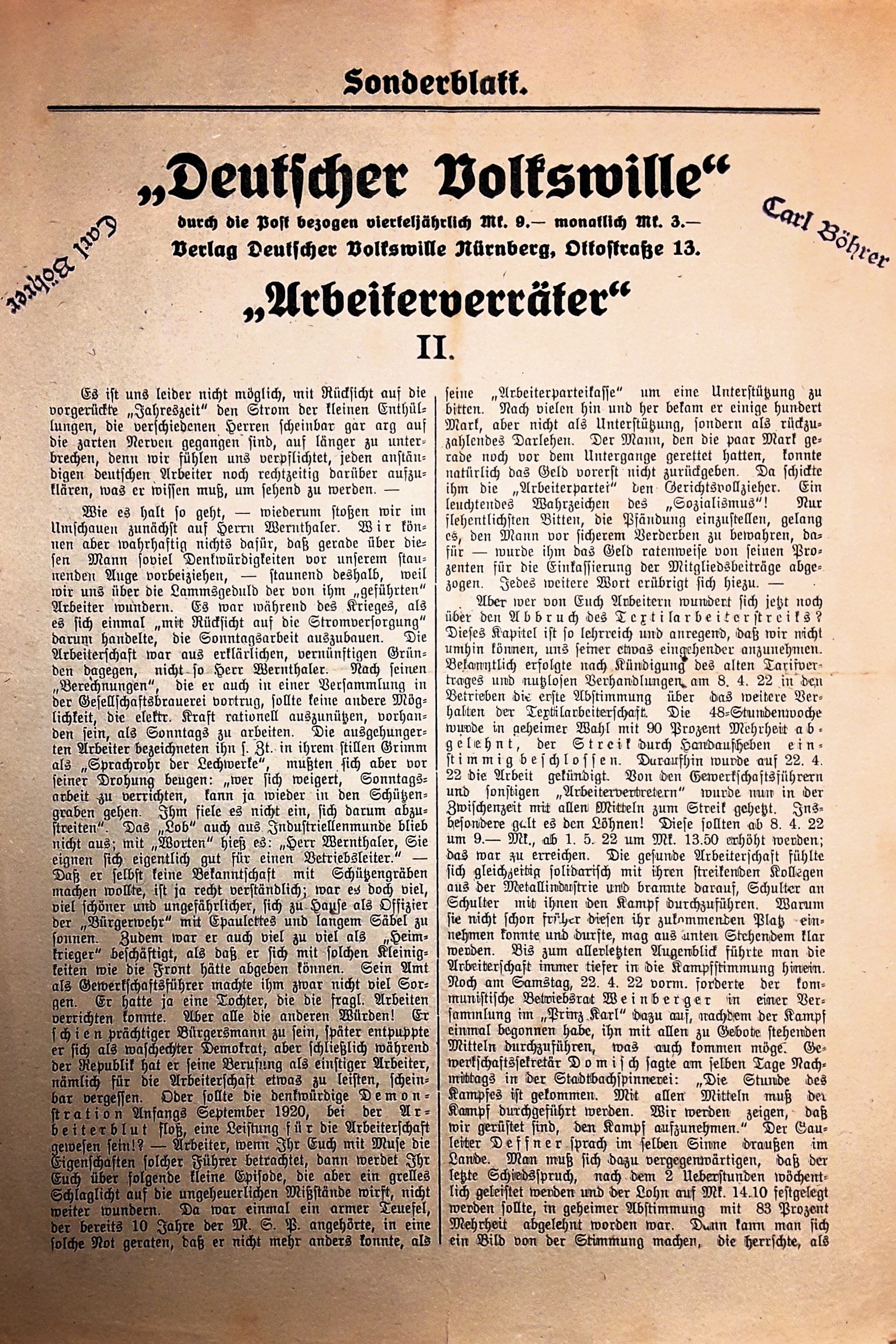 "Am 30. September 1920 fand in ihrem (-NSDAP-) Geschäftszimmer im Sterneckerbräu (Tal 54) in München eine Sitzung sämtlicher Vorstandsmitglieder und einiger besonders hinzugezogener Parteimitglieder zur Beschlussfassung über die Gründung eines 'Nationalsozialistischen Deutschen Arbeitervereins e.V.' statt. Anwesend waren: Der erste Vorsitzende Anton Drexler (1884-1942), der zweite Vorsitzende Benedikt Angermeir, (geb. 1877), die Kaufleute Oskar Körner (geb. 1875) und Rudolf Schüßler (geb. 1893), die Schlosser Karl Riedl (geb. 1891, Kassierer) und Fritz Michel (Versammlungsobmann) sowie F. Kurz. Drexler begründete das Vorgehen damit, dass die Partei einen Rechtstitel benötige, um den Charakter einer juristischen Person zu bekommen. Wahrscheinlich hielt er die Vereinsgründung auch wegen der geplanten Übernahme des 'Völkischen Beobachters' für erforderlich." (historisches-lexikon-bayerns.de: NSDAV 1920-23 - Amtsgericht München, Registergericht, Vereinsreg.. Bd. XVIII, Nr.1+Nr.46, Verfügung v. 20.10.1920)