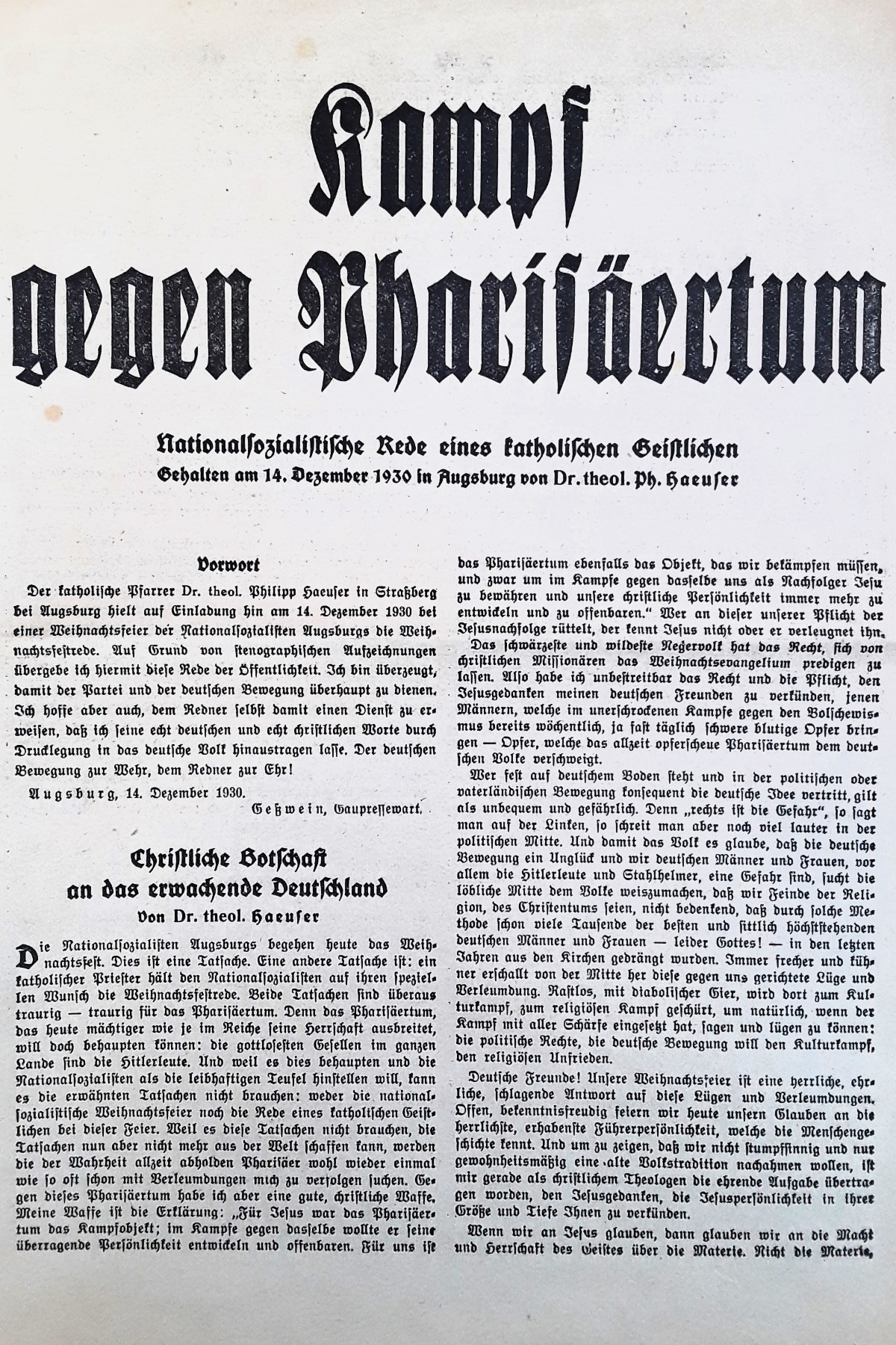 Gottfried Grandels frühes Wirken für die NSDAP bleibt den Augsburgern nicht verborgen. Das sozialdemokratische Zentralorgan Vorwärts schreibt über die parteipolitische Rolle des Ölfabrikanten: