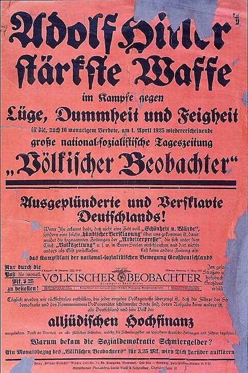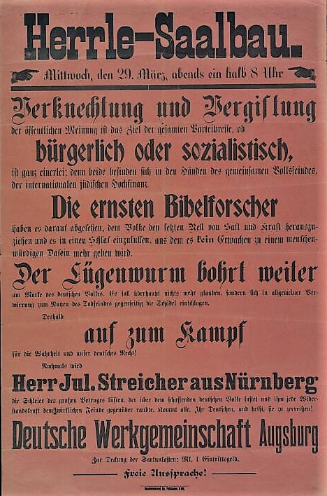 "Denn denken Sie nicht, daß Sie eine Krankheit (-gemeint ist von ihm der jüdische Geist-) bekämpfen können, ohne nicht den Erreger zu töten, ohne den Bazillus zu vernichten, und denken Sie nicht, daß Sie die Rassentuberkulose bekämpfen können, ohne zu sorgen, daß das Volk frei wird von dem Erreger der Rassentuberkulose. Das Wirken des Judentums wird niemals vergehen, und die Vergiftung des Volkes nicht enden, solange nicht der Erreger, der Jude, aus unserer Mitte entfernt ist." (Jäckel: "Hitlers Weltanschauung", S.58 - 1981 + Völkischer Beobachter, Nr.75 - 1920)