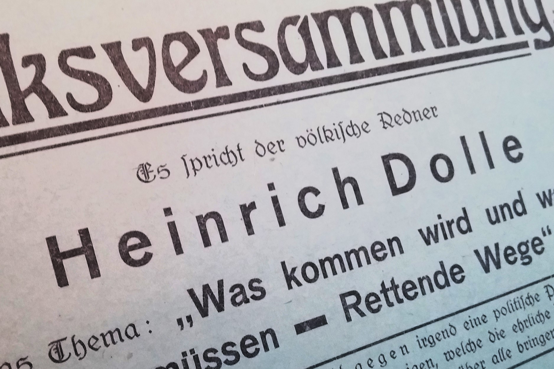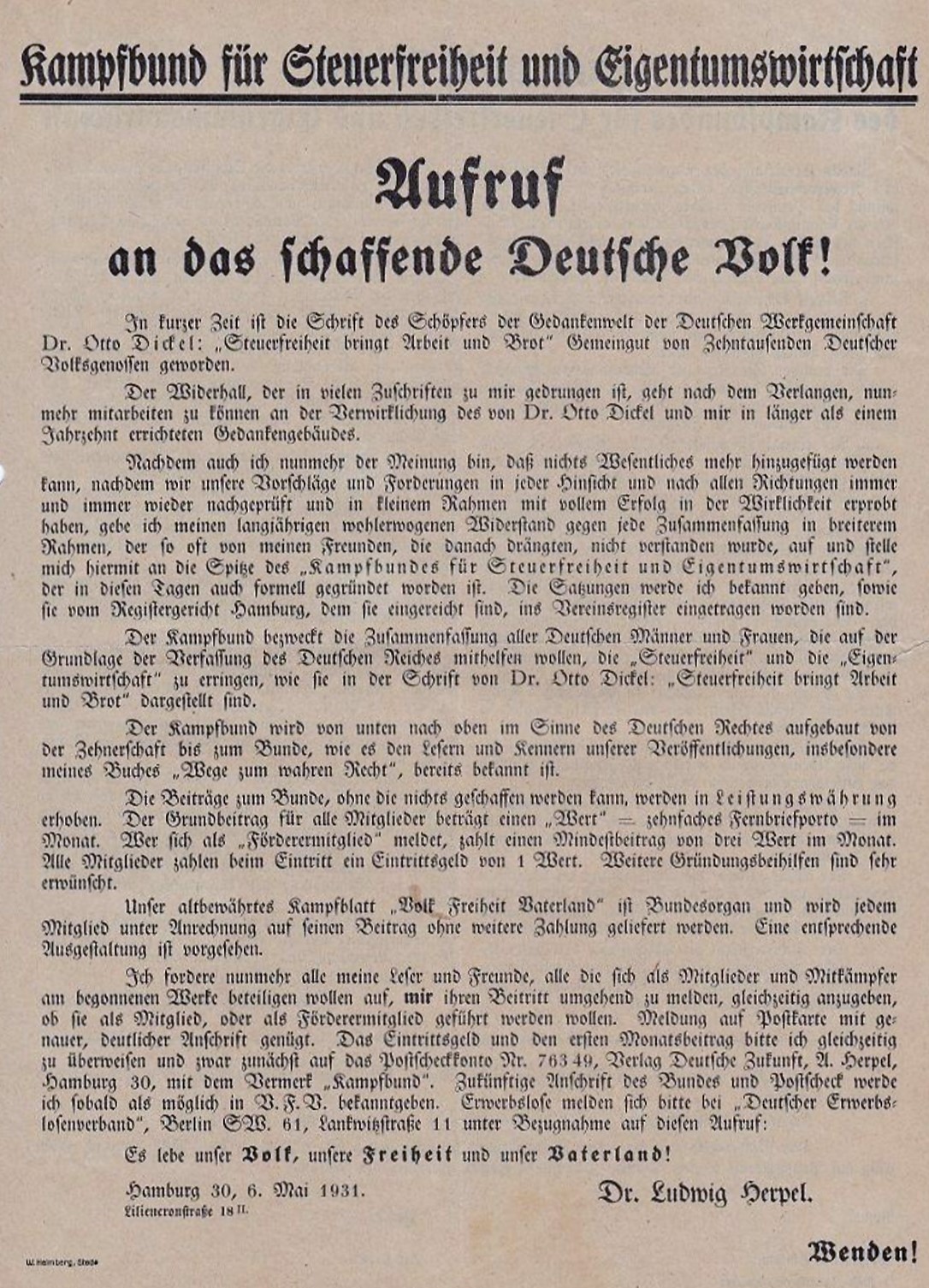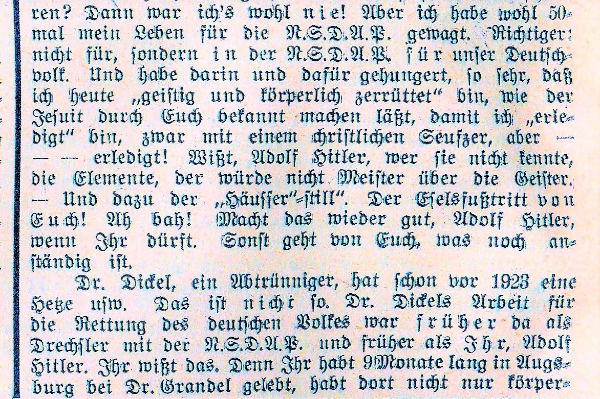 "Er veranstaltete hier Vorträge des Herrn Dr. Gottfr. Feder, hielt selbst Vorträge über die Schaffung eines deutschen Rechtes und schuf im Anschluss daran gemeinsam mit Dr. Dickel die Anfänge der hiesigen nationalsozialistischen Bewegung." (Digitalisiert auf invenio.bundesarchiv.de: BArch Berlin, R8048/672, S.37 - Amtmann Georg Fischer an Verleger Julius F. Lehmann v. 31.1.1924)