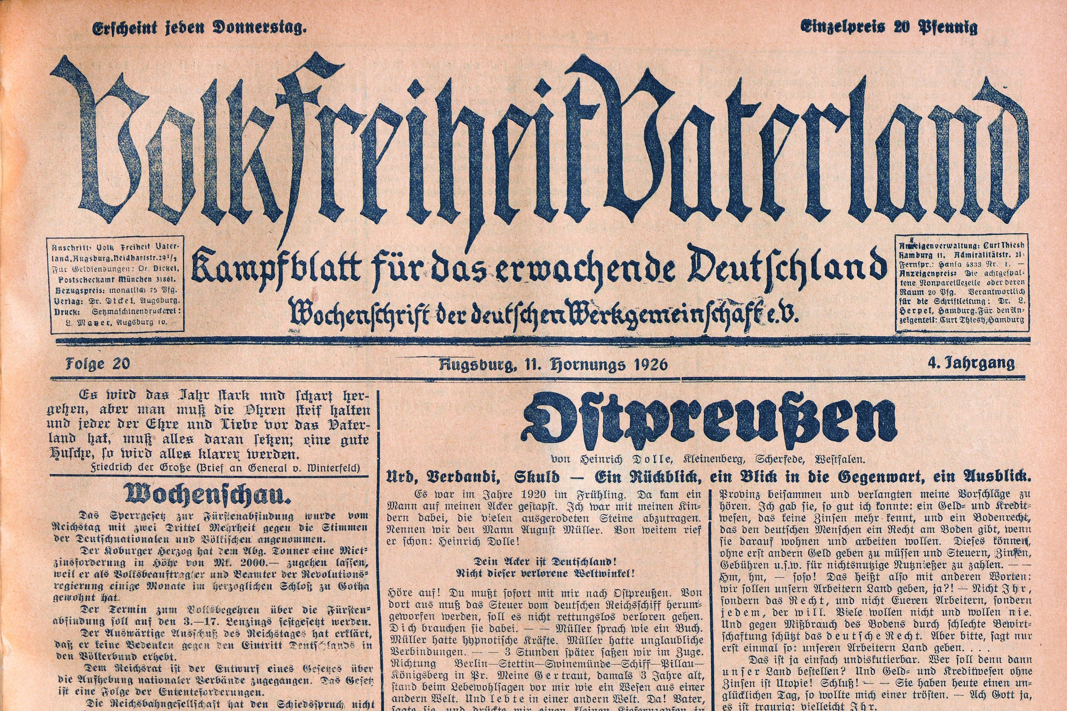 Bereits eine Woche zuvor wird Adolf Hitler bei seinem Vortrag im österreichischen Salzburg mit folgenden Gesellschaftsvorstellungen zitiert, die er im Folgejahrzehnt in die Realität umsetzen wird: