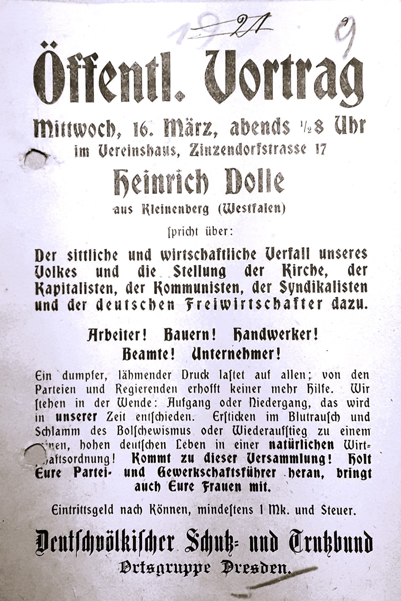 Der Journalist Karl Harrer ist mittlerweile nach nur einjährigem DAP-Vorsitz von allen Parteiämtern auf der Mitgliederversammlung am 5. Januar 1920 zurückgetreten. Er hält Hitler für "größenwahnsinnig"; lehnt zuvor in unterlegener Abstimmung mehrere 1920 geplante Massenveranstaltungen für die unbekannte Kleinstpartei ab.