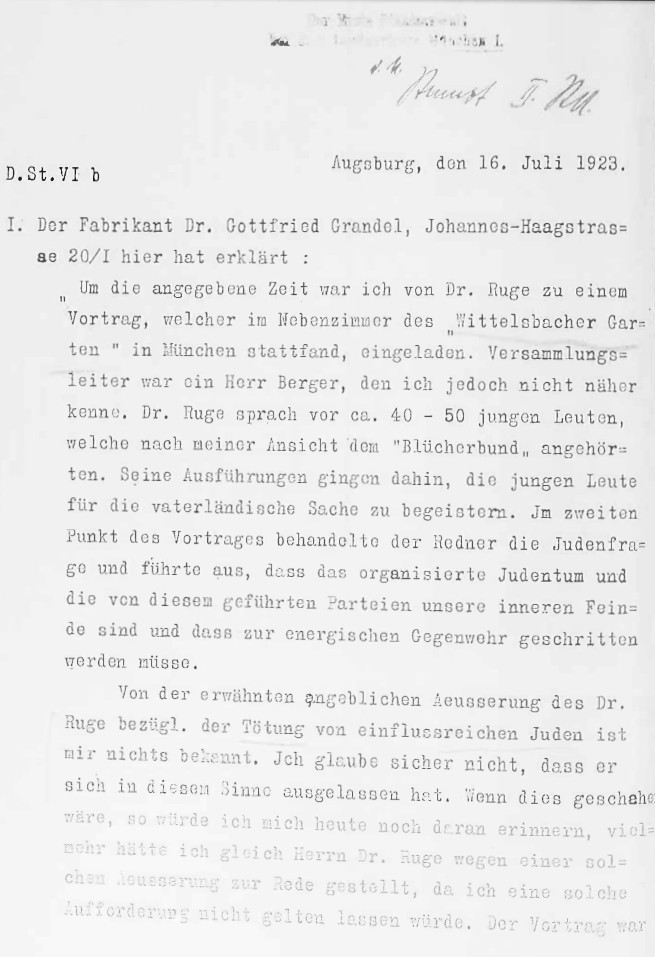 "Ich gehörte bis 1921 der Nationalsoz. Partei an und seit dieser Zeit überhaupt keiner politischen Partei mehr." (LArch Berlin: A Rep. 358-01, Nr.6011, Bl.55 - Prozessakte Thormann-Grandel - Dr. Gottfried Grandels Vernehmungsprotokoll vor dem Augsburger Amtsrichter Herrmann v. 19.1.1924)