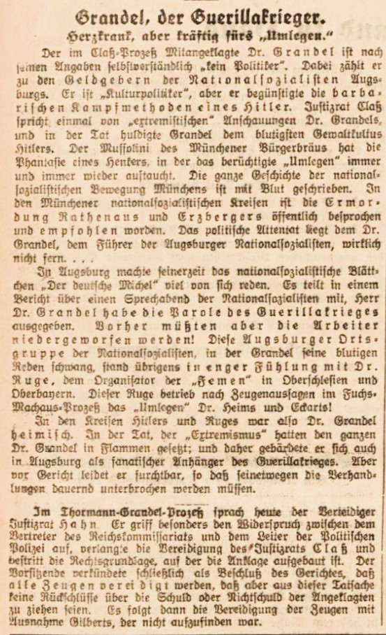 "Herzkrank, aber kräftig fürs 'Umlegen'.(...) In Augsburg machte seinerzeit das nationalsozialistische Blättchen 'Der deutsche Michel' viel von sich reden. Es teilt in einem Bericht über einen Sprechabend der Nationalsozialisten mit, Herr Dr. Grandel habe die Parole des Guerillakrieges ausgegeben. Vorher müßten aber die Arbeiter niederweworfen werden! Diese Augsburger Ortsgruppe der Nationalsozialisten, in der Grandel seine blutigen Reden schwang, stand übrigens in enger Fühlung mit Dr. Ruge, dem Organisator der 'Femen' in Oberschlesien und Oberbayern.(...) In den Kreisen Hitlers und Ruges war also Dr. Grandel heimisch. In der Tat, der Extremismus' hatte den ganzen Dr. Grandel in Flammen gesetzt; und daher gebärdete er sich auch in Augsburg als fanatischer Anhänger des Guerillakrieges. Aber vor Gericht leidet er furchtbar, so daß seinetwegen die Verhandlungen dauernd unterbrochen werden müssen."