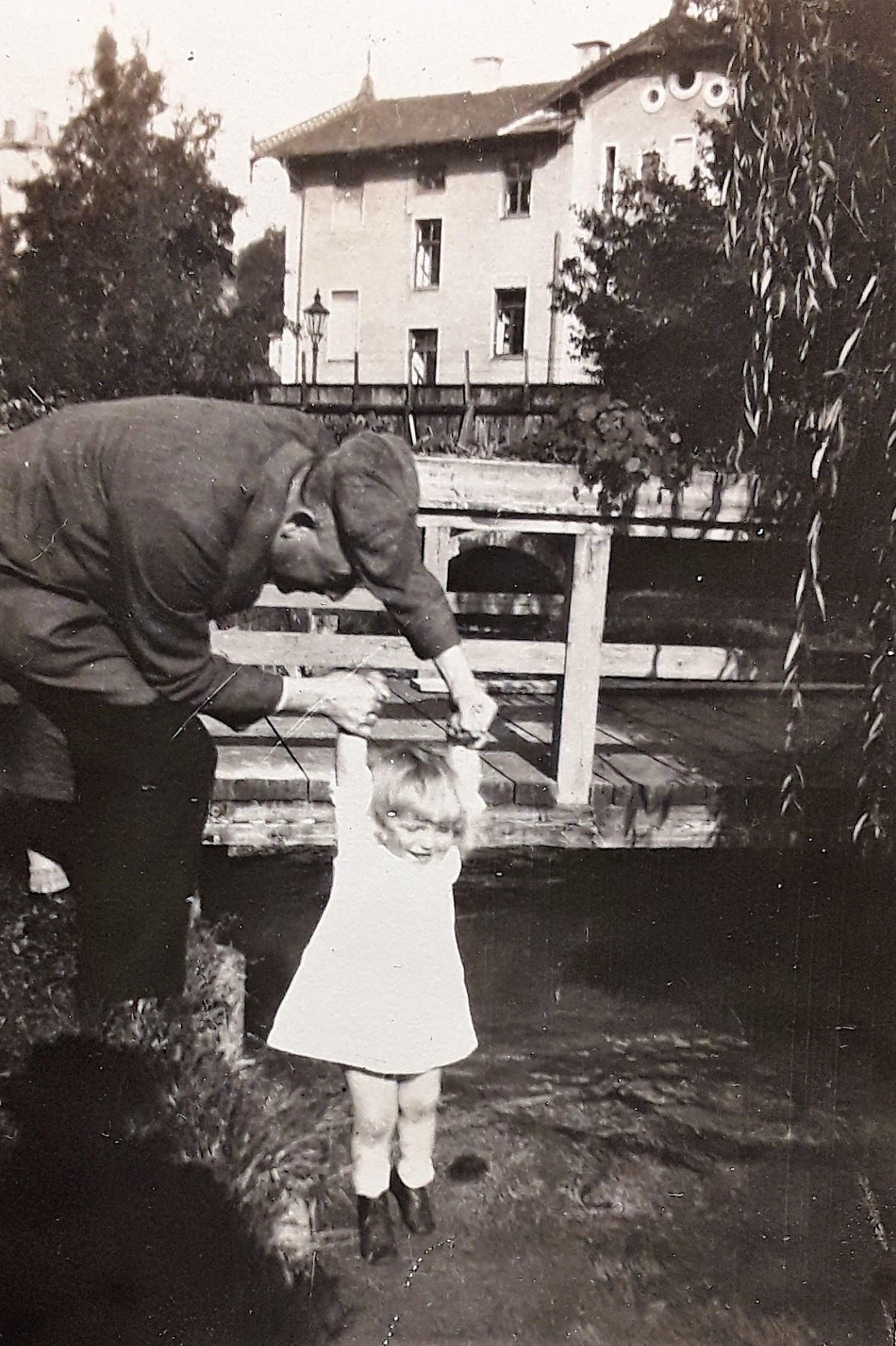 Kurz vor dem Ertrinkungstod: Gottfried Grandel mit seinem zweitgeborenen Sohn Gottfried am das Grundstück durchlaufenden Eisbach - Sommer 1921 (Fotografie im Privatbesitz)