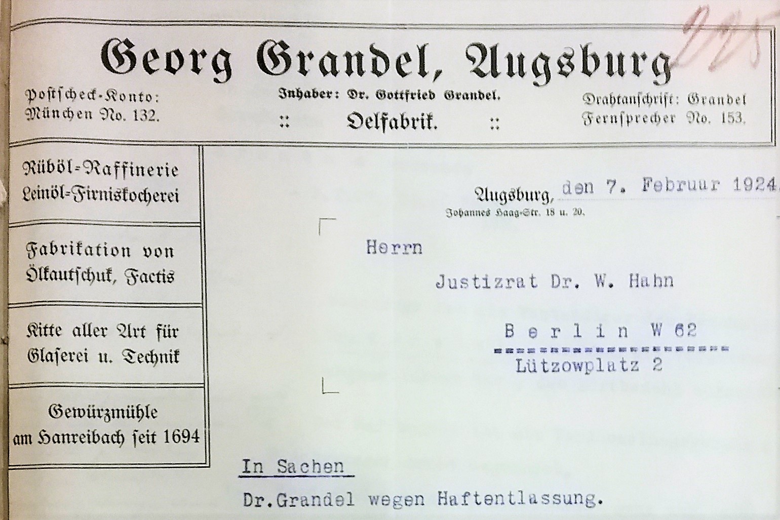 "Die Firma Georg Grandel, Ölfabrik Augsburg, beschäftigt z. Zt. (-Januar 1924-) 8 Arbeiter und 3 kaufmännische Angestellte. Der Alleininhaber der Firma, Herr Dr. Gottfried Grandel, ist die Seele des ganzen Unternehmens; er leitete den schwierigen, chemischen Betrieb persönlich, führte auch alle Analysen, Versuche und Untersuchungen der Rohstoffe, Halb- & Fertigfabrikate stets selbst aus. Er allein kennt die Herstellungsverfahren, weil eigene Erfindung. Die kaufmännische Leitung und die Arbeiterschaft können ohne ihn nur kurze Zeit weiter machen.(...) Die Geschäftsführung ist infolge der Zeitumstände sehr schwierig; der unterzeichnende, noch jugendliche Prokurist (-Josef Rupp-) der Firma (29 Jahre alt) entbehrt sehr der überlegenen Erfahrung des Chefs.(...)