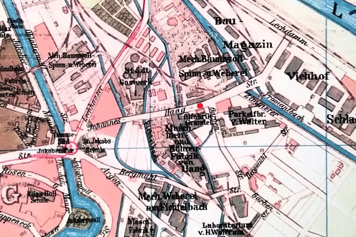 "Ein Kind ertrunken - Gestern vormittags 10 Uhr fiel im Garten des Anwesens Johannes-Haag-Straße 20 das 2 1/4 Jahre alte Fabrikbesitzerkind Gottfried Grandel in den durch den Garten fließenden Eisbach des Hanreibaches und ertrank." (Staats- und Stadtbibliothek Augsburg: Augsburger Neueste Nachrichten, Nr.216, S.4 v. 17.6.1921)