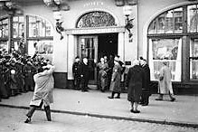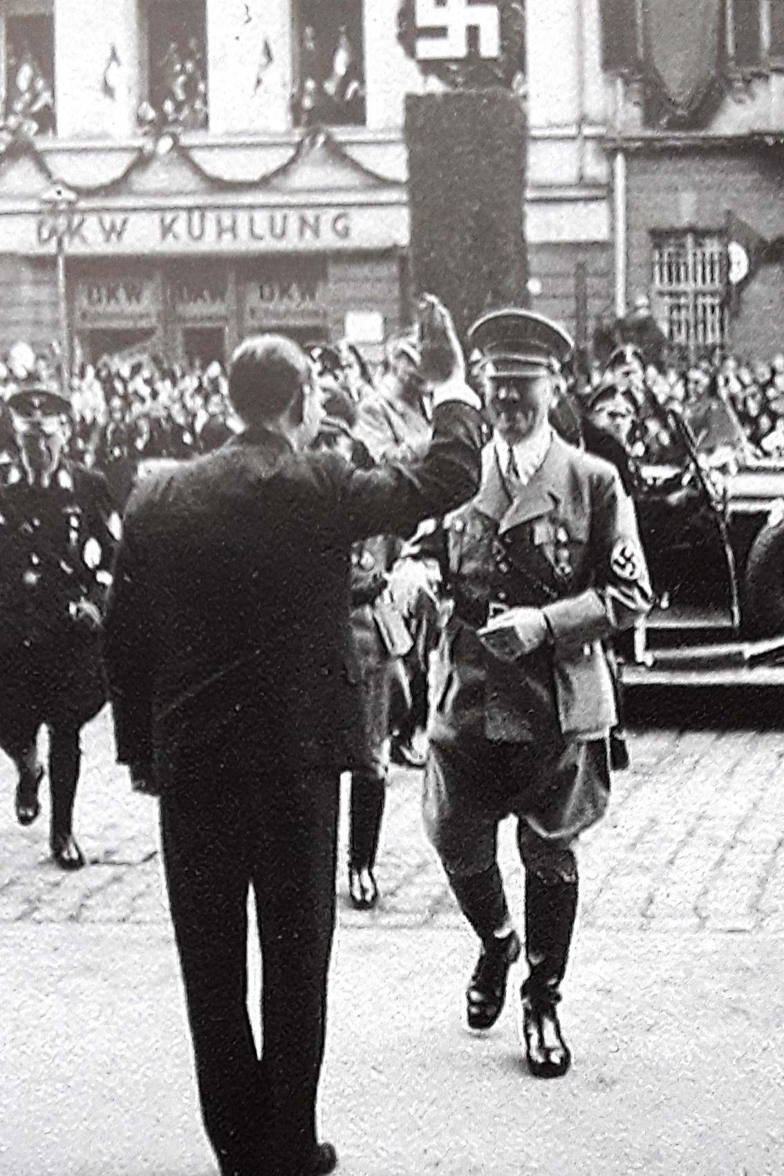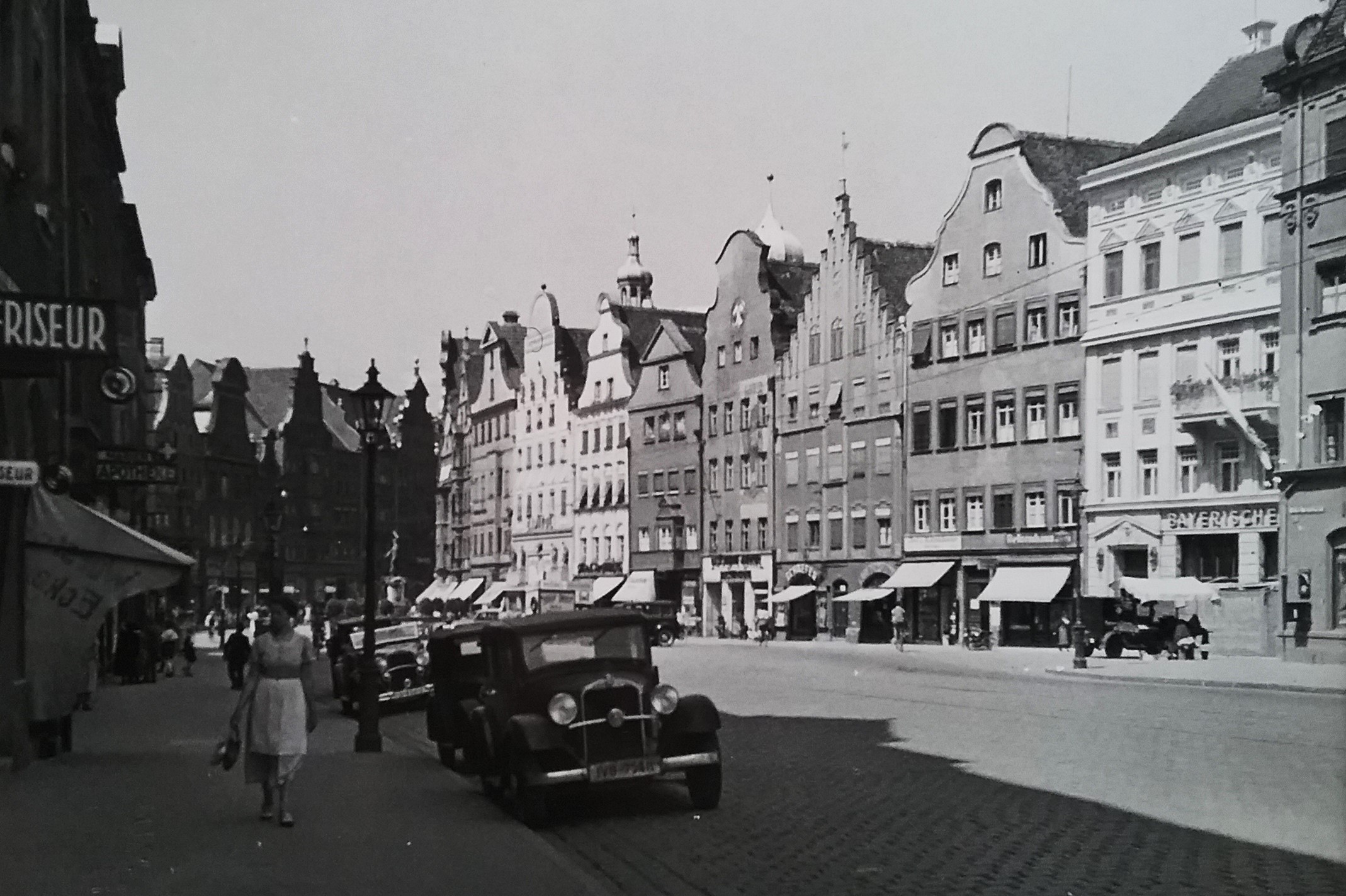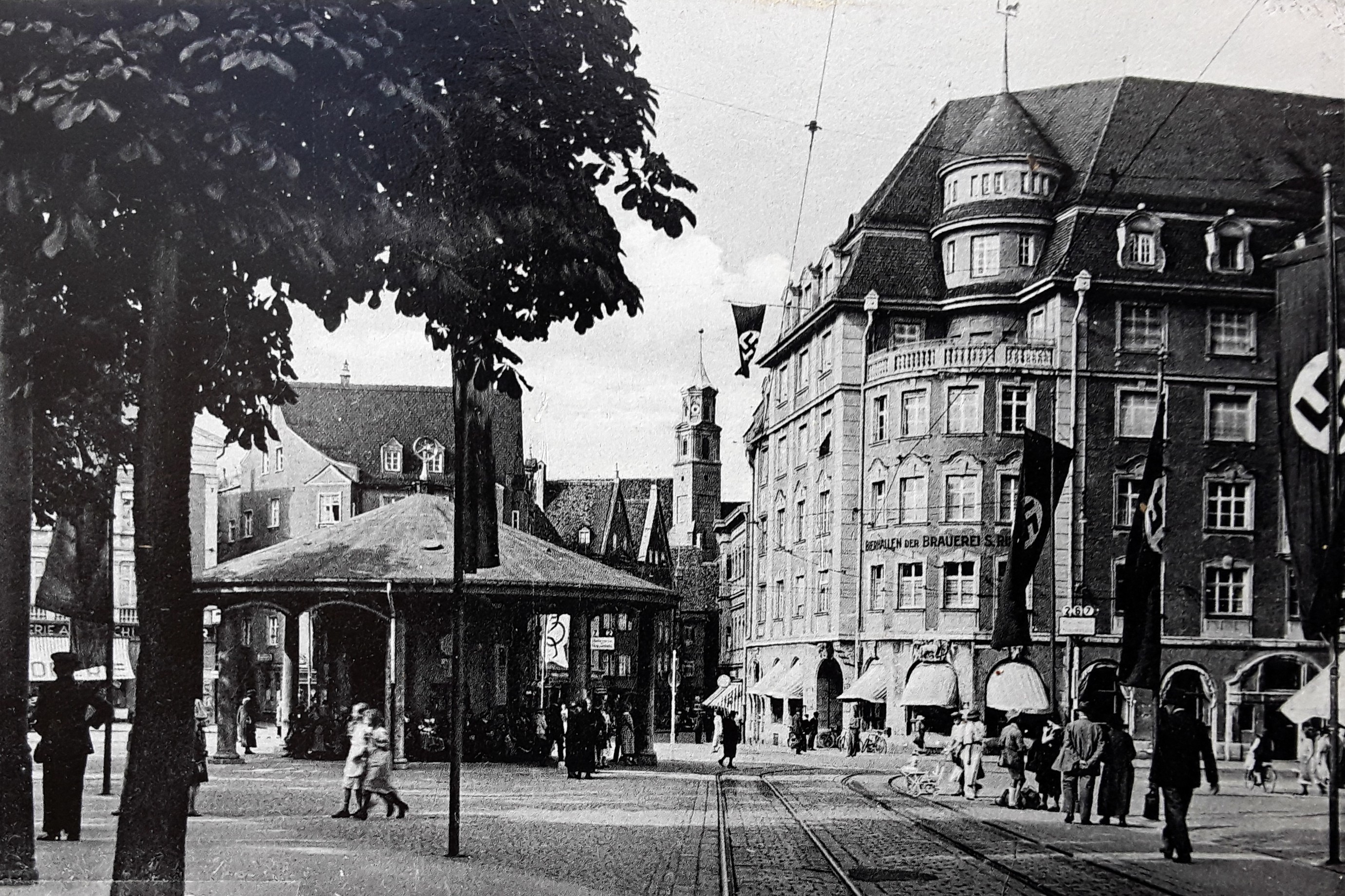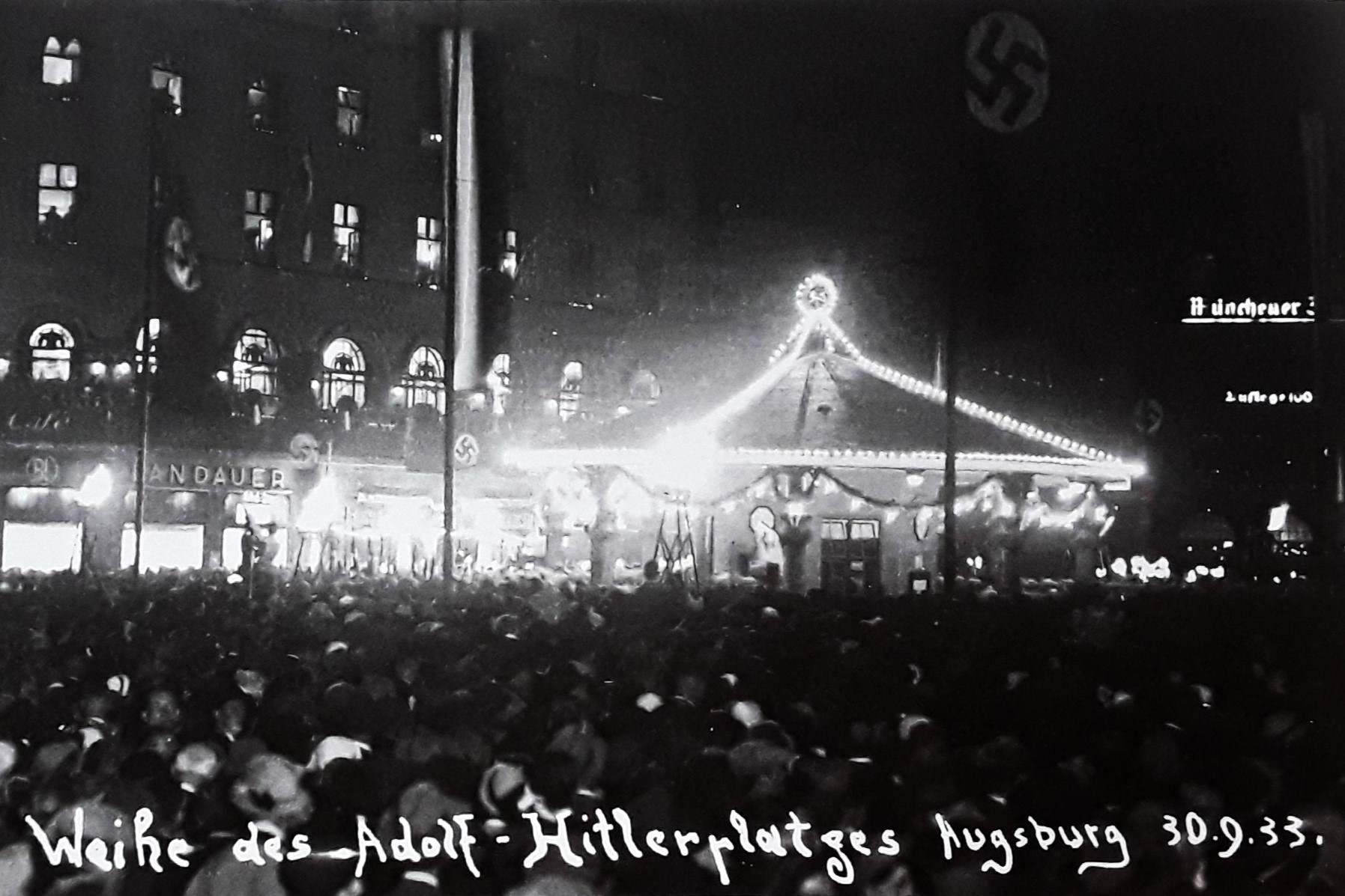 Direkt vor dem jüdischen Kaufhaus Landauer: Umbenennung in Adolf-Hitlerplatz - 30. September 1933 (Nerdinger: "Bauten erinnern - Augsburg in der NS-Zeit", S.70 - 2012 + FS StadtAA_K711)