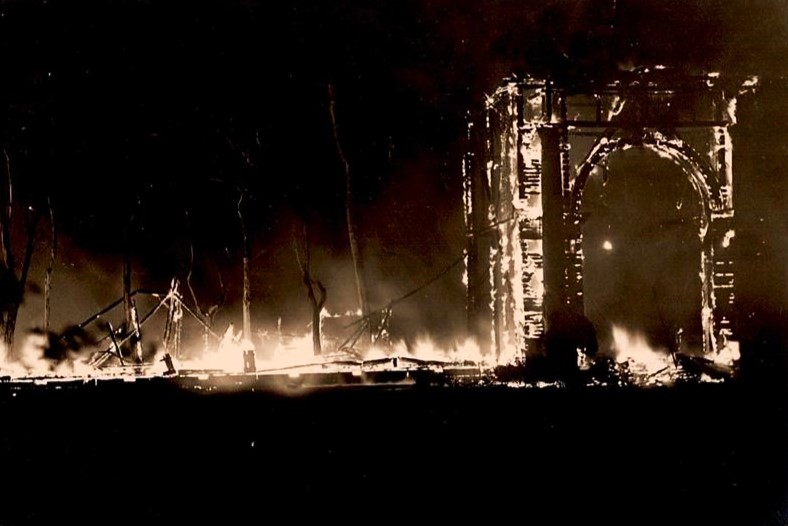 Auch die parallel zur Lindenstraße stehende Schafstallung des Kirchbauerhofs der Bächinger Familie Grandel wird vom Brand erfasst.