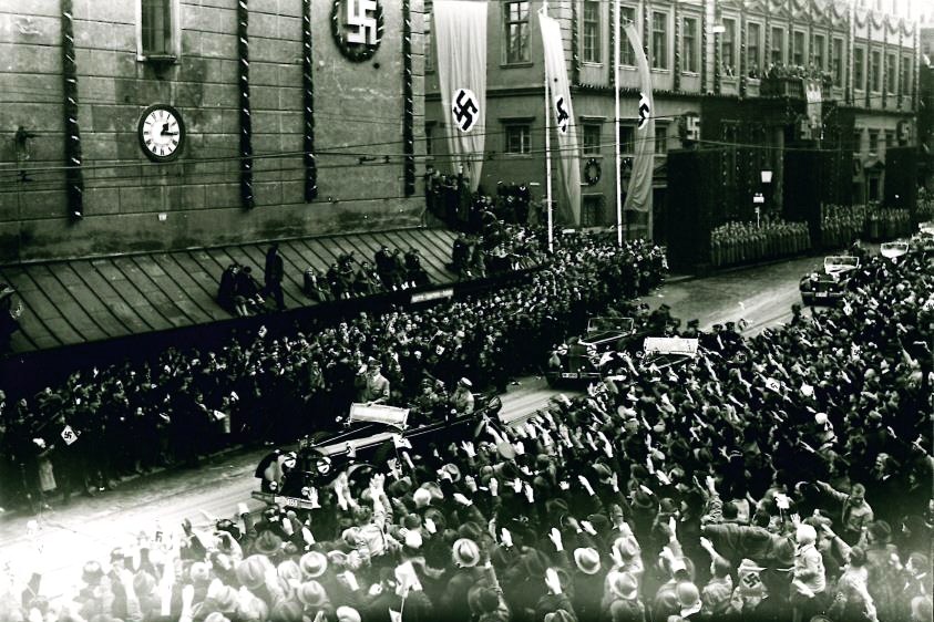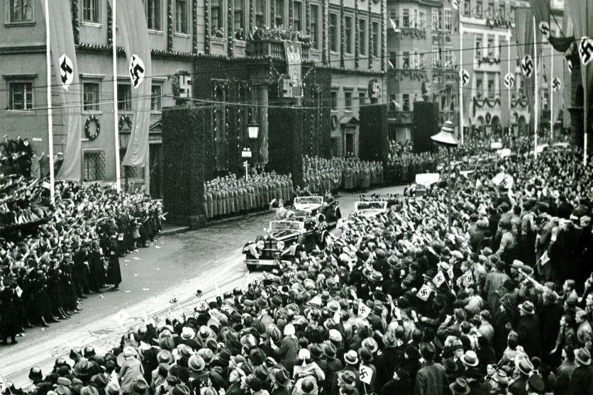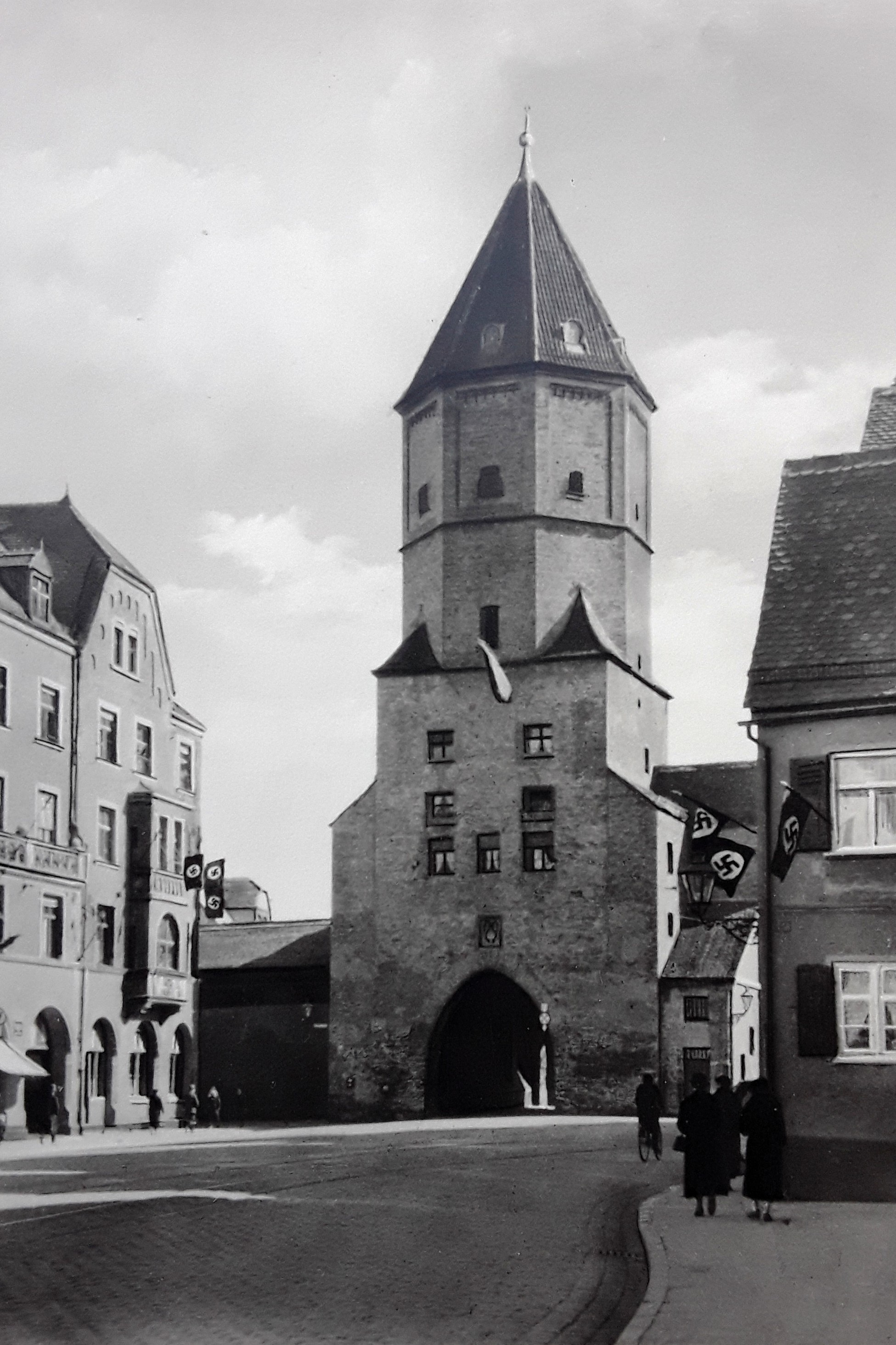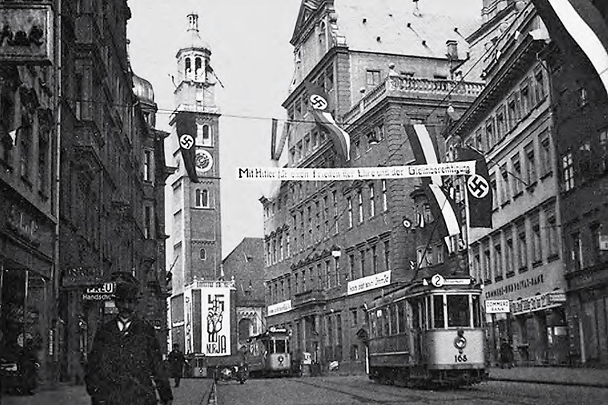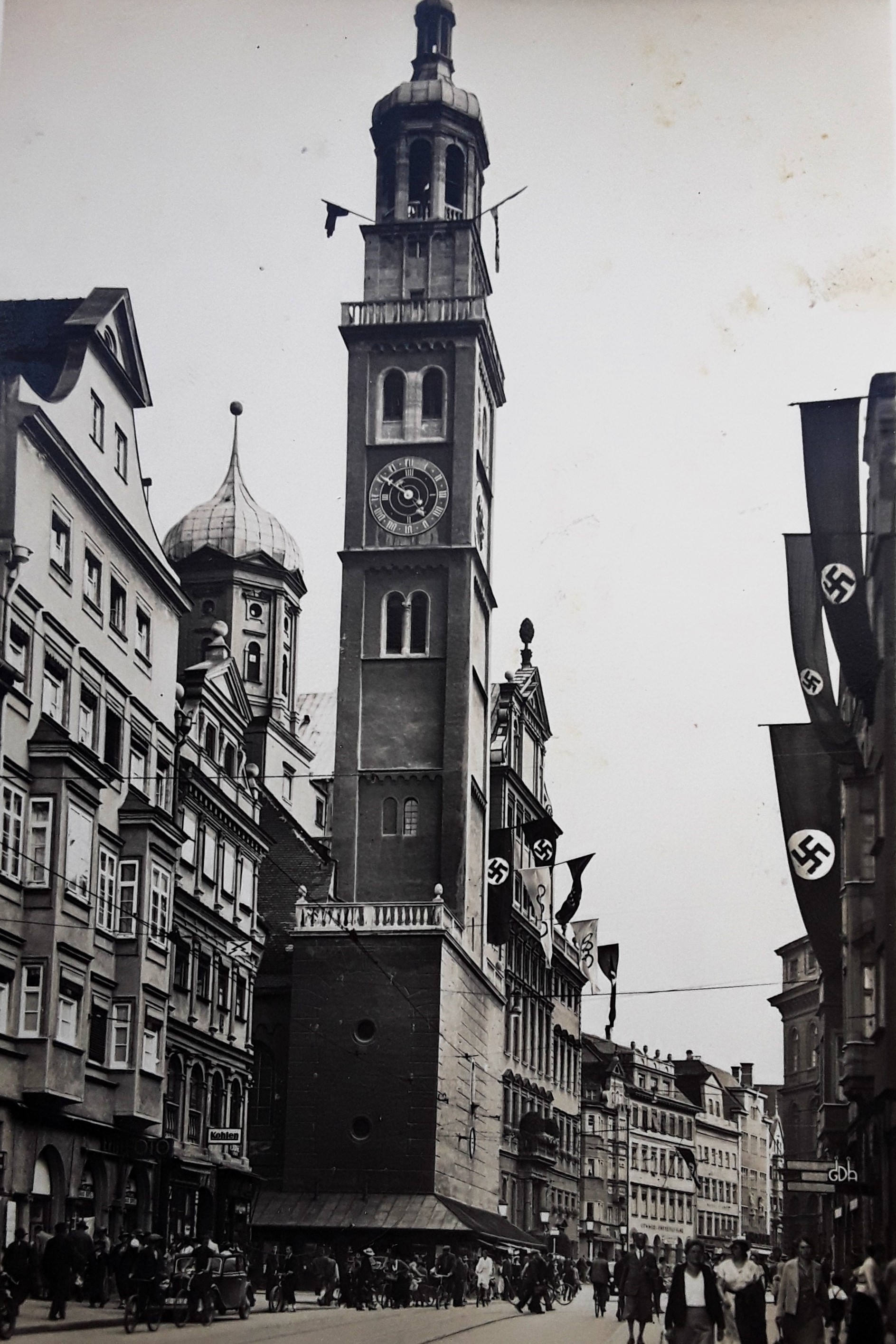 Seit 1933 weht auch vom Augsburger Perlachturm die Hakenkreuzfahne. Dem zukünftigen Gauleiter Karl Wahl und seiner Frau überkommt am Wahlabend das "große Weinen. Die Freude ist unbeschreiblich", berichtet er später über diesen Moment, als Adolf Hitler in Berlin zum Reichskanzler gewählt wird. Karl Wahl "sieht in Hitlers Partei die deutsche Freiheitsbewegung schlechthin, das Programm 'Wie kann unser am Boden liegendes, geknechtetes Vaterland wieder in Ehren entstehen und zu neuem Ansehen in der Welt kommen?' empfindet er als Offenbarung", berichtet Gerhard Römer in seinem Buch "Es gibt immer zwei Möglichkeiten ..."