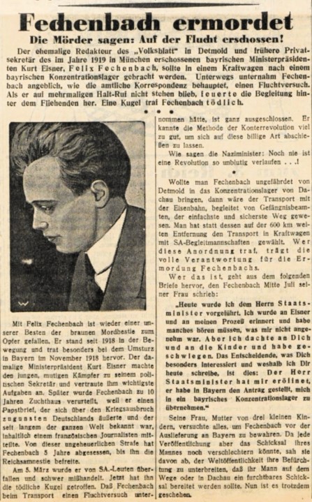 "Als Journalist, engagierter Demokrat und Schriftsteller war er bereits bekannt, als er im Oktober 1929 verantwortlicher Redakteur der Detmolder sozialdemokratischen Tageszeitung 'Volksblatt' wurde. Als Jude, Sozialist und Pazifist und als Journalist, der in aller Offenheit und Schärfe Interna der Machteroberungsstrategien der Nationalsozialisten seiner Leserschaft zugänglich machte und kommentierte, wurde er einer der entschiedensten und profiliertesten Gegner der Machthaber der NSDAP, die ihn nach der sog. Machtergreifung in Lippe mit aller Härte verfolgten. Seine Familie musste Felix Fechenbach in Sicherheit bringen, während er trotz allem in Detmold blieb. Er erhielt 1933 Redeverbot in öffentlichen und Schweigepflicht in Parteiversammlungen. Am 5. März 1933 wurde er von Nationalsozialisten überfallen und misshandelt. Am 11. März 1933 besetzten diese das Volkshaus als Sitz der Gewerkschaften, Redaktion des 'Volksblatt', der Konsumzentrale und als SPD-Geschäftsstelle. Felix Fechenbach wurde verhaftet und in sog. Schutzhaft genommen. Die Meldeunterlagen der Stadt zeigen den Vermerk vom 8. Juni 1933: 'In Schutzhaft. Frau und Kinder in Augsburg, Maximilianstr. 9 III bei Epstein.' Am 7. August 1933 wurde Felix Fechenbach mit dem Auto von Detmold nach Warburg gebracht. Von dort sollte er mit der Bahn nach Dachau überstellt werden. Bei dieser Überführung durch den SA-Obertruppführer Friedrich Grüttemeyer, die Sturmführer Karl Segler und Josef Focke und den SS-Mann Paul Wiese wurde er im Kleinenberger Wald bei Scherfede ermordet. Er wurde von zwanzig Kugeln getroffen und schwerverletzt und bewusstlos auf einem Pferdefuhrwerk nach Scherfede gebracht, wo er am Abend starb. Seiner Frau wurde mitgeteilt, er sei 'bei einem Fluchtversuch erschossen' worden.(...) Irma Fechenbach floh mit ihren Kindern im Sommer 1933 in die Schweiz. 1946 zog die Familie in die USA. Irma Fechenbach kehrte 1965 in die Schweiz zurück. 1973 verunglückte sie tödlich. Curt Fey lebte bis zu seinem Tod in den USA, Lotti Wiederkehr starb in der Schweiz. Hanni Sherman lebt in den USA." (gedenkbuch-detmold.de: Fechenbach, Felix)