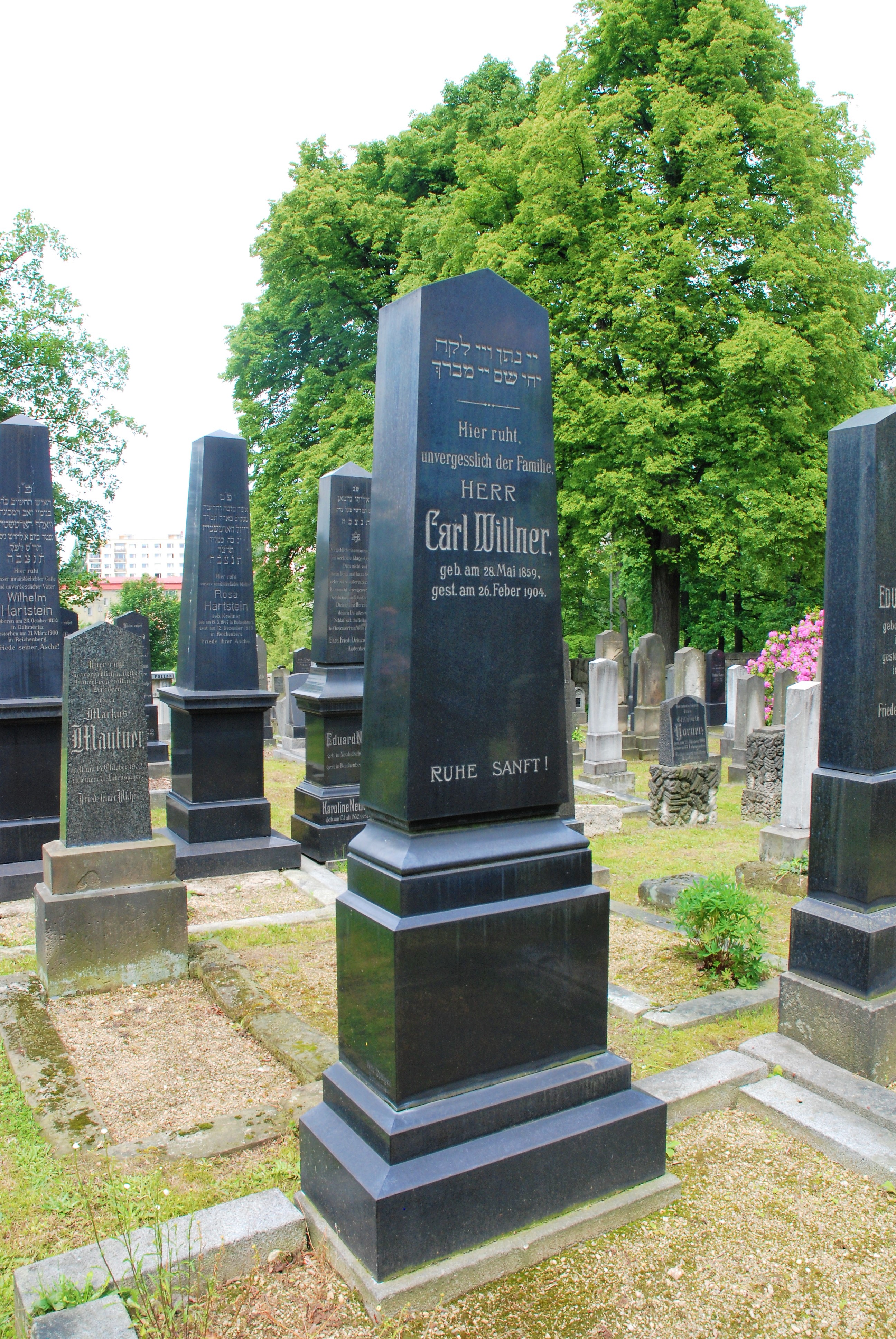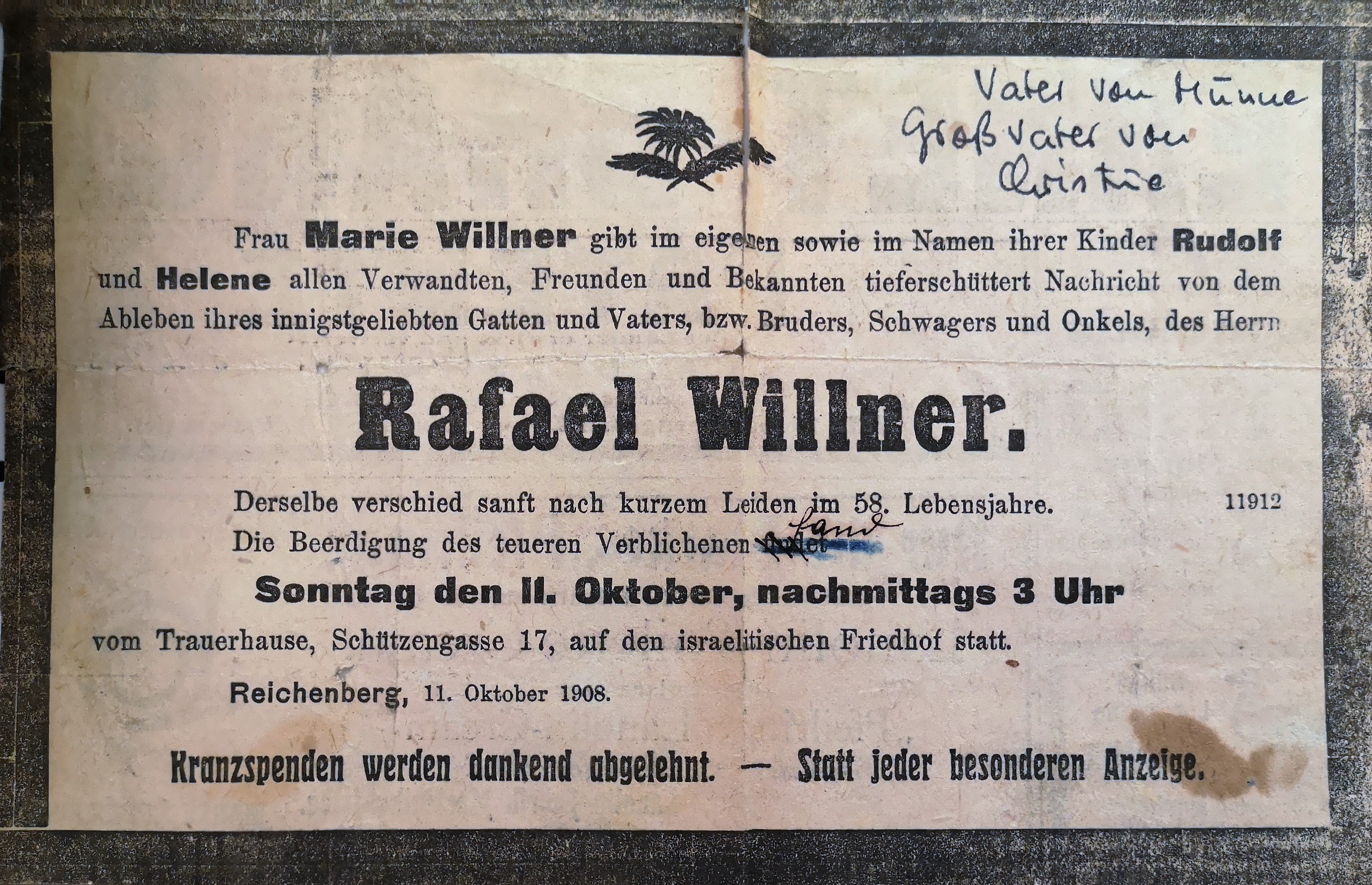 "Munne hatte mir gesagt, daß am jüdischen Friedhof geläutet werden muß, weil der immer geschlossen ist.(...) Wir läuteten und eine alte Jüdin machte uns auf. Innerhalb 4 Wänden, kann man fast sagen, war dieser Friedhof. So klein. Wir fanden das Grab bald. Also, da schliefen meine nächsten Vorfahren. Auf dem Reichenberger Judenfriedhof! Wir blieben bissel dort und machten bissel die welken Blätter weg. Und dann, nachdem wir der Frau 1 Krone gegeben hatten, gingen wir."