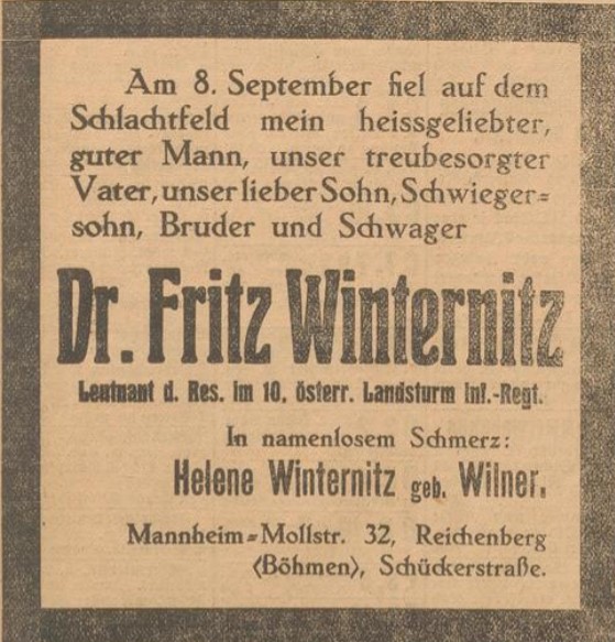 Nicht nur Helenes Ursprungsfamilie stammt aus Böhmen, auch die Angehörigen ihres ersten Mannes, des im 1. Weltkrieg gefallenen Dr. Fritz Winternitz, wohnen in Grottau, unweit von Reichenberg entfernt.