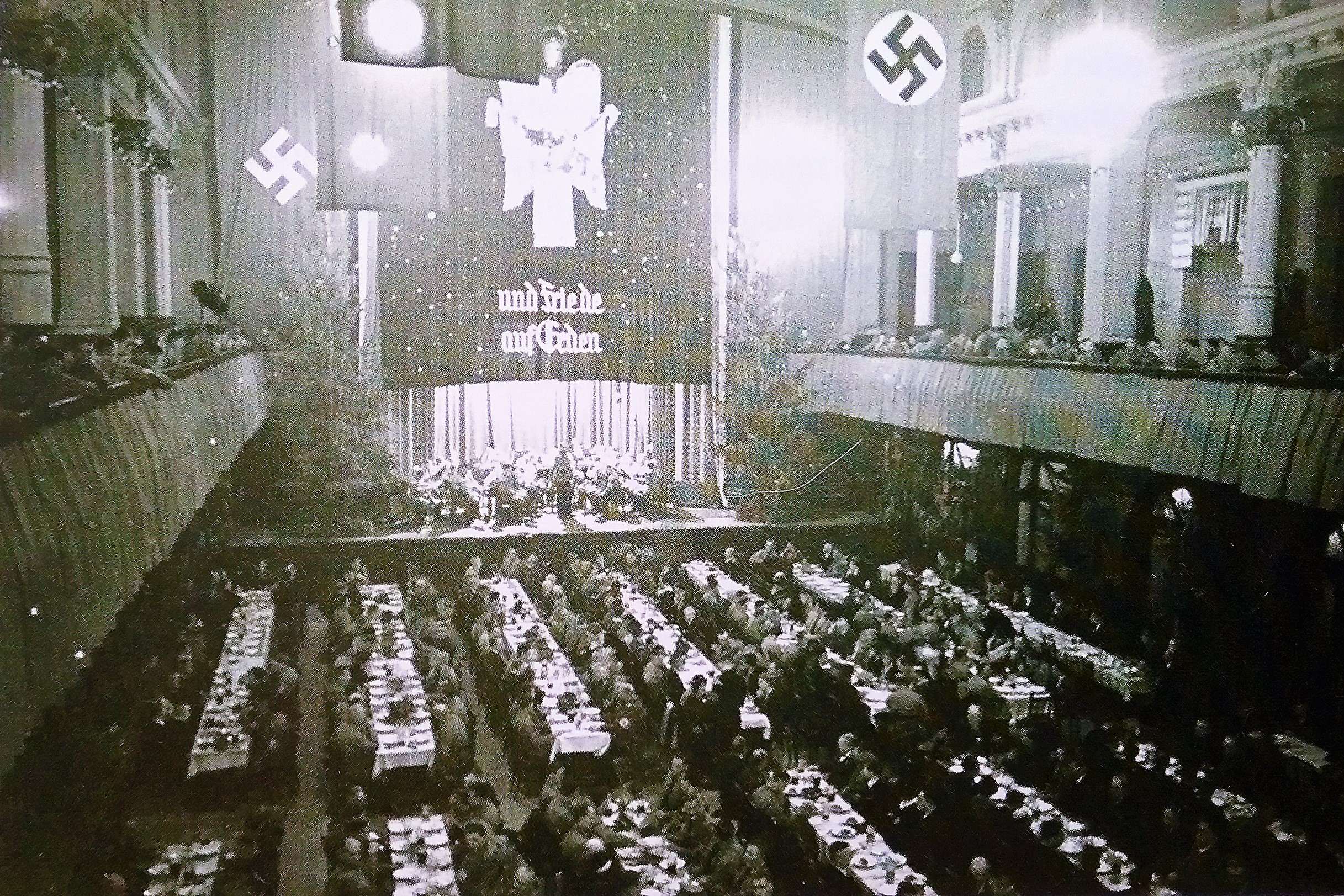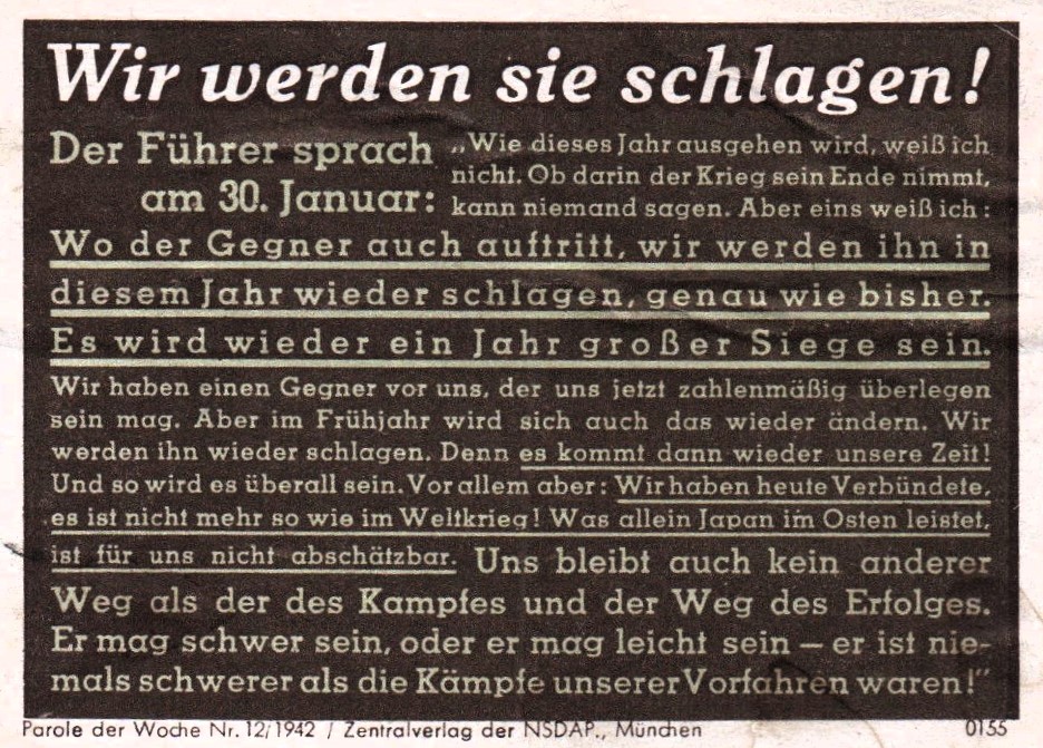 Während sich landesweit der Zusammenbruch der nationalsozialistischen Weltanschauung in aller Deutlichkeit abzeichnet, kommt der Verursacher derselben auf der letzten Gauleitertagung zu folgender Einschätzung:
