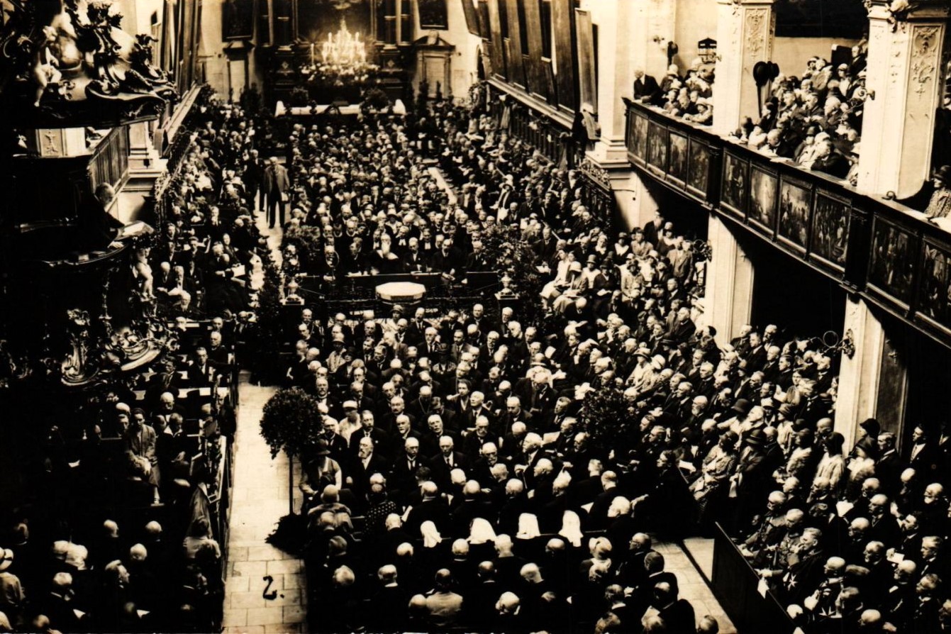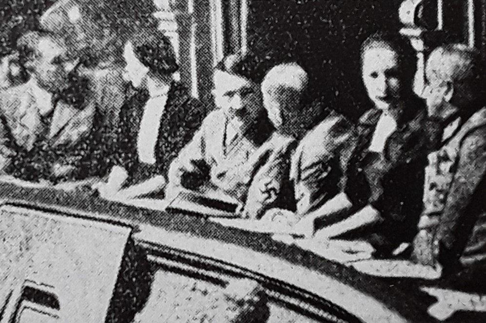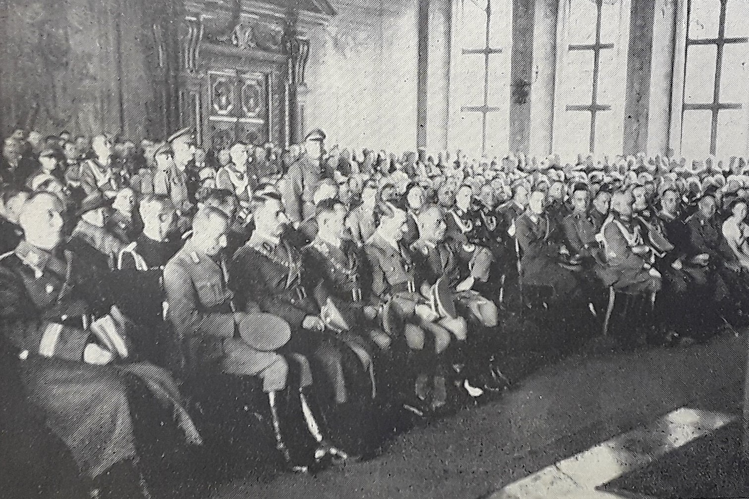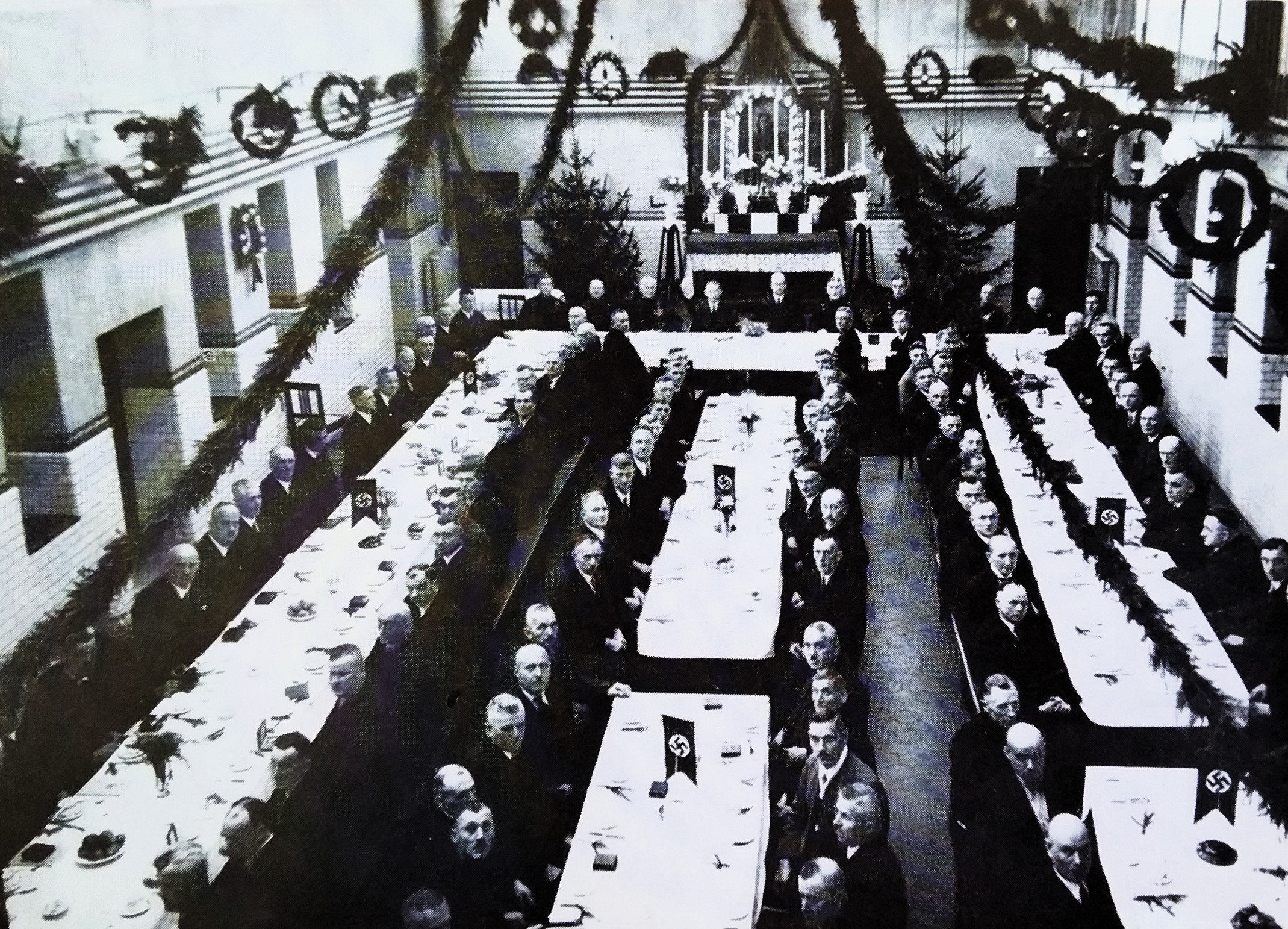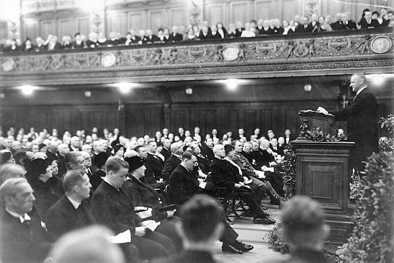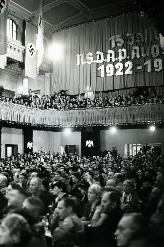 Totengedenken im Goldenen Saal: Augsburgs NSDAP-Fraktionsführer und spätere Zweite Bürgermeister Matthias Kellner bei seiner Rede zum Jahrestag der Machtübernahme - 9. März 1934 (Nerdinger/Wolf/Schmid: "Bauten erinnern - Augsburg in der NS-Zeit", S.8 - 2012 + "'Machtergreifung' in Augsburg", hinteres Umschlagbild und S.24/314 - 2008 + Stadtarchiv Augsburg, Schriftdokumentation 849)