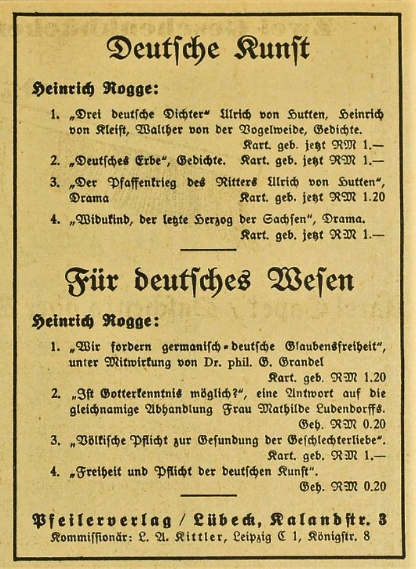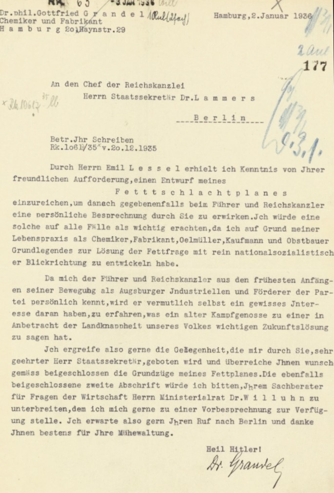 Es sind wohl nur wenige im Reiche, die das Gesamt des Wirkens für Heimat=National, und Volksgemeinschaftsleben=Sozialismus so in sich haben, wie ich,- und wohl auch nur wenige, die so mitten in gestanden haben - überall in den Brennpunkten seit dem 9.11.1918 - wie ich.- Ein kleines Büchlein: 'Rettende Wege! Richte für den Wirtschaftsbund', lege ich Ihnen hier bei als ein Teil-Beweis. Ich habe es verfaßt nach dem Tode Rathenaus (-24. Juni 1922-), als 'politisch' in Norddeutschland nicht mehr im Deutschen Sinne gewirkt werden konnte.- (-Heinrich Dolle wechselt daraufhin zum Augsburger Wohnsitz Gottfried Grandels über, der ihm dort über Monate geistige Unterstützung, Kost und Logis bietet-) Ein Blick hinein auf die rot angestrichenen Stellen wird überzeugen, daß ich der geistige Vorbereiter bin für Vieles, was heute körperhaft wird.- Das Büchlein ist (-vermutlich von Gottfried Grandel vollfinanziert-) in 10 000 Stück 1922 in Bayern verbreitet worden. Ebenso lege ich ein Gedichtchen bei, das Dietrich Eckart auf mich gemacht hat.- Das darin erwähnte Buch 'Aus Not zu Brot' hat der Führer auch gelesen.- Ich meine, da könntet Ihr meine Kraft doch auch noch gebrauchen, eben jetzt, da alle Kräfte so dringend nötig sind." (Kreis- u. Stadtarchiv Paderborn: Nachlass Heinrich Dolle, Kart.11)