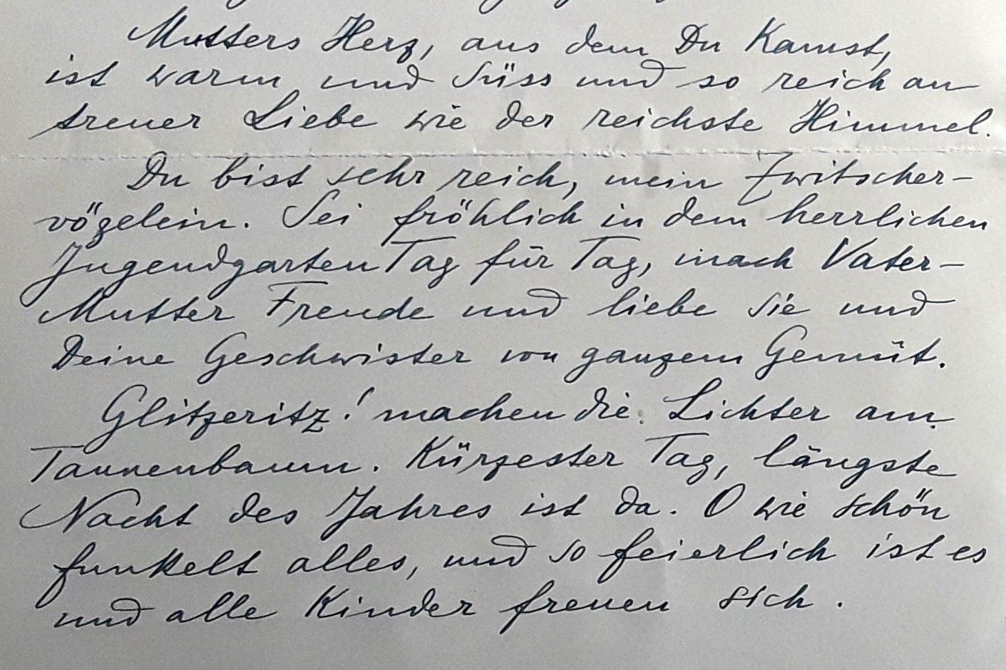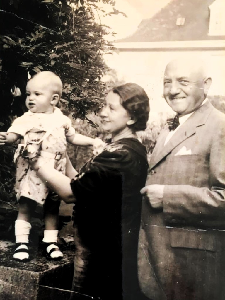 "Wie dramatisch war doch die Zeit noch vor Christophs Geburt (-am 9. März 1945-), die Vertreibung der Großeltern (...) aus Berlin nach Füssen und meine (-während der Schwangerschaft mit Christoph unternommene-) Flucht (-am 9. November 1944 von Berlin-) nach Augsburg, zuerst (-allein-) zu meiner (-bereits am 26. Februar 1944-) ausgebombten Mutter (-Helene Grandel-), dann nach Hirschegg im Kleinen Walsertal, wo wir als alte Skiurlaubsgäste unterschlüpfen konnten."