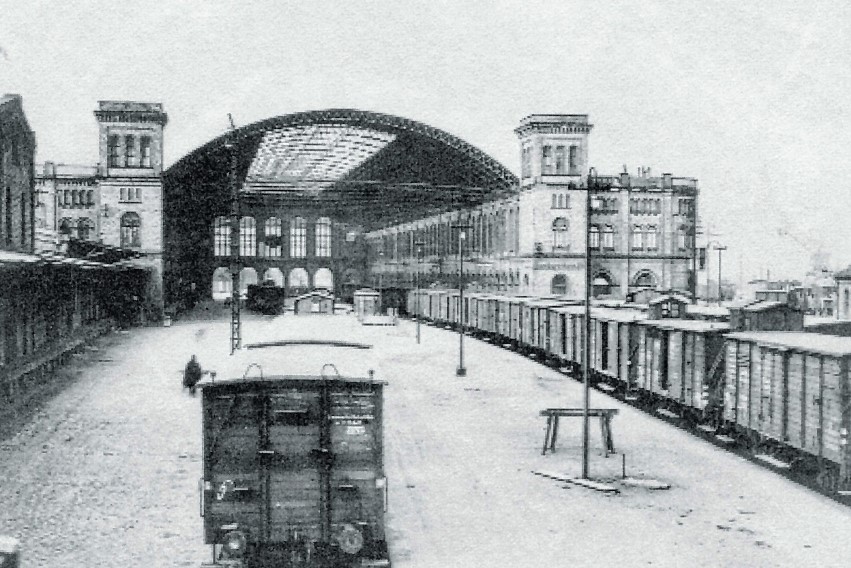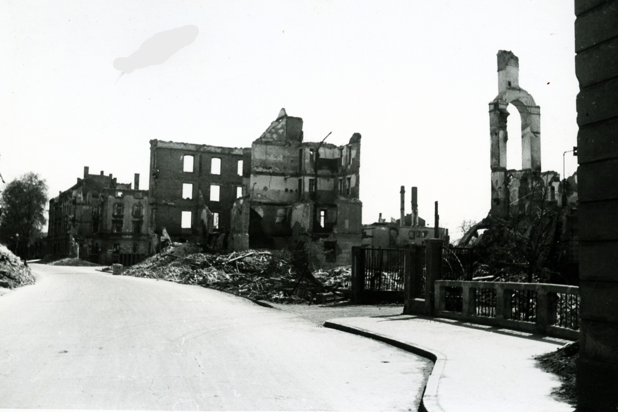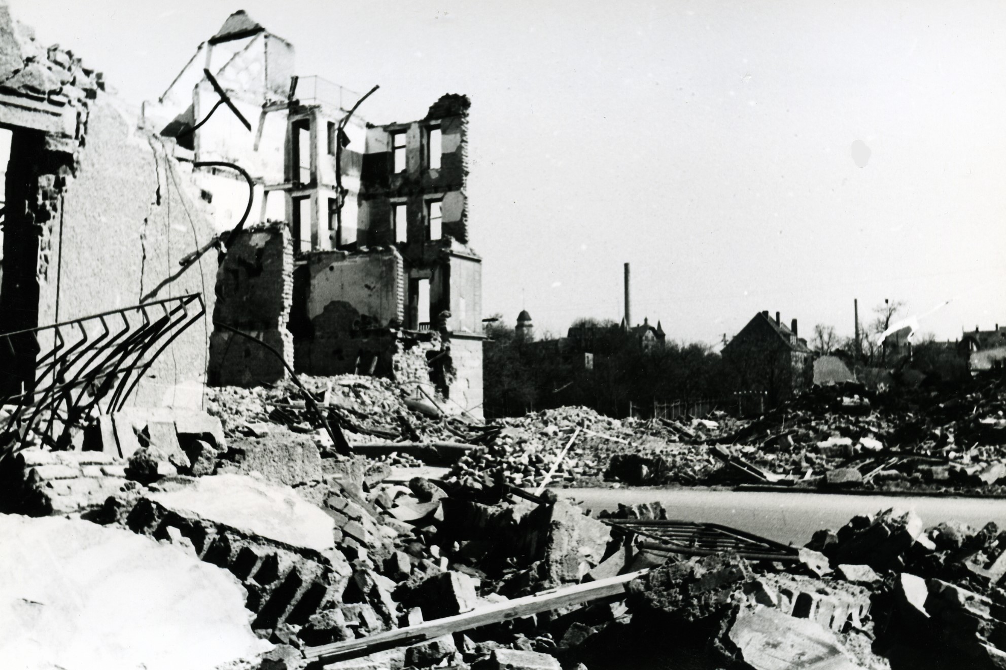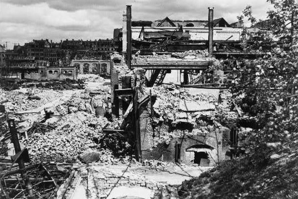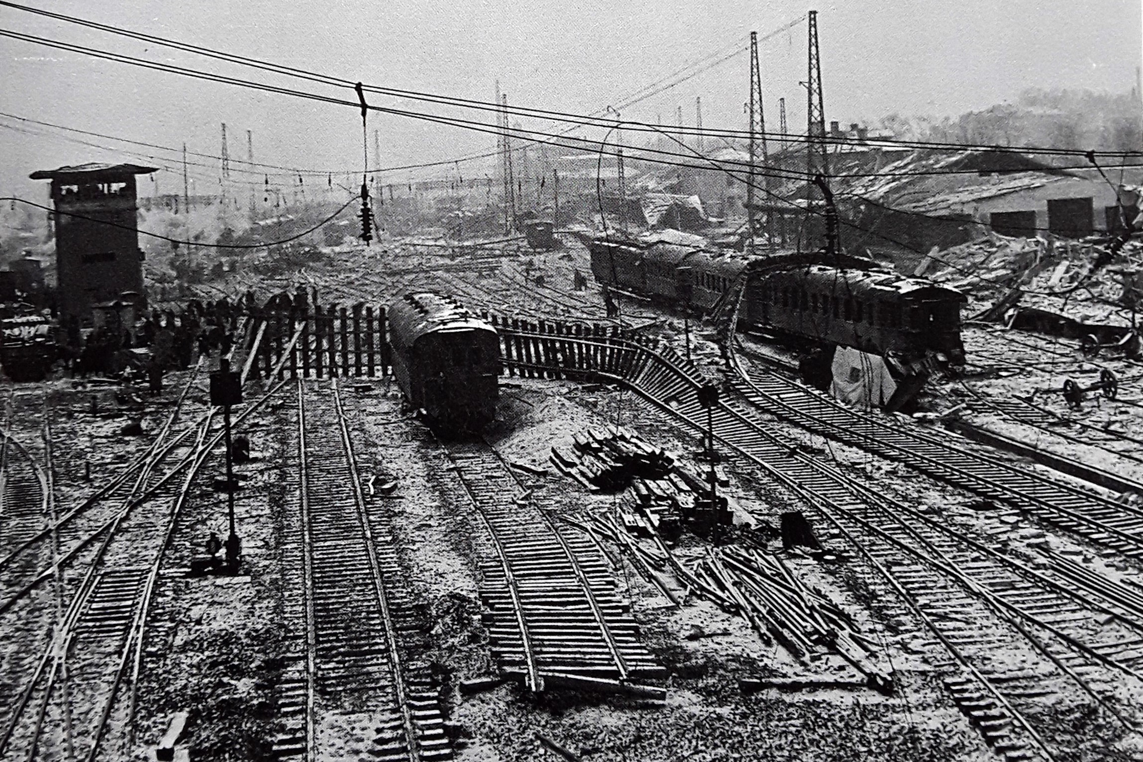 Stark beschädigt: Augsburger Bahnhofsgelände aus Blickrichtung Gögginger Brücke - 15. Januar 1945 (Deininger: "Augsburg - Portrait einer Fliegerstadt", S.92 - 1995)