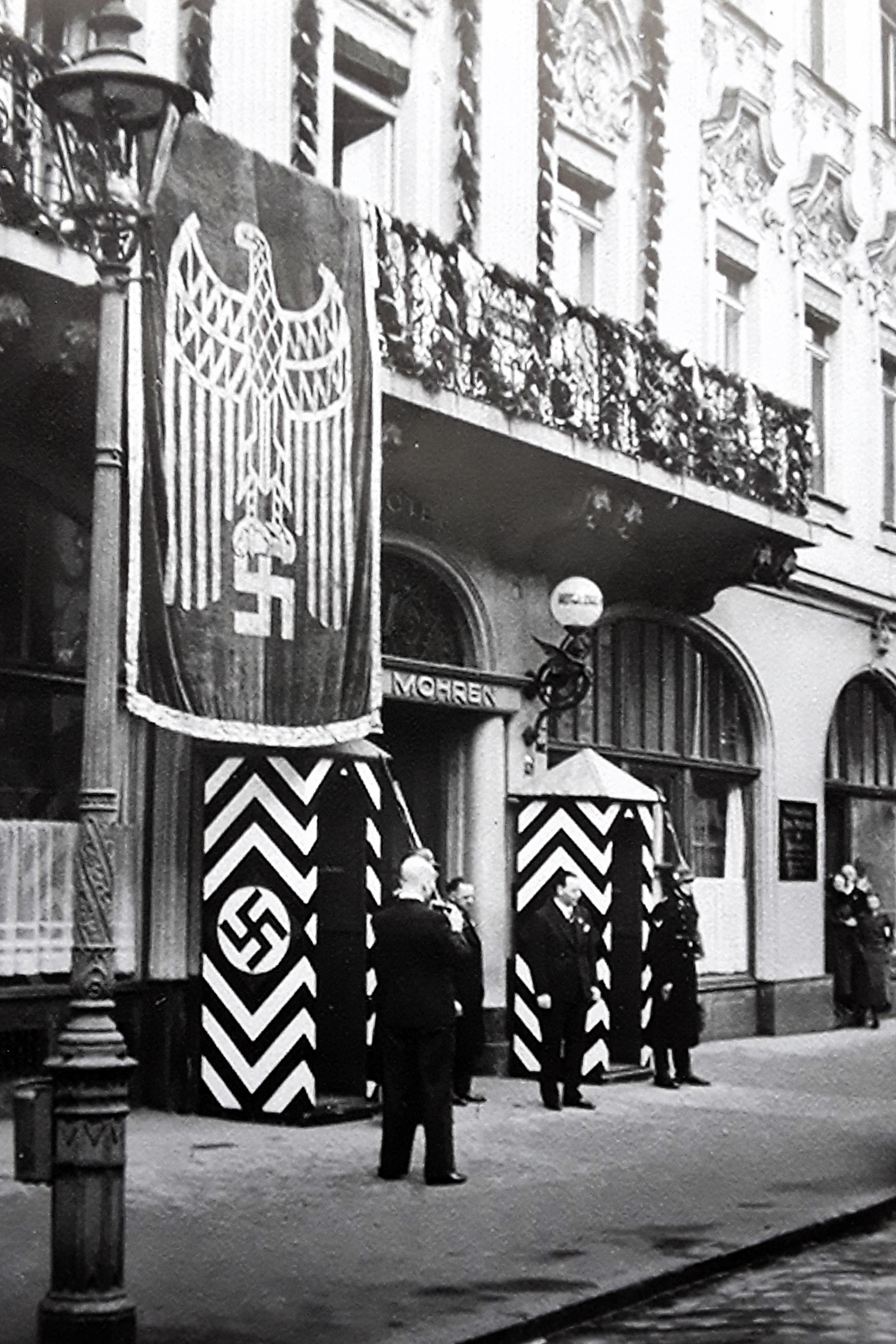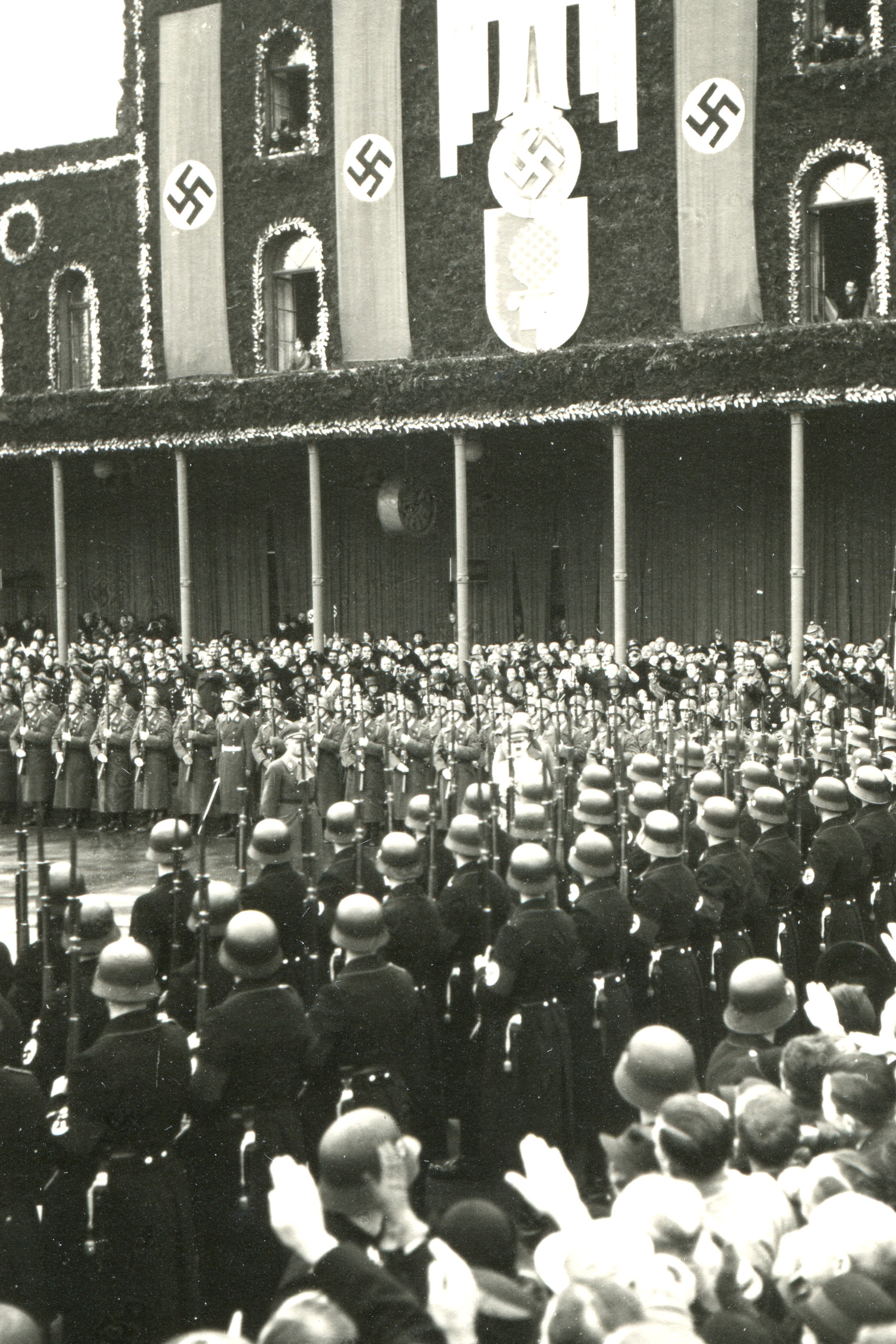 Nach 12 Jahren Kampf: Besetzung des Augsburger Rathauses (Westportal) durch SA und SS - 9. März 1933 (augsburger-allgemeine.de: "Die Revolutionäre in Haft, die Nazis im Kommen" v. 7.5.2019 / Fotografie im Besitz des Stadtarchives Augsburg)