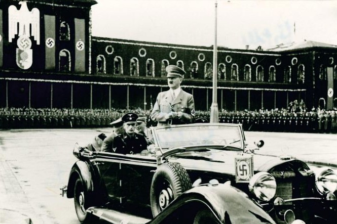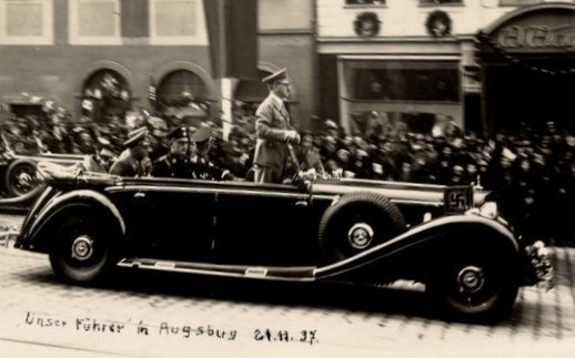 "Der Stadtrat hat in seiner Sitzung am 25.4.33 einstimmig Adolf Hitler als den Erwecker der inneren Kraft des Deutschen Volkes, als den Erneuerer und Umgestalter des Deutschen Staatslebens und den glühenden Verfechter der Ehre und des Freiheitswillens des Deutschen Volkes, zum Ehrenbürger der Stadt Augsburg ernannt. Um die Verdienste des Volkskanzlers auch nach außen und für dauernd zum Ausdruck zu bringen, ist die Umbenennung des Königsplatzes in Adolf-Hitler-Platz zu beschließen." (Nerdinger: "Bauten erinnern - Augsburg in der NS-Zeit", S.71 - 2012 + StadtAA, 45/631)