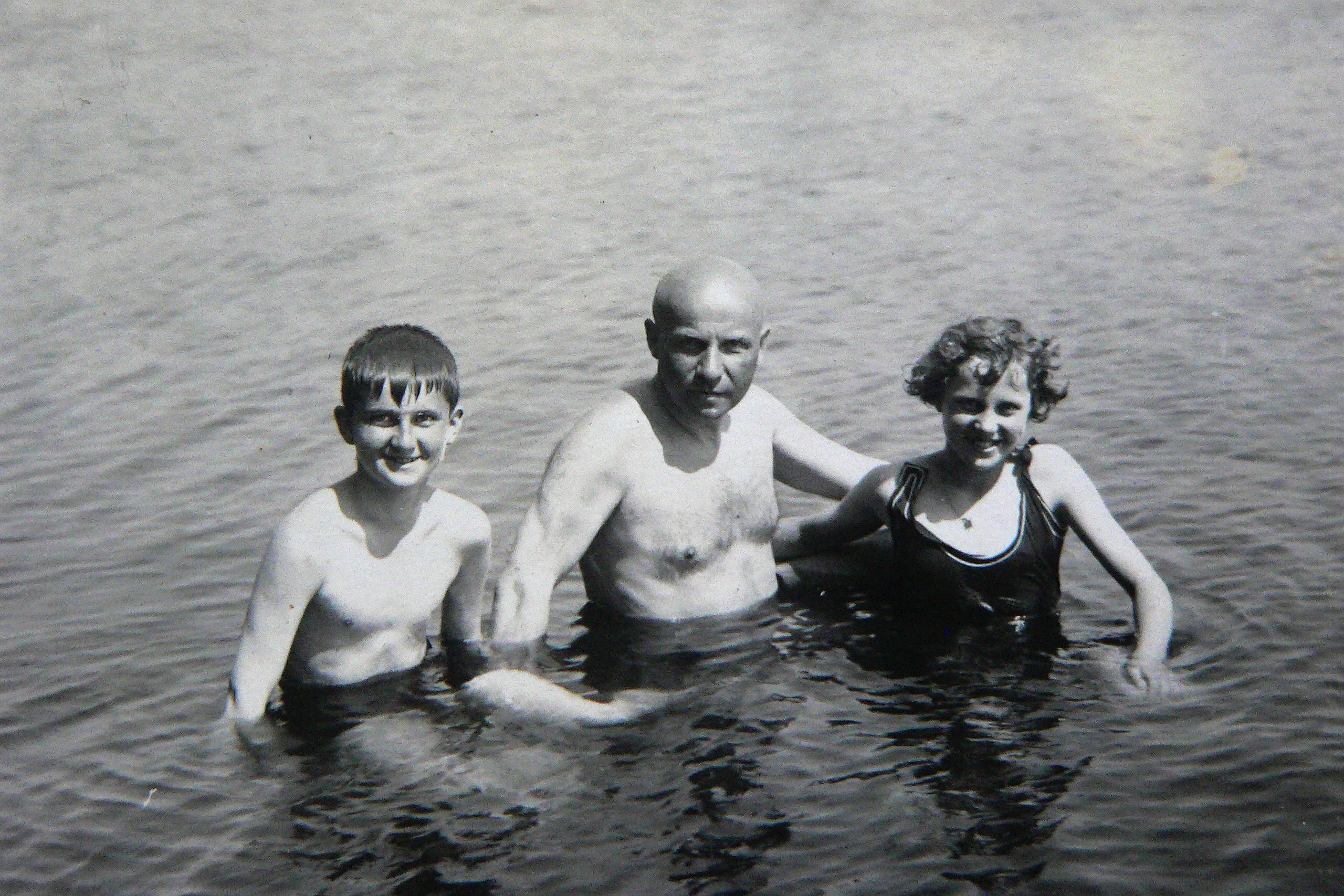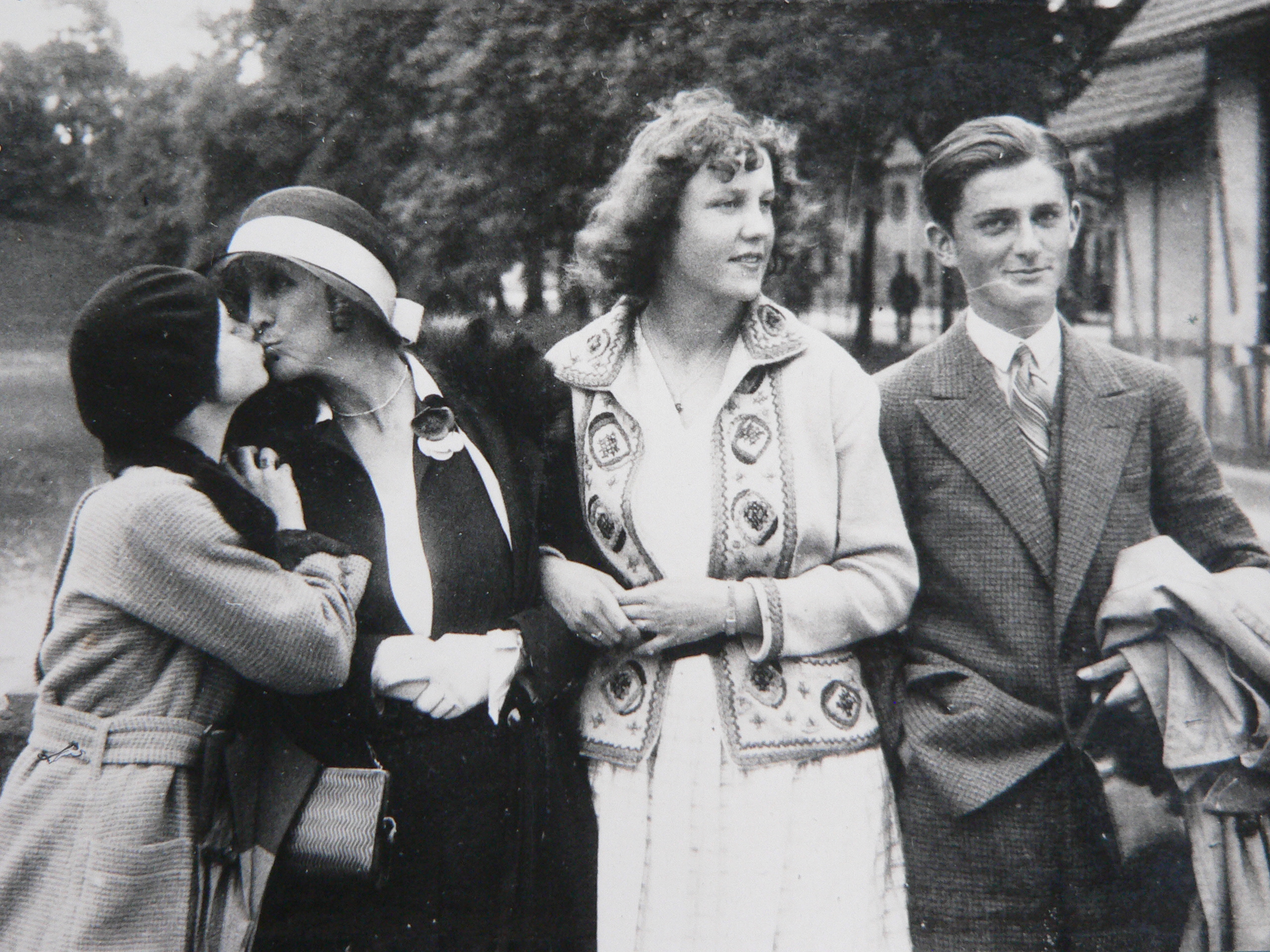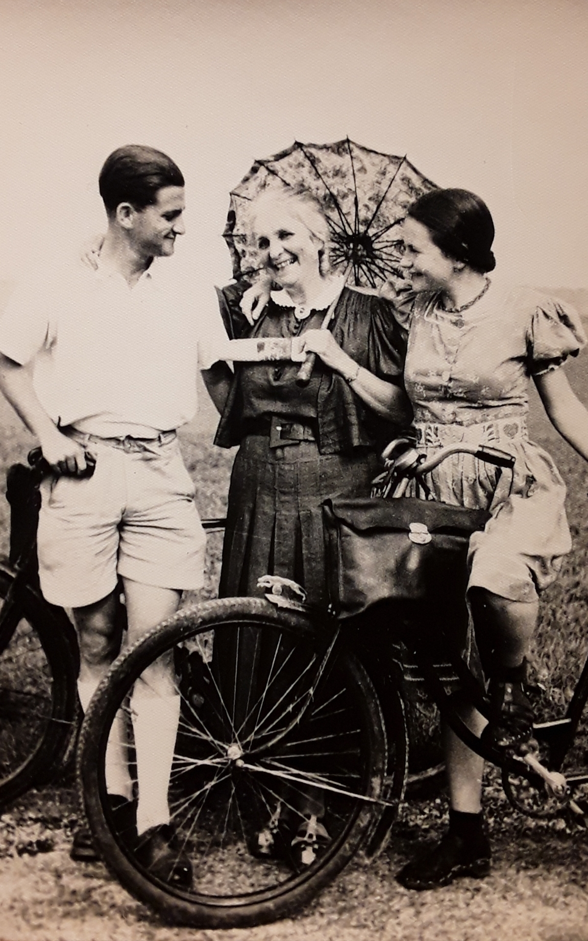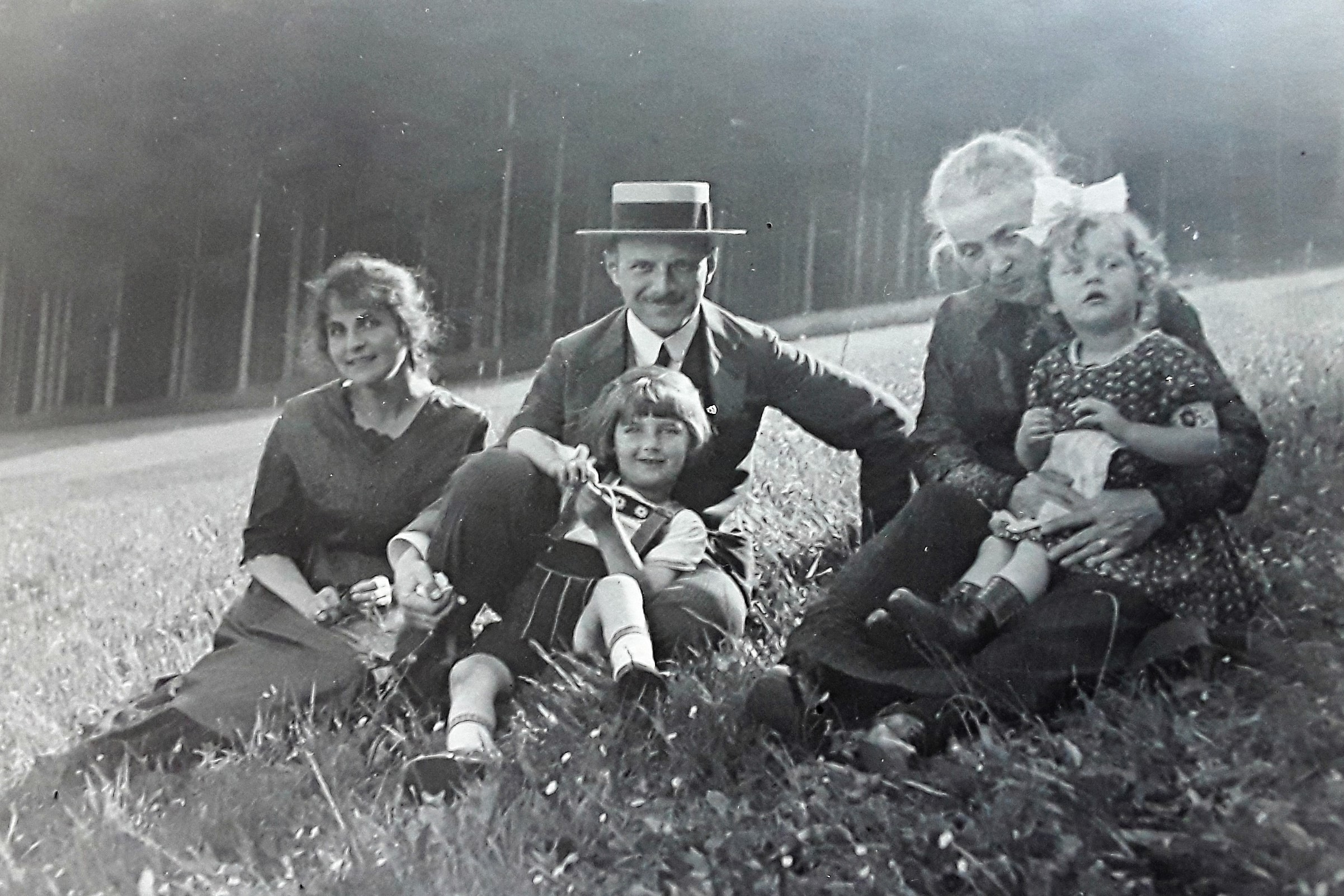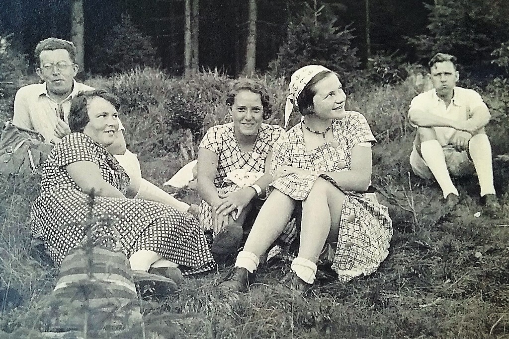 Spaziergang an die Talsperre von Reichenberg: Resi Willner, Karolina und Christl Grandel. Hinten rechts: Vermutlich der zu diesem Zeitpunkt 24-jährige Erwin Winternitz - 10. August 1934 (Fotografie im Privatbesitz)