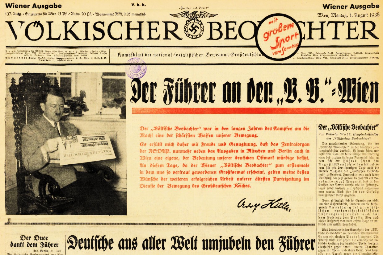 Am 30. Dezember 1933 schickt Adolf Hitler seinem früheren Weltkriegs-Vorgesetzten und Geschäftsführer des Völkischen Beobachters, Max Amann, einen Dankesbrief. In den Zuständigkeitsbereich des neuen Präsidenten der Reichspressekammer fällt nun die Gleichschaltung der nationalen Presseorgane. Adolf Hitler notiert: