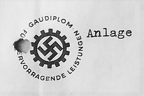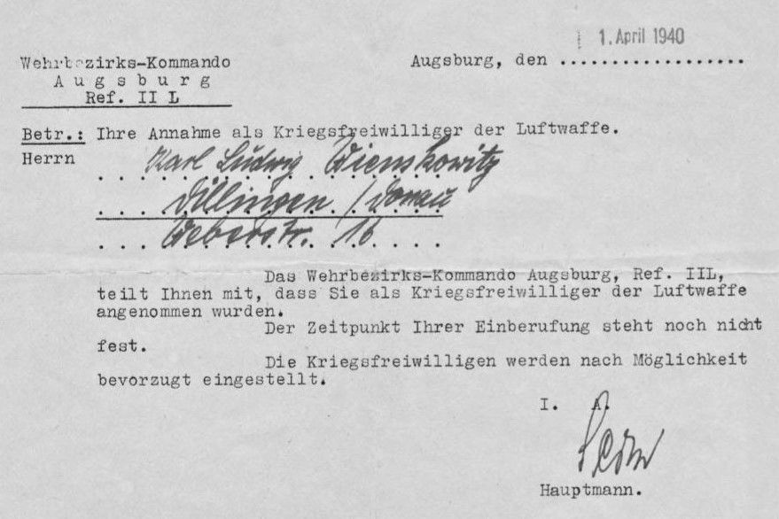 "Das dauernde Gemunkel hat sich bewahrheitet: Zur besseren Überwachung werden viele Mischlinge in Arbeitslager eingezogen. Auch ich bekomme die Aufforderung. Fest steht für mich, daß ich nicht gehe. Ich fahre (-zu den Eltern-) nach Füssen, bespreche dort und in Augsburg alles und komme dann mit Herta und Steffen, die gerad dort in Urlaub sind, zurück. Inzwischen ist der (-Berliner Gestapo-)Befehl da: Am 7.11.(-1944-) soll ich antreten."