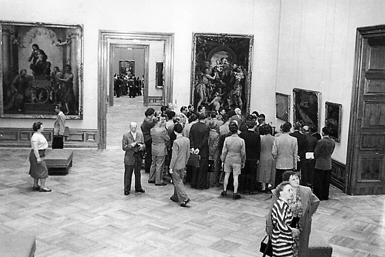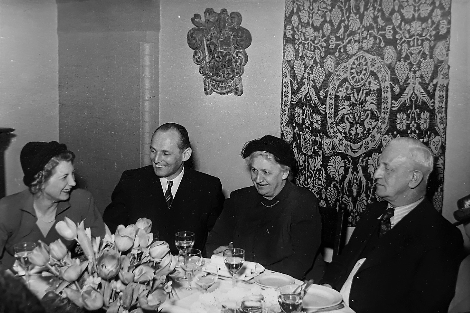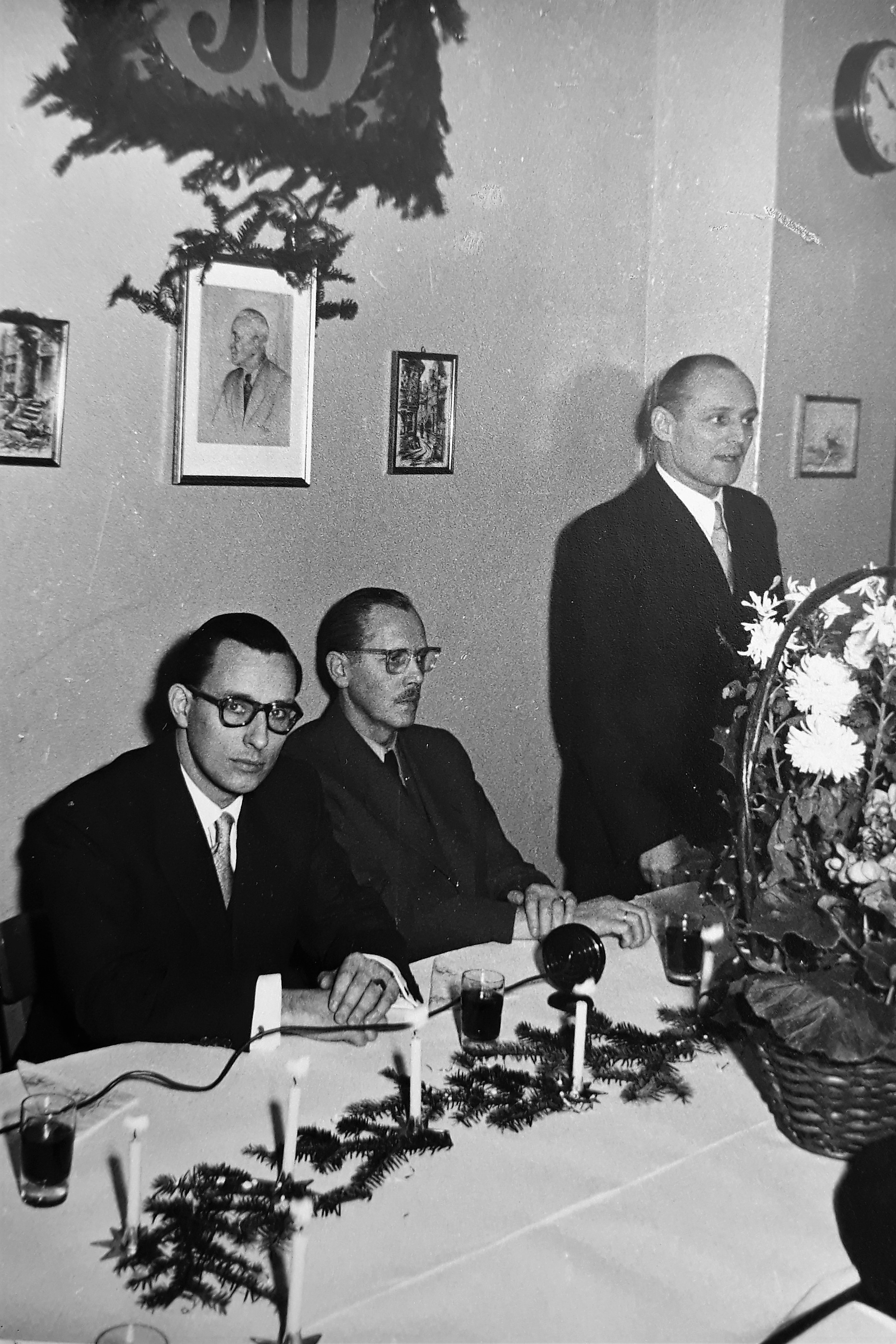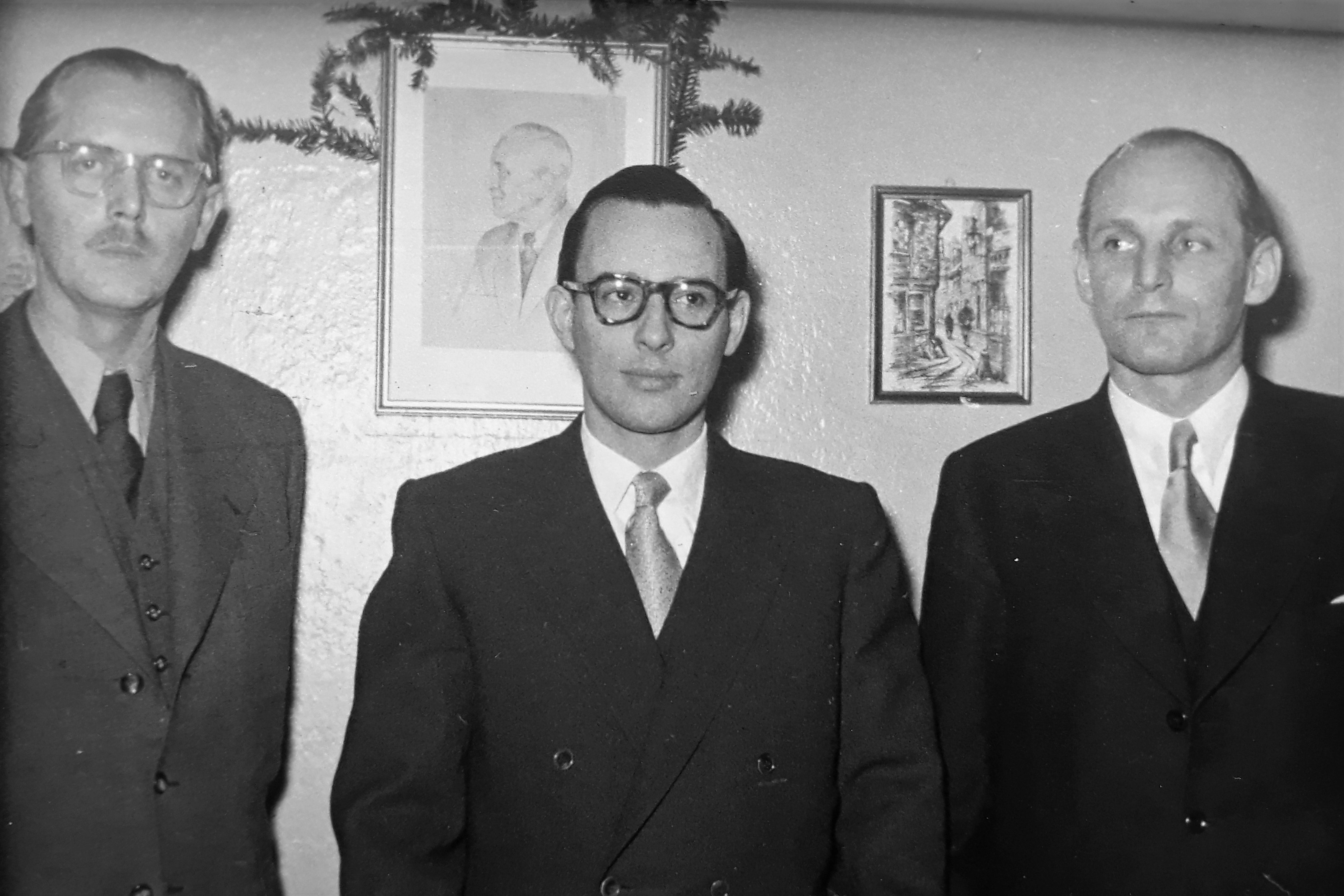 DOG-Inhaber Dr. Phil. Heinz Willy Lohmann, Nicolai Friedrich Peter Naeve und Dipl.-Ing. Alexander Snyckers vor der Portrait-Zeichnung des verstorbenen Seniorchefs Josef Rupp - Dezember 1952 (Fotografie im Privatbesitz der Hamburger Enkeltochter von J. Rupp)