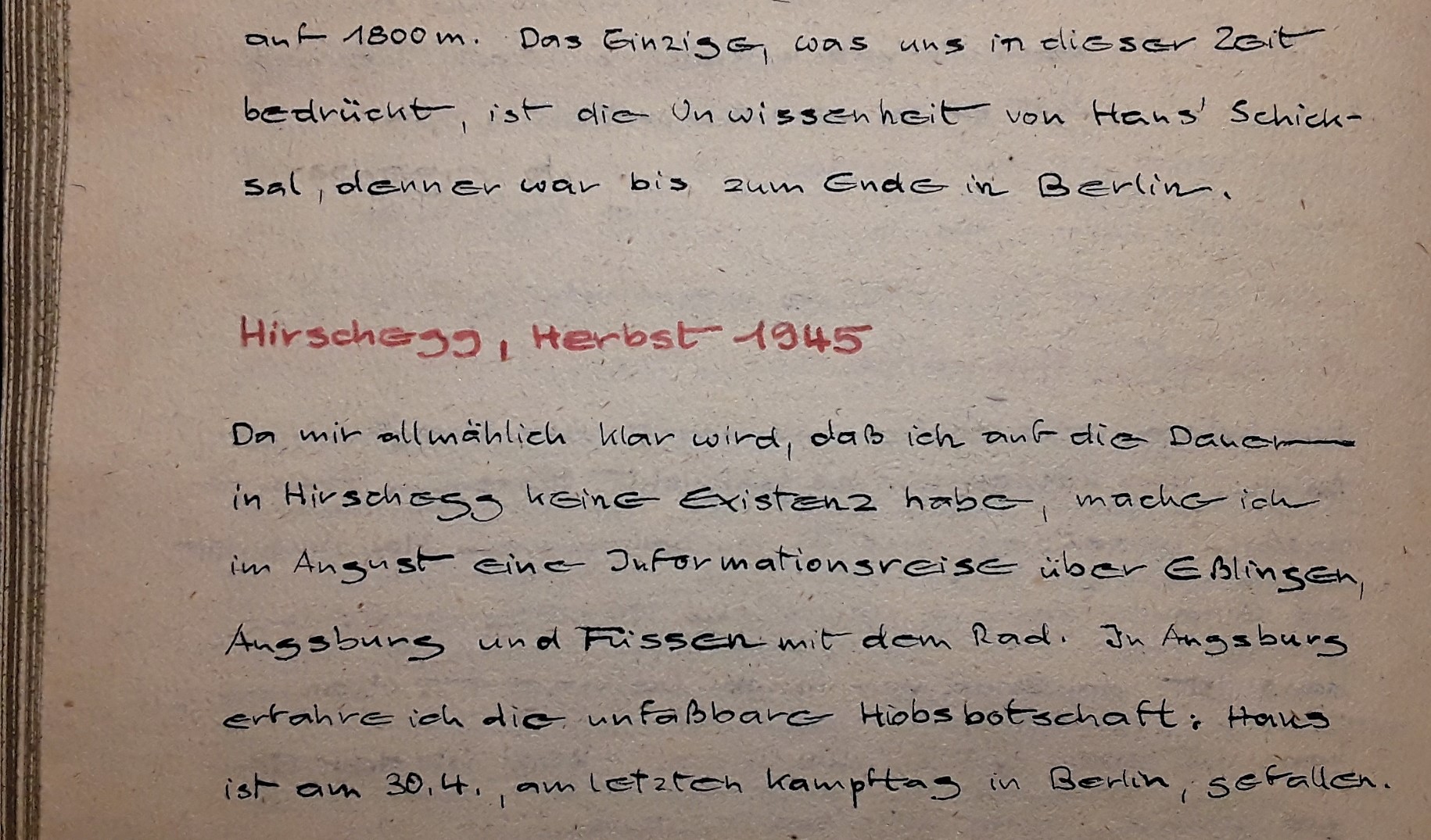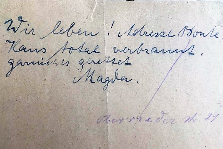 Gottfried Grandels bereits 1944 in Augsburg ausgebombte 2. Ehefrau Helene Grandel, geb. Willner, erfährt zum Kriegsende noch einen weiteren Schicksalsschlag. In einem Rückblick zu ihrem erstgeborenen Sohn notiert sie: