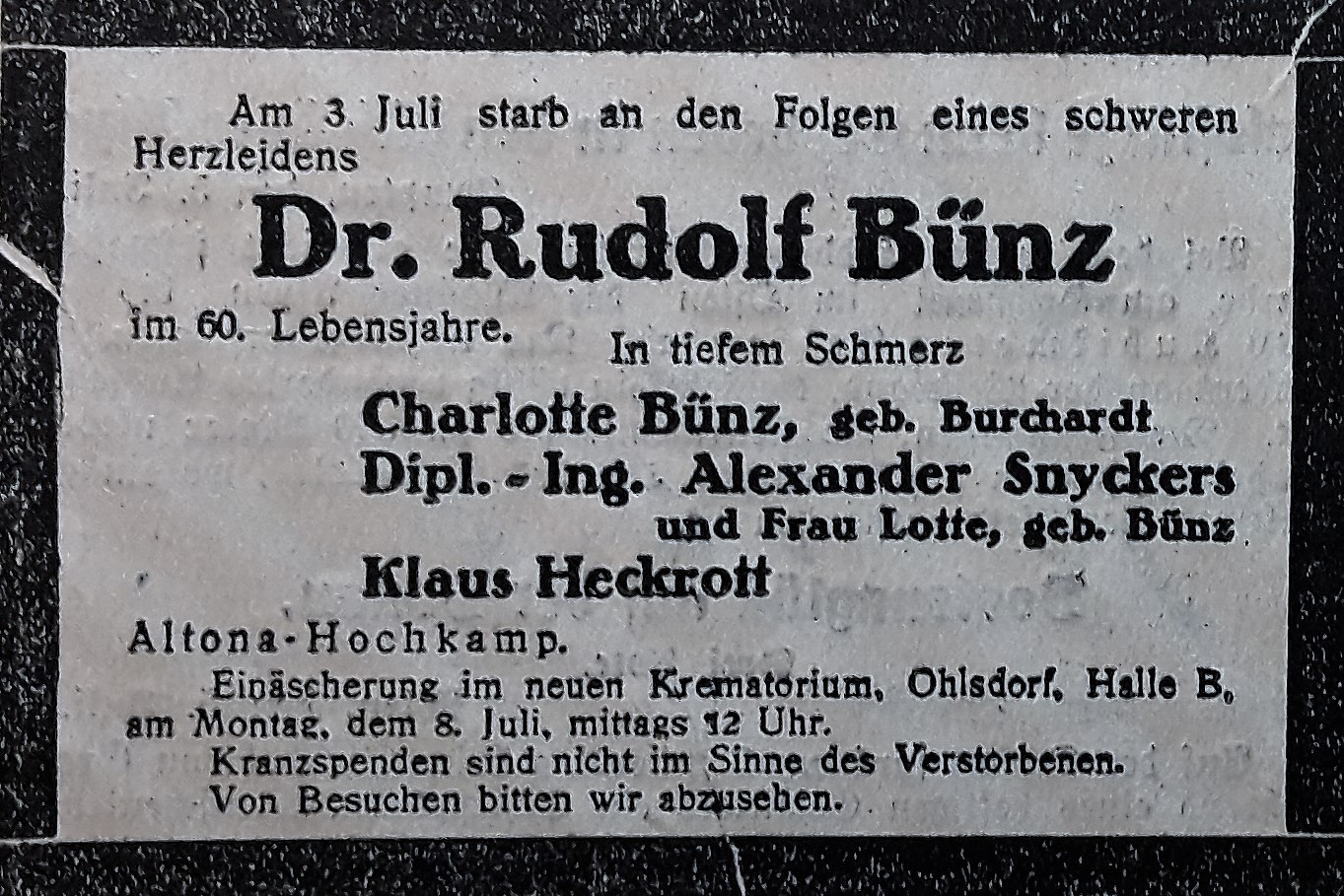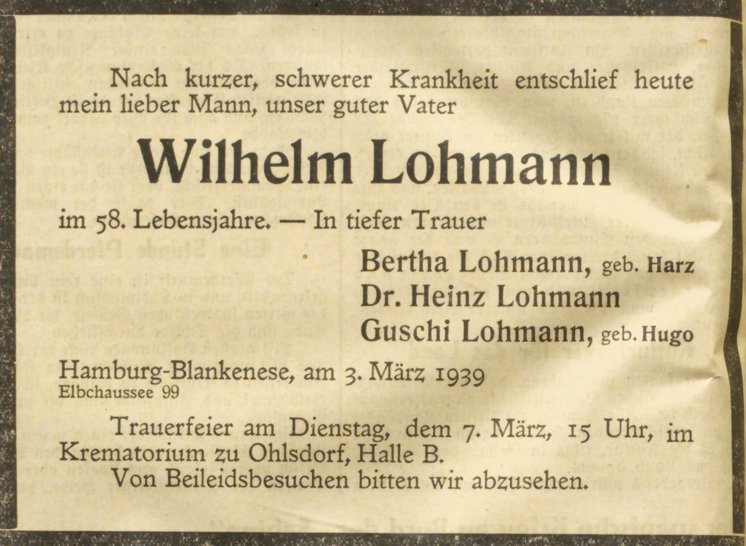 In den letzten Kriegswirren erreicht ihn von seiner geschiedenen Frau Helene die Nachricht vom Freitod seiner zweiten Tochter. In einer kurzen Antwort schreibt er: