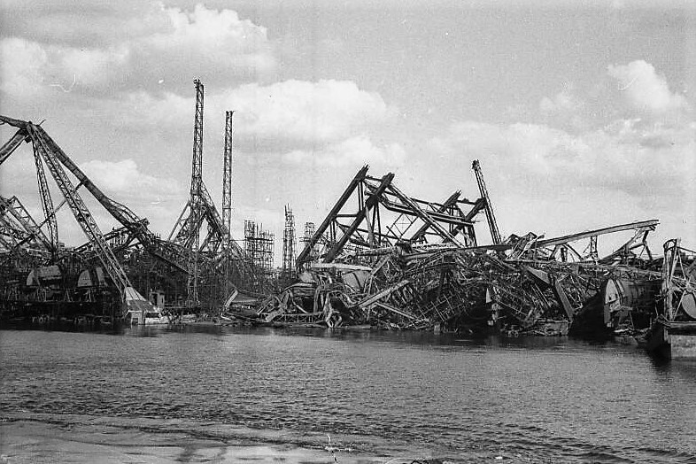 Umsetzung des Führerbefehls durch die SS: Heidelberg nach der nächtlichen Brückensprengung vom 19. März 1945 (Wikimedia Commons - Datei: Heidelberg Alte Brücke 1945.jpg / o.Ang., Mitglied der 101st US-Cavalry)