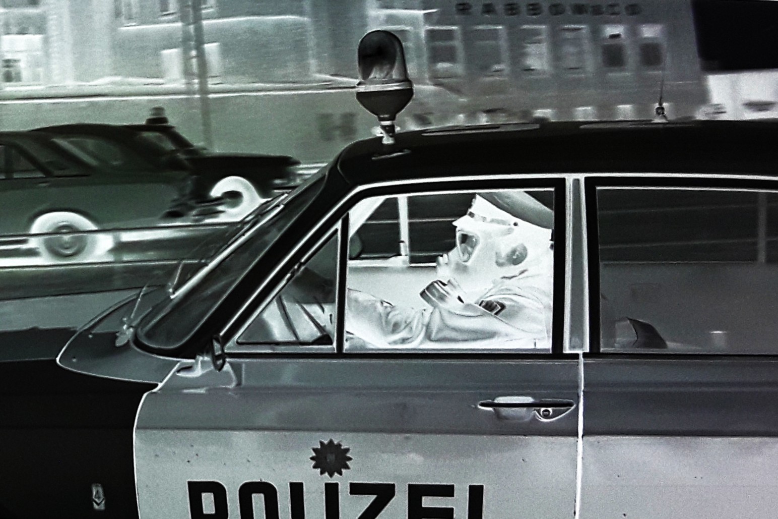 Giftgasalarm am Ellerholzdamm 50 in Hamburg: Einsatzleitung mit Gasmaske - 1974 (Staatsarchiv Hamburg: 720-1/388-00, 80341+Dia Nr.2562, Dia-Streifen lfd. Nr.11 / Bildagentur CONTI-PRESS, Walloch)