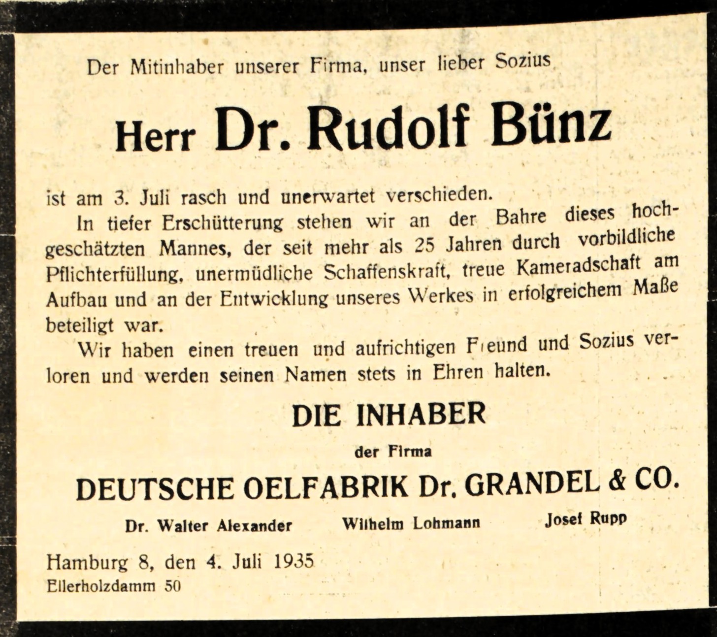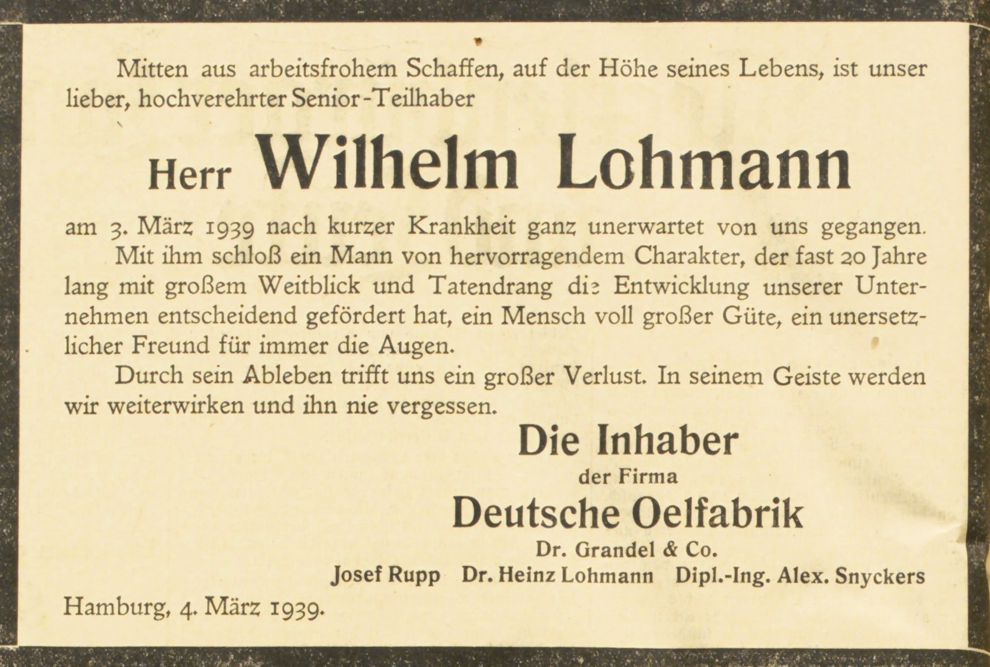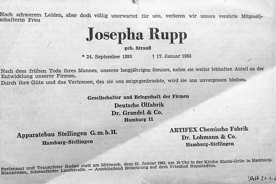 "So schwer der Wiederaufbau aber auch war und so harte Arbeit er kostet: es geht vorwärts! Im Winter 1945 hätte wohl vom ältesten Teilhaber bis zum jüngsten Mitarbeiter keiner zu hoffen gewagt, daß die Deutsche Oelfabrik wenige Jahre später ihr 50jähriges Bestehen feierlich begehen könnte als ein wieder intakter, ausgelasteter Betrieb, der seine alte Stellung im Inland zurückgewonnen hat und auch auf fremden Märkten wieder konkurrenzfähig auftritt. Ein entscheidendes Verdienst an diesem Werk der Gesundung nach der dritten und schwersten - und hoffentlich letzten - Krise hat sich J. Rupp erworben. Umso trauriger ist es, daß nun auch er, am 19. August 1952, im Alter von kaum 58 Jahren durch einen plötzlichen Tod aus der Arbeit gerissen wurde. Er durfte - ähnlich wie Dr. Bünz und W. Lohmann nach der Krise der 30er Jahre - erleben, daß sein und seiner Mitarbeiter Mühen um den Wiederaufbau erfolgreich war. Aber den Zustand nach der Gesundung konnte er so wenig auskosten wie seine Vorgänger. An seinen Platz ist nun sein Schwiegersohn, Nikolai Naeve, getreten, der schon seit 1. April 1948 als Prokurist im Unternehmen tätig ist." (Jubiläums-Festschrift: "50 Jahre DOG", S.15 - 1952)