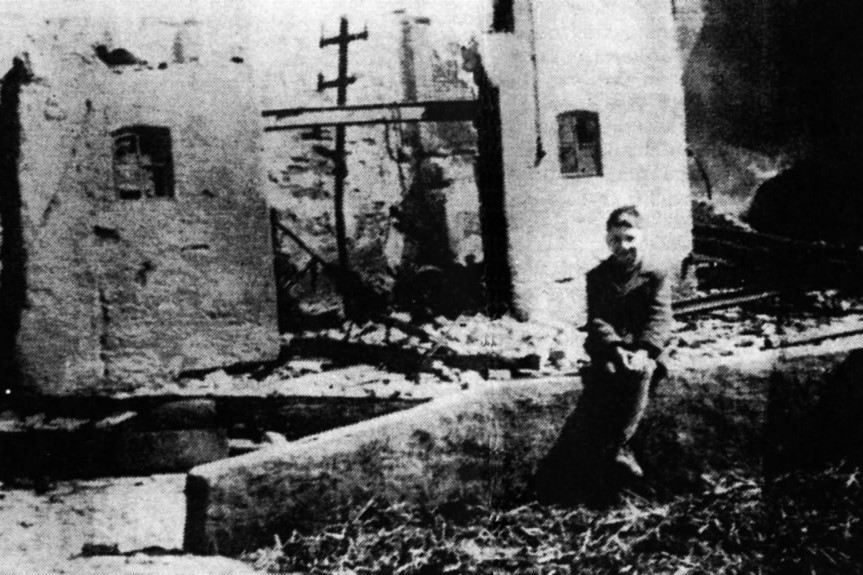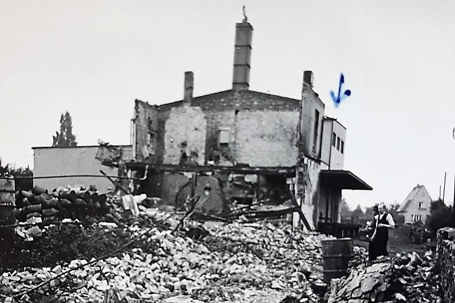 Wilhelm Grandel vor den abgebrannten Scheune seines Großvaters Friedrich Grandel - 28. April 1945 (Fotografie im Privatbesitz + Donau Zeitung: "Als ein Inferno über Gundelfingen, Bächingen und Medlingen hereinbrach" v. 27.4.2020 + ffw-baechingen.de: "Vier Tote, 32 abgebrannte Gebäude in Bächingen" - 28.4.2015)