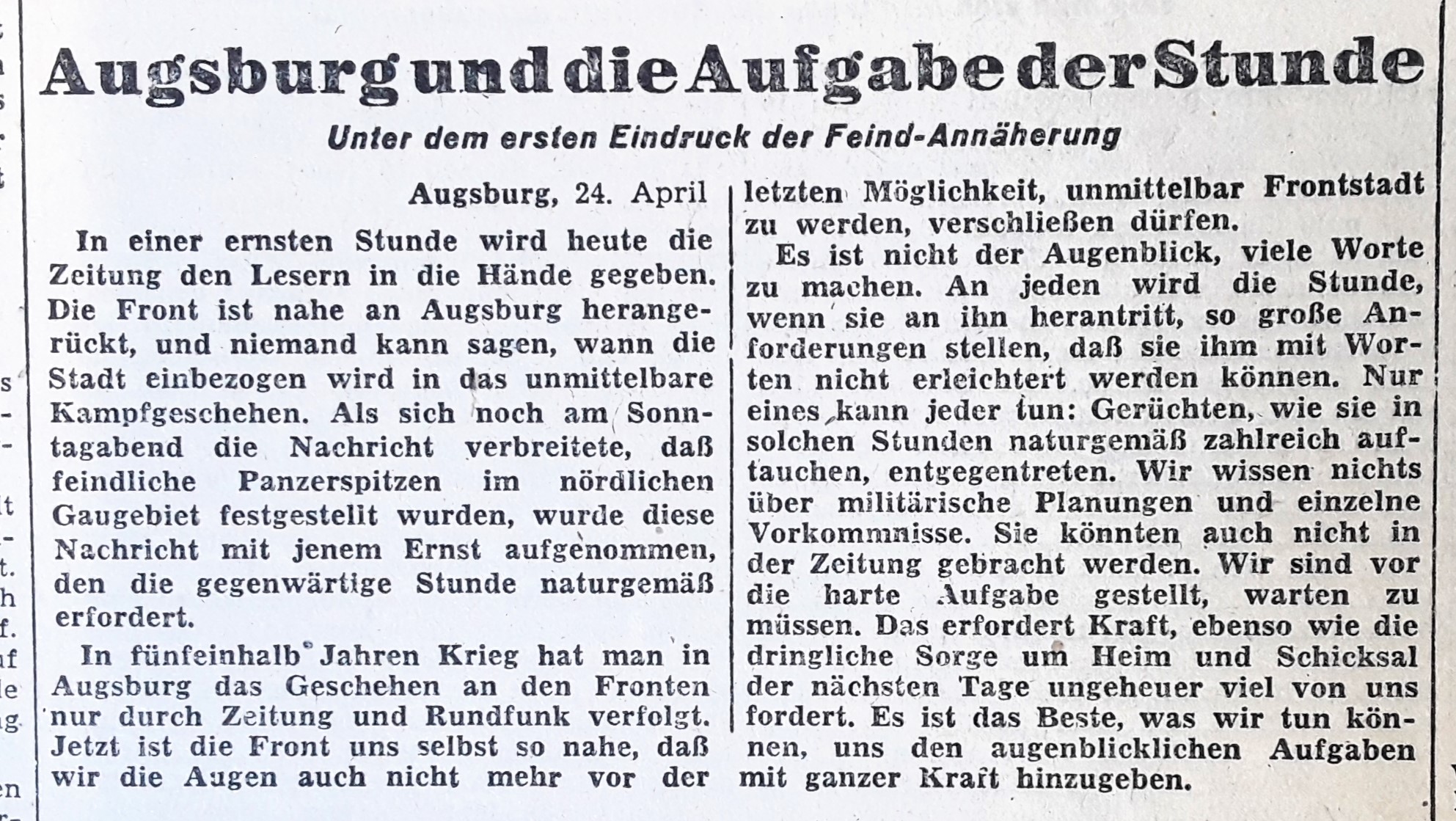 "Unmittelbar Frontstadt": Letzter Artikel vor dem Zusammenbruch - 24. April 1945 (Staats- u. Stadtbibliothek Augsburg: Augsburger National-Zeitung, Nr.95, S.1 v. 24.4.1945)