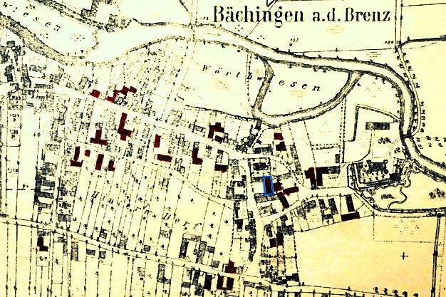Bächingen: In Brand geschossene Gebäude nach dem amerikanischen Fliegerangriff - 24.04.1945 (Historischer Lageplan auf ffw-baechingen.de: "Vier Tote, 32 abgebrannte Gebäude in Bächingen" - 28.4.2015)