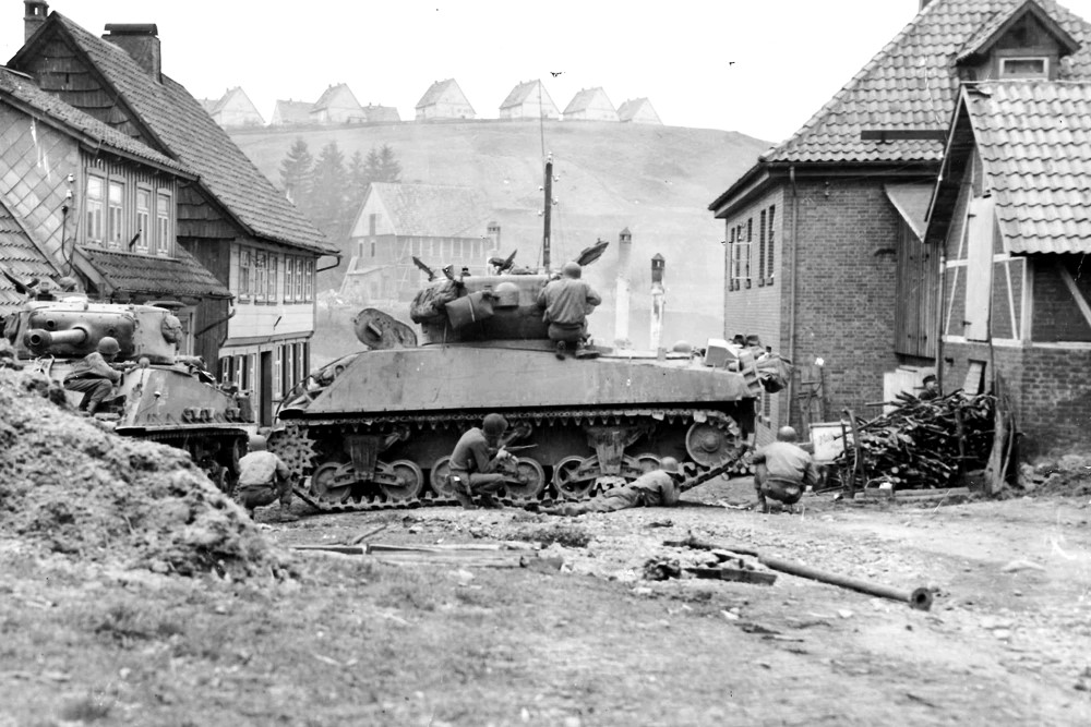 Unterdessen kämpft sich die amerikanische Infanterie weiter durch die deutschen Städte. Wo Ihnen noch militärischer Widerstand entgegenschlägt, wird er gebrochen.