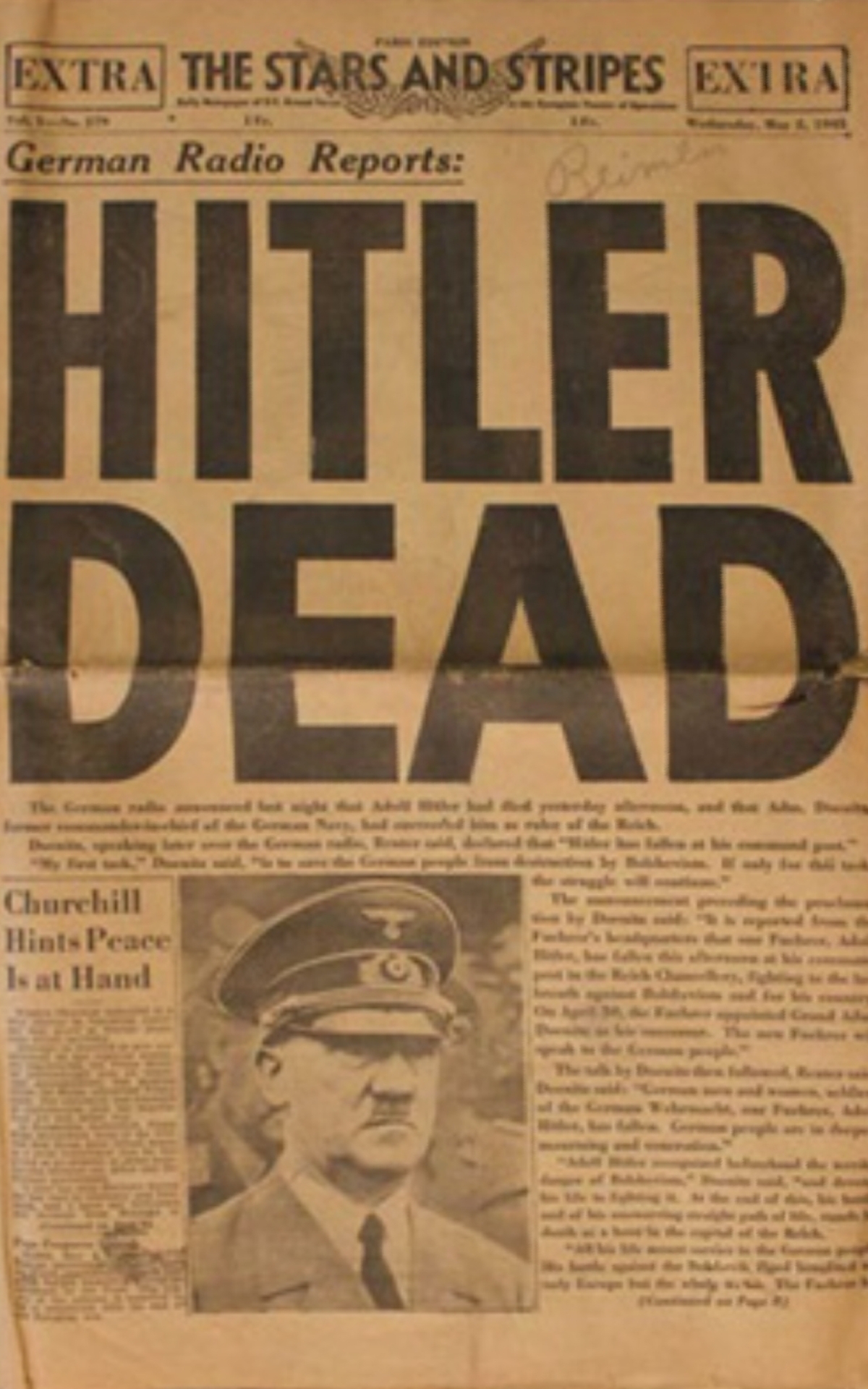 Ende eines weltgeschichtlichen Wahnsinns: Selbstmord im Führerbunker - 30. April 1945 (Wikimedia Commons / US-Army - Datei: Stars & Stripes & Hitler Dead2.jpg - Ausgabe v. 2.5.1945)