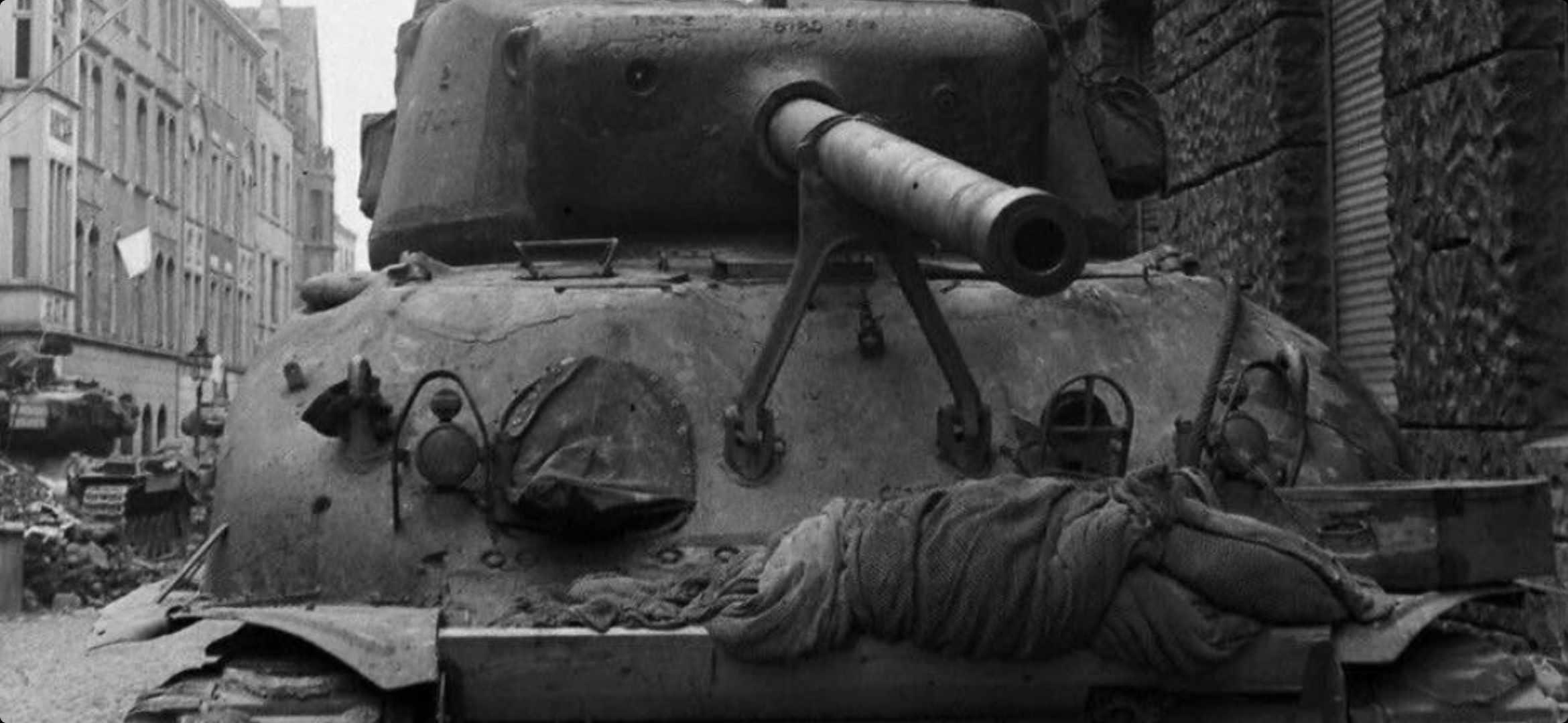 Weiße Fahnen an den Fenstern: Amerikanische Sherman-Panzer beim Einrücken in die Stadtgebiete - April 1945 (Fotografie im Privatbesitz)